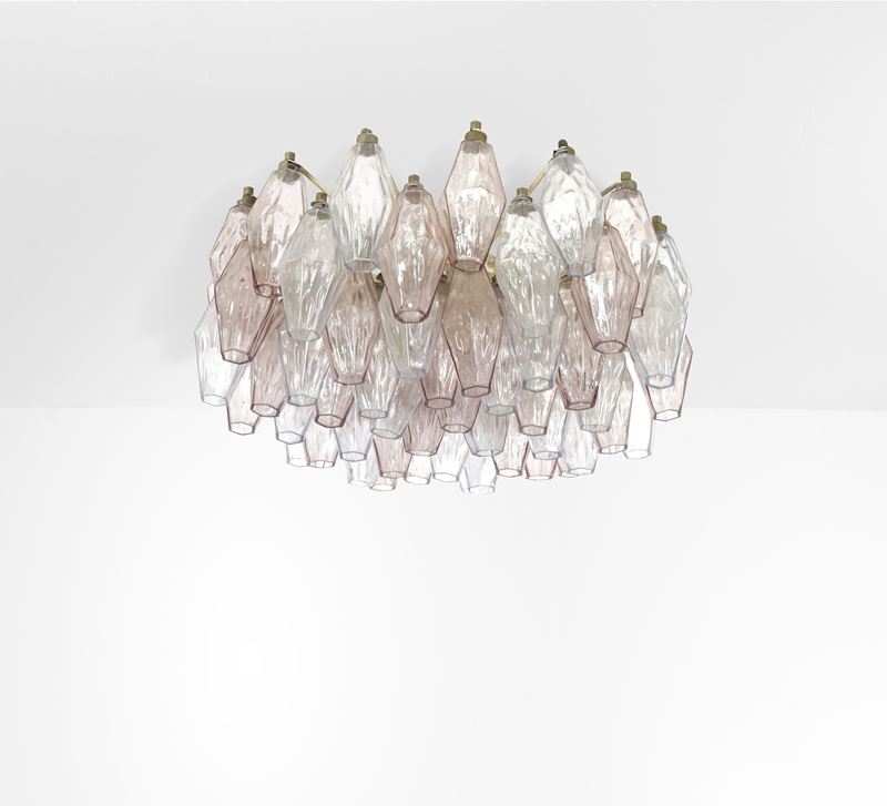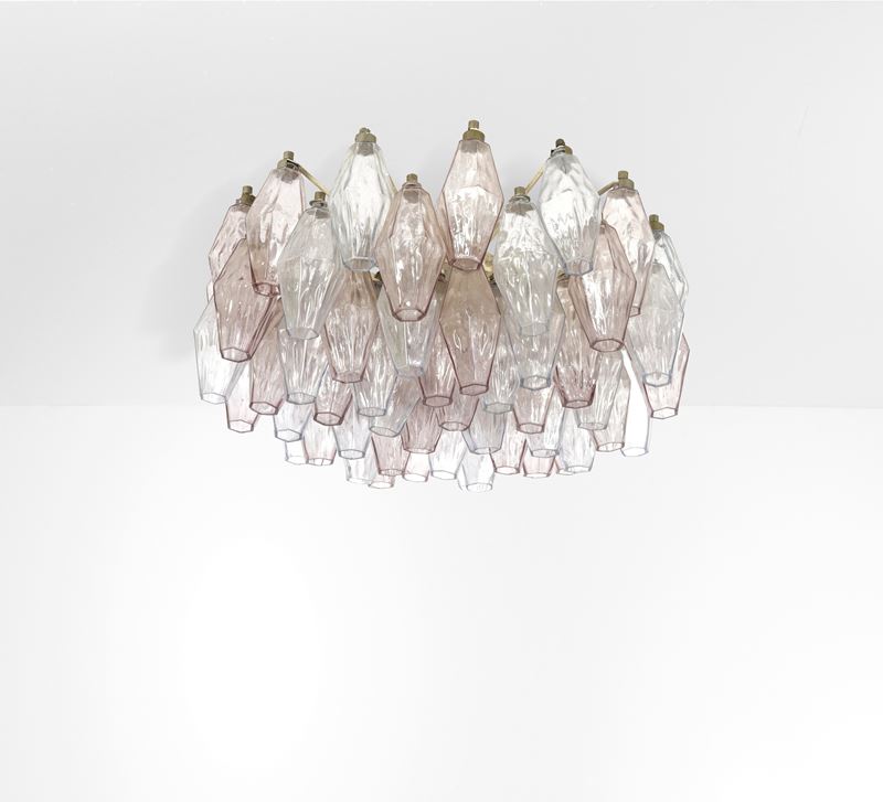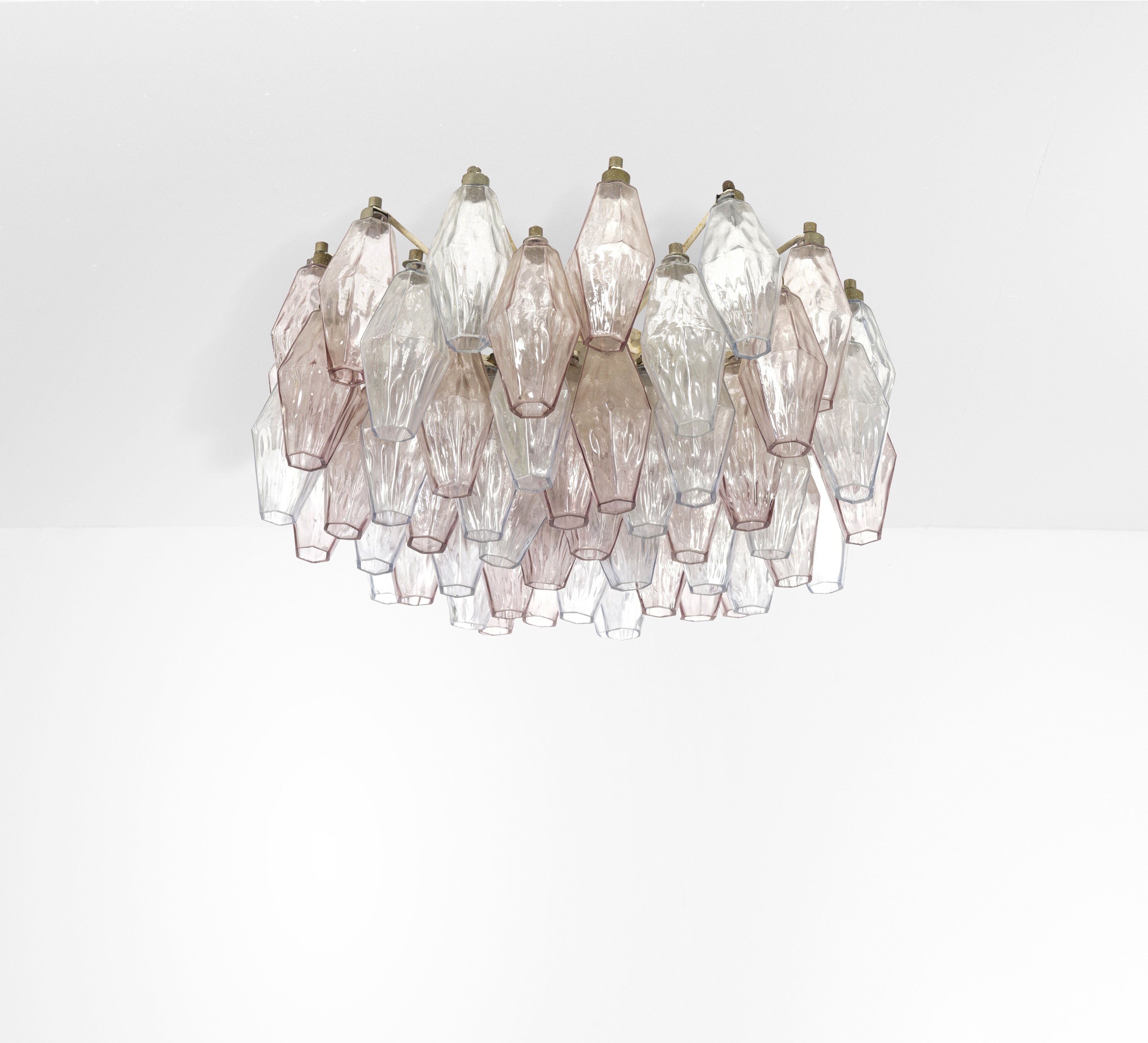 Struttura in metallo nichelato. Elementi diffusori in vetro di Murano della serie Poliedri.