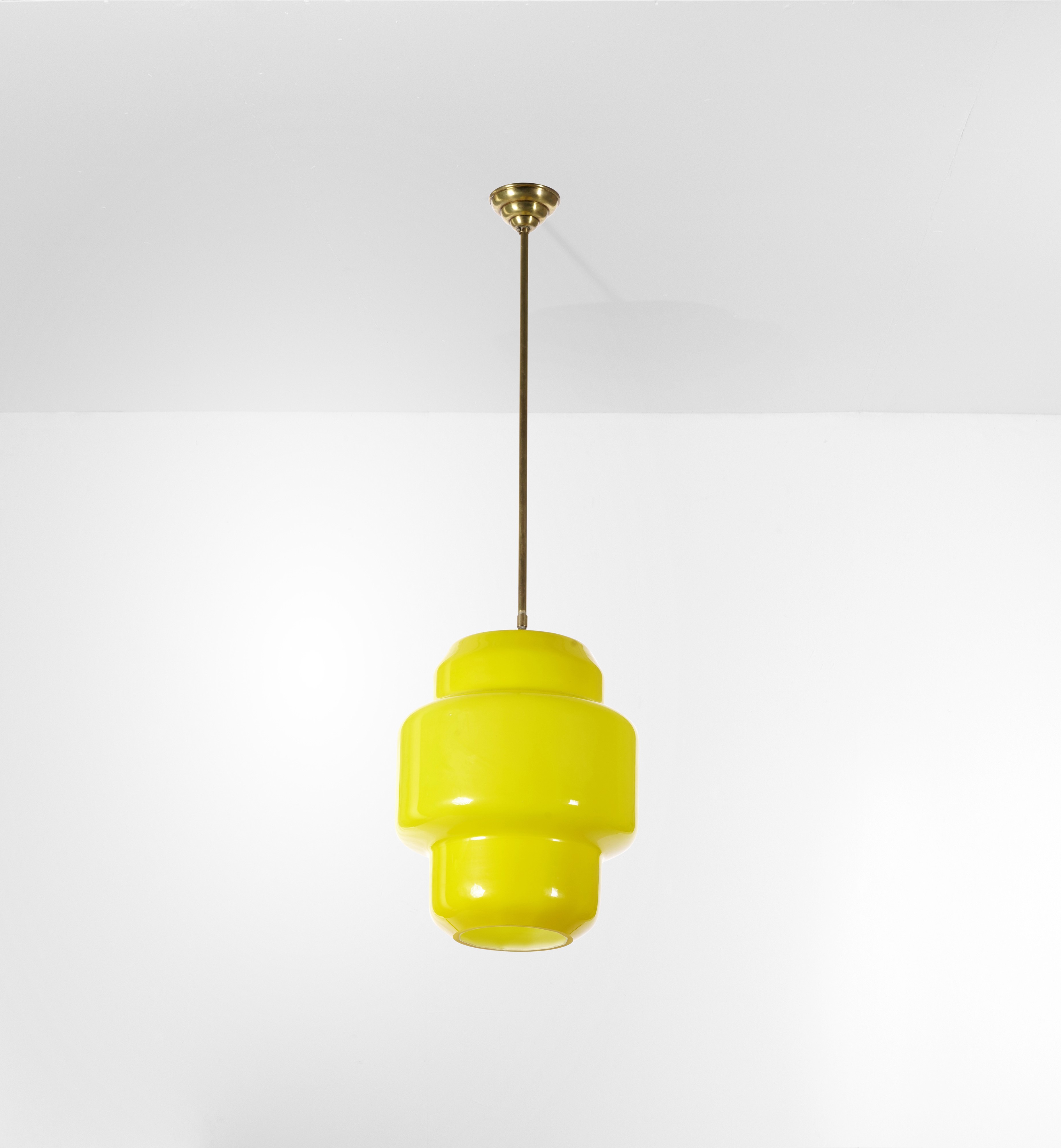 Struttura in ottone e diffusore in vetro incamiciato colorato.