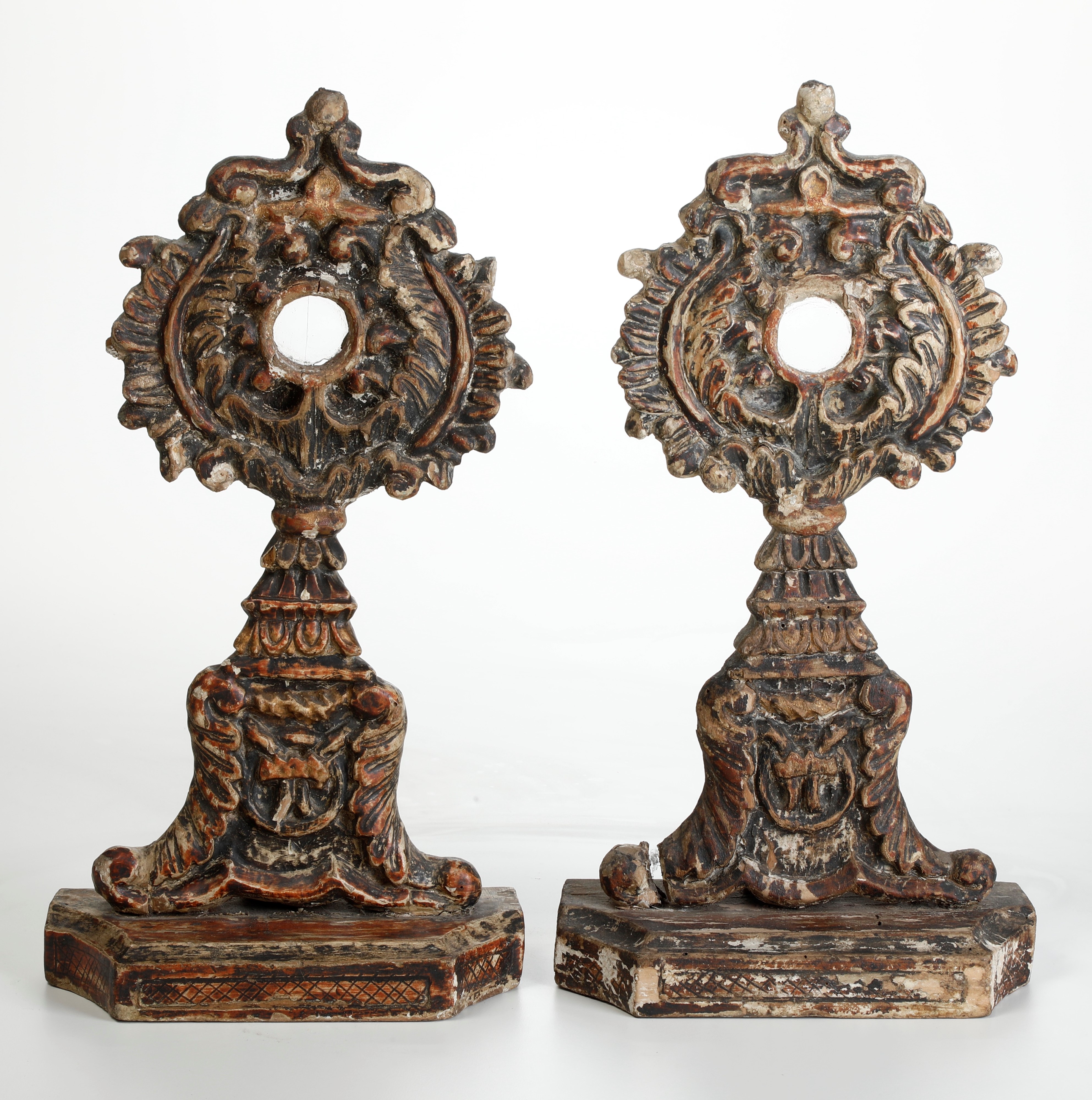 Coppia di reliquiari in legno scolpito e laccato. XVIII secolo