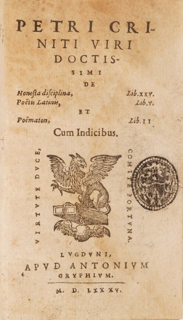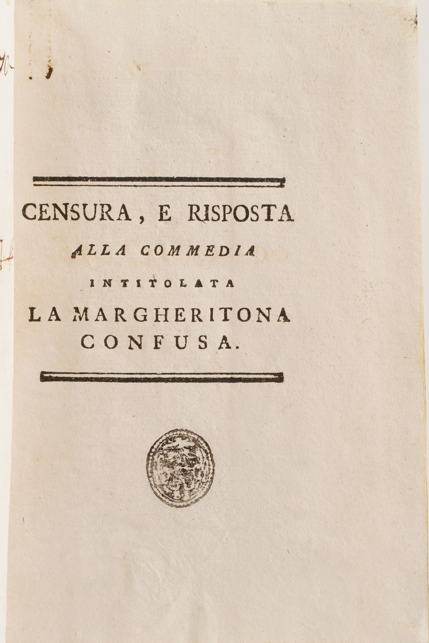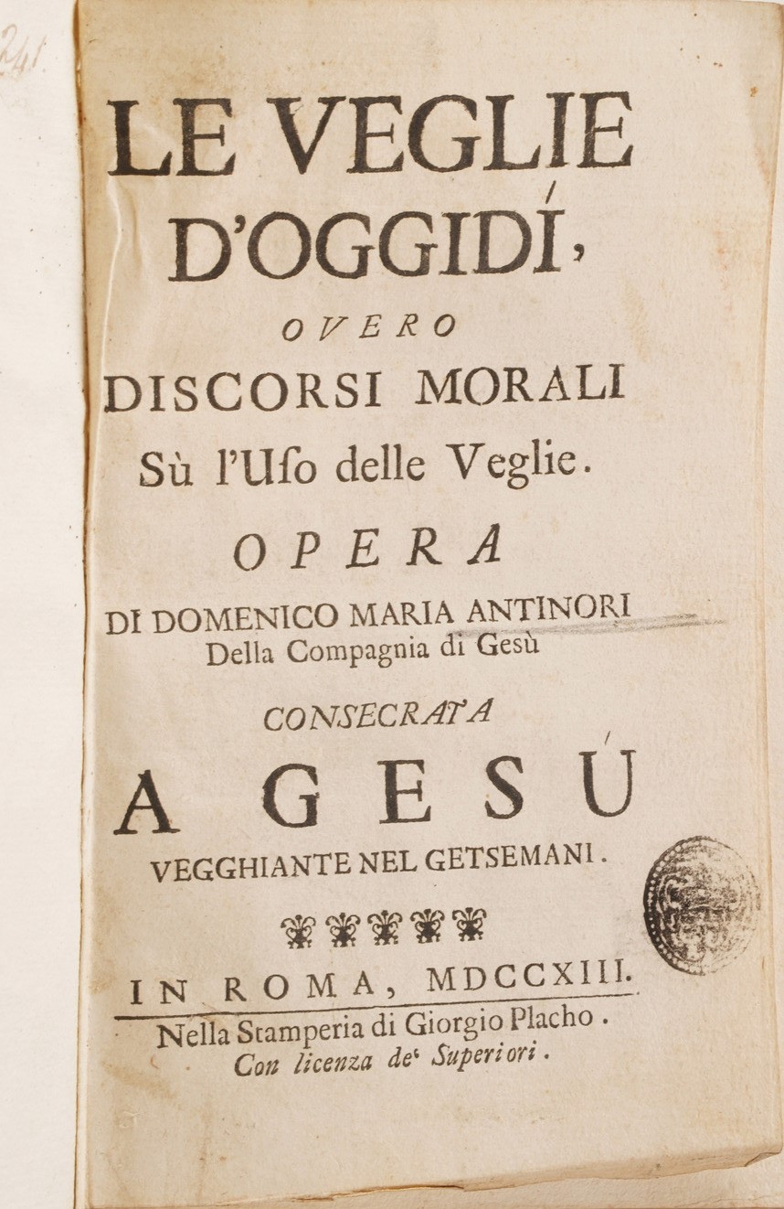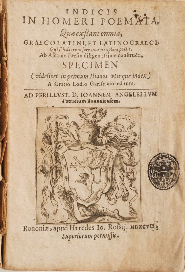 Si aggiungono al lotto: Censura e risposta alla Commedia intitolata La Margheritona confusa;Elegia D’Andromaco il vecchio sopra da Tiriaca ... F. Tomaso Siglian, Napoli 1645; Commedias de Terence ... Lyon 1670; Discorsi Accademici Del Conte Pietro Bonarelli Della Rovere; Le Veglie D’Oggidì overo discorsi morali sull’uso delle veglie, Domenico Maria Antinori, Roma 1713; Deipus Roning Don Ehebe Ein Erauerfpielle, 1759; Petri Criniti Viri Doctis, Lugduni 1590; Aforismi Hierogliphici ... Lipzia 1592; Discorso intorno ai contrasti che si fanno sopra la Gerusalemme Liberata di Torquato Tasso del Sig Orazio Lombardelli, Ferrara 1586; Indicis in Homeri Poemata ... 1597; Reponse De M.L’Archeveque Duc De Cambray; Dan. Heinsii De Tragerie Constituthione