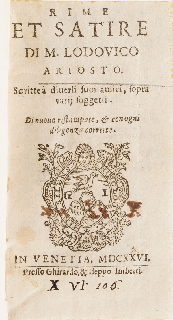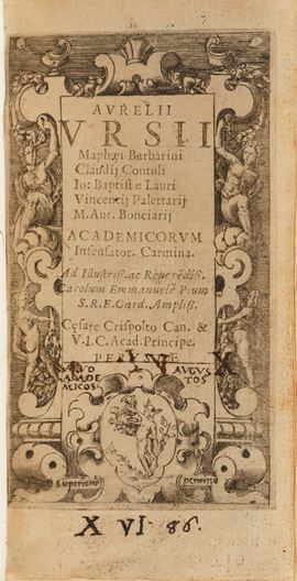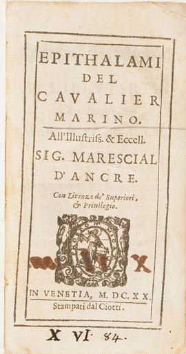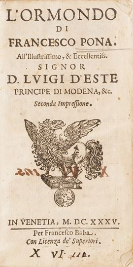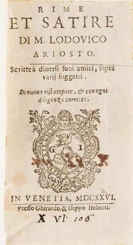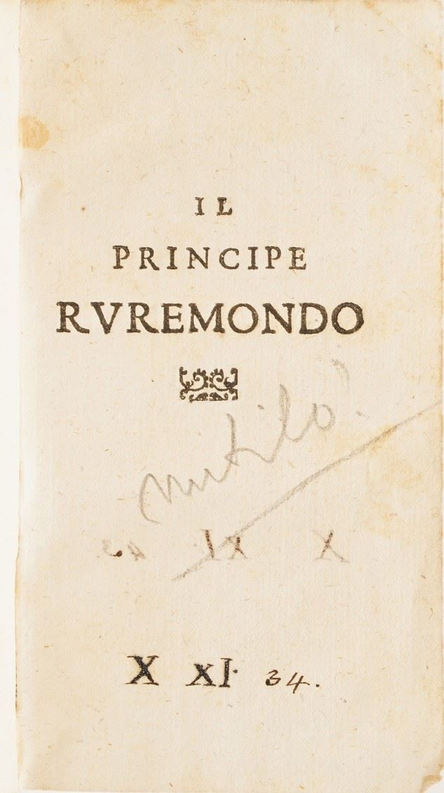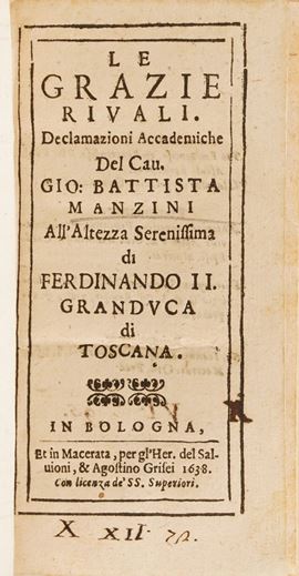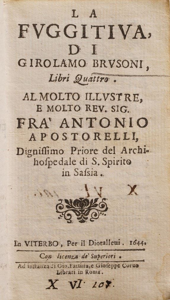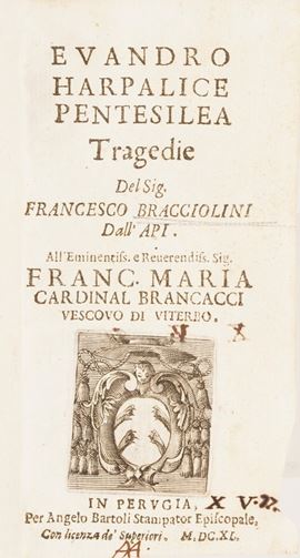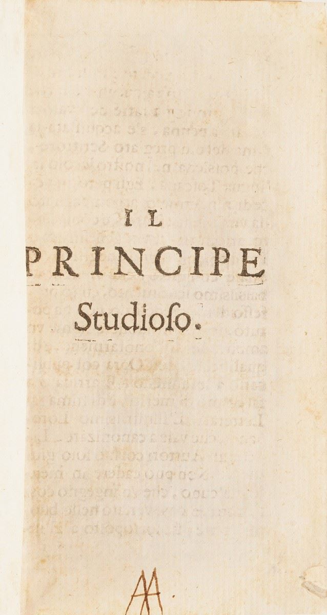 Si aggiungono al lotto: Aurelii Ursii, Academicorum; Rime et satire di M. Lodovico Ariosto scritte a diversi suoi amici..In Venezia 1626; Eutragi Doxe Comedie; Il principe Ruremondo; Elisa overo l’innocenza colpevole, Historia tragica del vescovo di Bellay, Roma 1635; Evandro Harpalice pentesilea tragedie del sig. Francesco Bracciolini, In Perugia 1611; L’Ormondo di Francesco Pona, Venezia 1635; Le Grazie rivali, Giò Battista Manzini, Bologna 1638; La fuggitiva di Gerolamo Brusoni, Viterbo 1644; Epithalami del cavalier Marino, Venezia 1620; Everhardi Wassenberg II commentatorium de bello, Francoforte 1638; Il principe studioso nato ai servigi del serenissimo cosmo, Venezia 1642; Mondo infinito di Bernardo Lellii, Napoli 1682; Poema del sig. Gabriello Chiabrera.