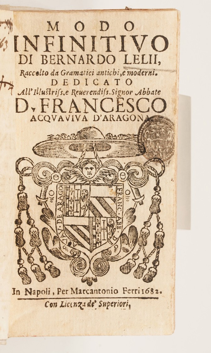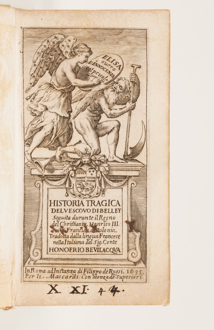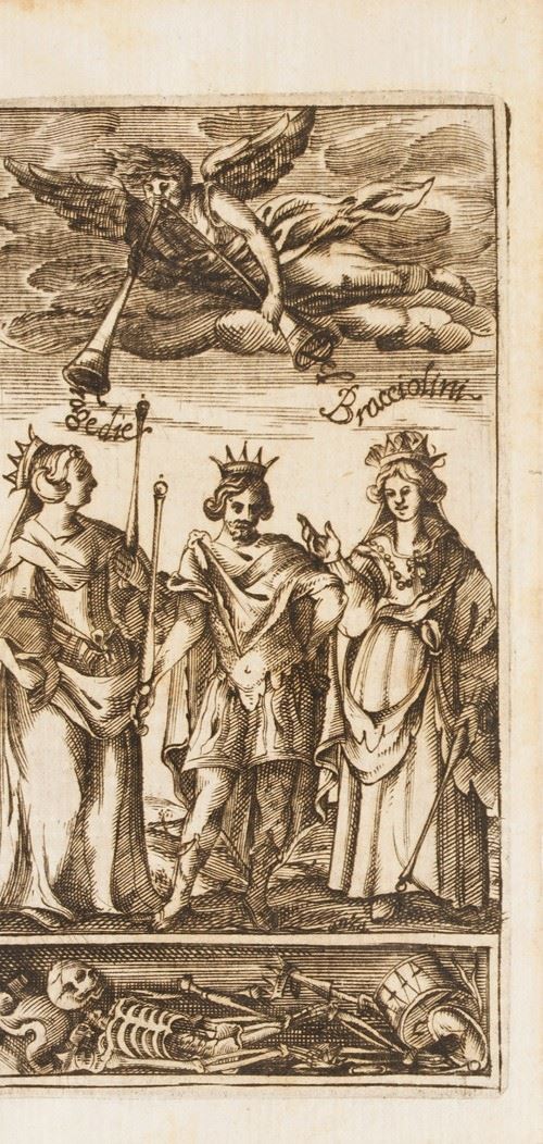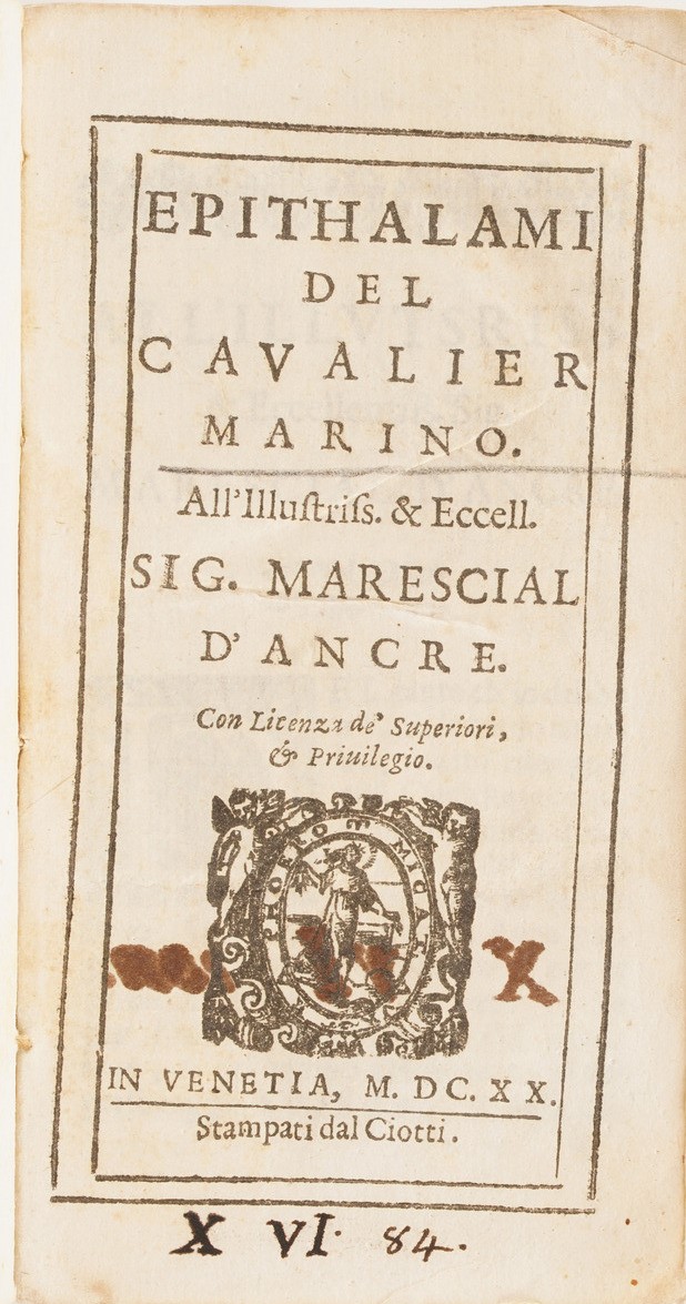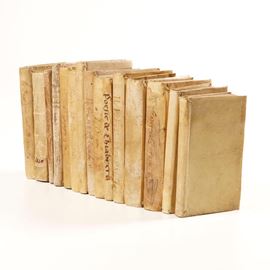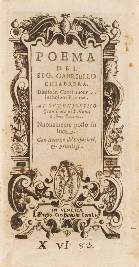 Si aggiungono al lotto: Aurelii Ursii, Academicorum; Rime et satire di M. Lodovico Ariosto scritte a diversi suoi amici..In Venezia 1626; Eutragi Doxe Comedie; Il principe Ruremondo; Elisa overo l’innocenza colpevole, Historia tragica del vescovo di Bellay, Roma 1635; Evandro Harpalice pentesilea tragedie del sig. Francesco Bracciolini, In Perugia 1611; L’Ormondo di Francesco Pona, Venezia 1635; Le Grazie rivali, Giò Battista Manzini, Bologna 1638; La fuggitiva di Gerolamo Brusoni, Viterbo 1644; Epithalami del cavalier Marino, Venezia 1620; Everhardi Wassenberg II commentatorium de bello, Francoforte 1638; Il principe studioso nato ai servigi del serenissimo cosmo, Venezia 1642; Mondo infinito di Bernardo Lellii, Napoli 1682; Poema del sig. Gabriello Chiabrera.