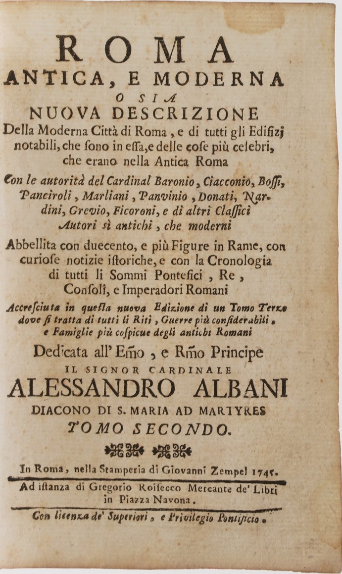 In-8°. Rilegatura coeva in pergamena morbida. Si aggiungono nel lotto: Marco Tulio Cicerone, Orazioni, solo parte terza, Venezia, Paolo manuzio 1554; Roma antica e moderna, In Roma Zempel 1745 e Roisecco 1765. Volumi II e III.