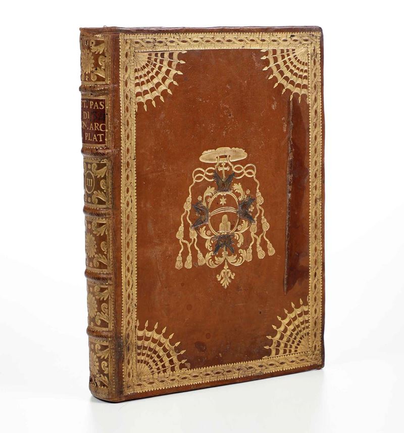 In 4°. Bella rilegatura coeva in marocchino nocciola. Tagli dorati. Decorazioni in oro ai piatti e al dorso. Armi cardinalizie e croce di Malta ai due piatti.