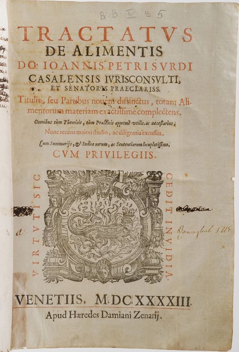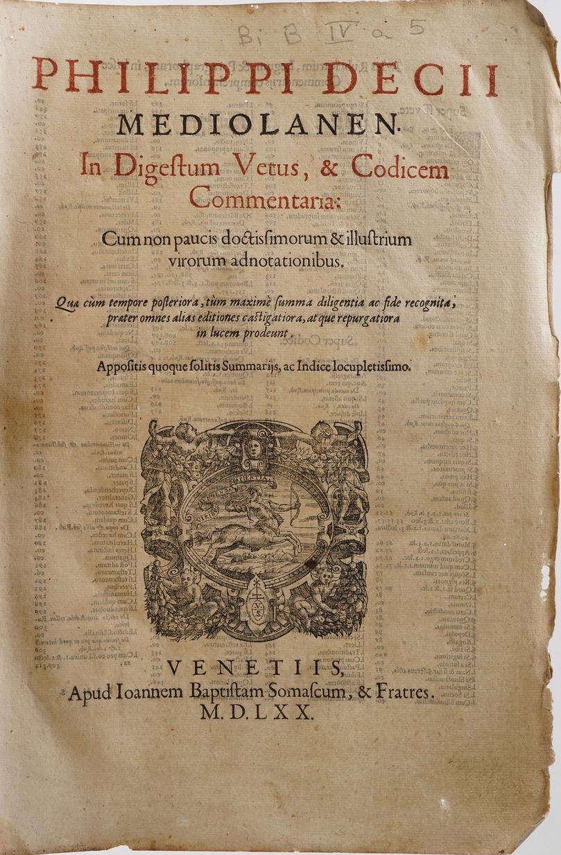 Almerotae Florentinae 1680; Tractatus De Alimentis 1693; Infortiatum sev Pandectarum iuris civilis 1584; Philippi Decii Mediolanen in digestum vetus, codicem commentaria 1570; Digestum vetus sev Pandectarum iuris civilis 1584; Digestum Nouum sev Pandectarum iuris civilis 1584