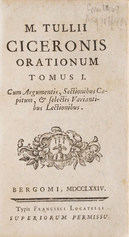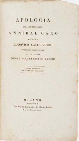 In-8°. Rilegatura coeva in cartone alla rustica. Ritaglio al frotnespizio e all'ultima carta. Si aggiungono nel lotto: Cicerone, Orationum, Bergamo, Locatelli, 1774 (3 volumi); Ugone Blair, Lezioni di Retorica, Napoli, 1814 (3 tomi); Castervetro Lodovico, Apologia del Commendatore Annibal Caro, Tipografia dei Classici, 1820; Marinetti Filippo Tomaso, L'Alcova d'acciaio, Milano, 1927