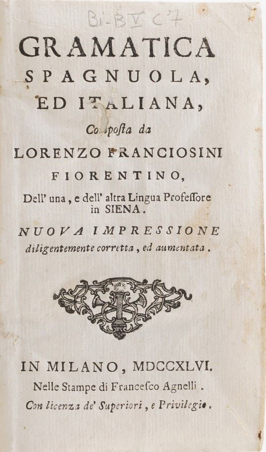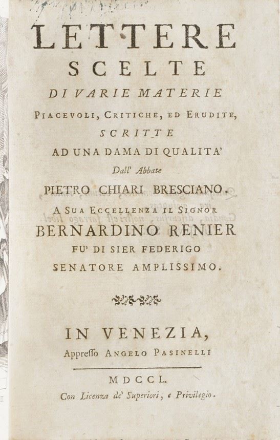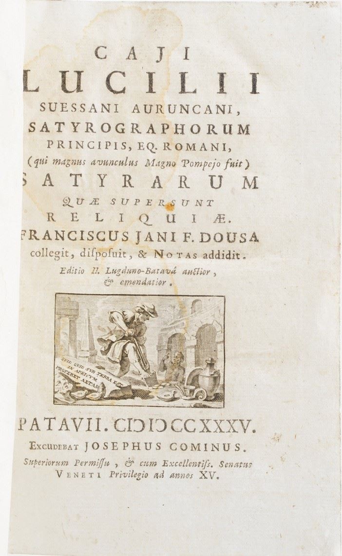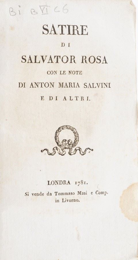 In-8°. Rilegatura coeva in pergamena rigida. Si aggiungono nel lotto: Caji Lucilli...Satyrarum. Padova, Comino,1735;Chiari Pietro. Lettere scelte. Venezi,Pasinelli,1750. Due tomi;Satire di Salvator Rosa...Londra ma Livorno, Masi,1781;Franciosini Lorenzo.Grammatica spagnuola...Milano,Agnelli,1776;Domenico De Angelis. Della Patria d'Ennio.Roma,Monaldi,1701;Elogio di Gessner.Pisa,Dalla nuova tipografia,1798.