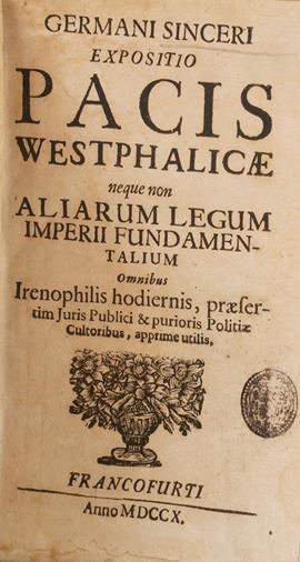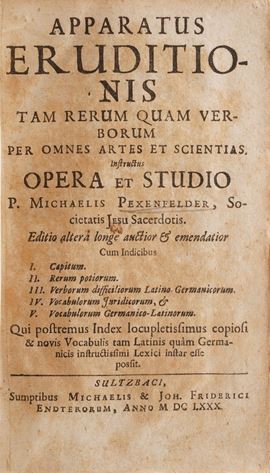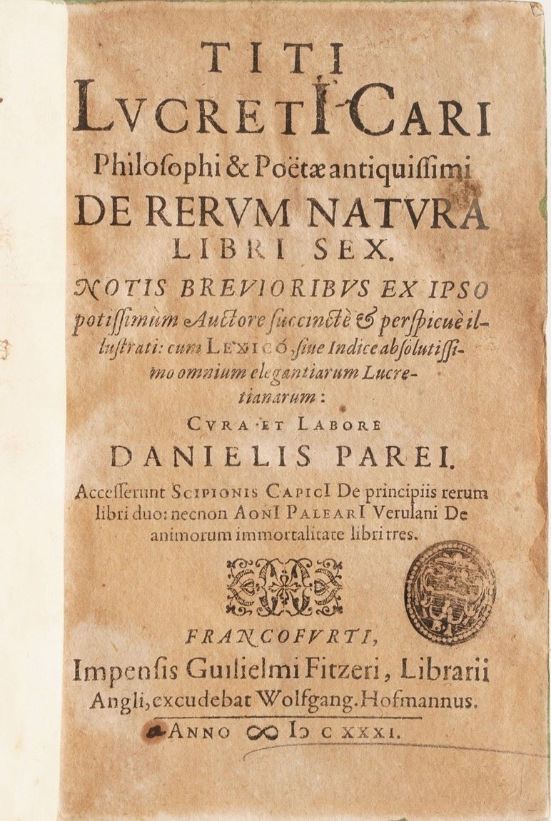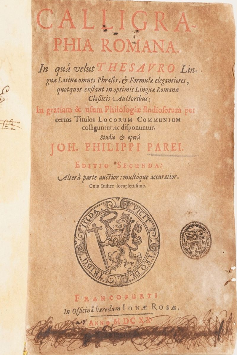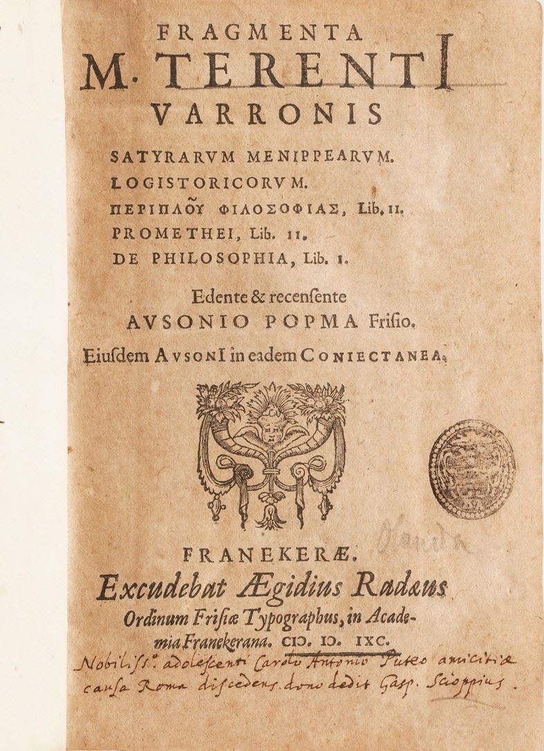 Si aggiungono al lotto: Titi Lucreti Cari ... De Rerum Natura, Francoforte; Fragmenta M. Terenti Varronis Satyrarum Menippearum, Franecherae; Annales Cor Taciti Liber Commentarius; L’Histoire Del Faits Et De La Vie De Henry Le Grand Roy De France & De Navarre, A Paris, 1613; Germani Sinceri Expositio Pacis Wesstphalicae ... Francoforte, 1710;Calligraphia Romana ... Joh. Philippi Parei, Francoforte, 1620; Apparatus Eruditionis ... P. Michaelis Pexenfelder, Sultsbaci, 1680