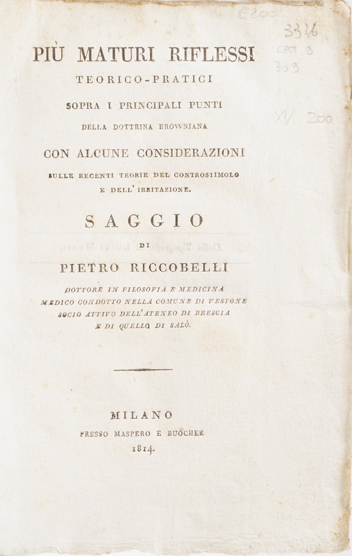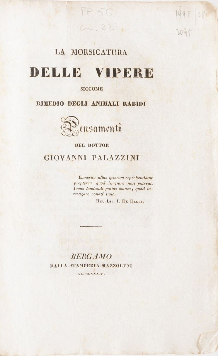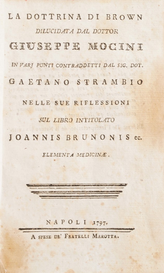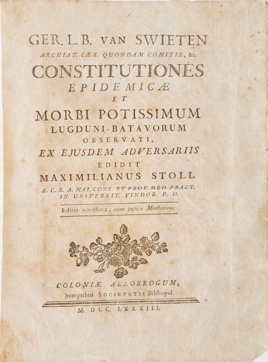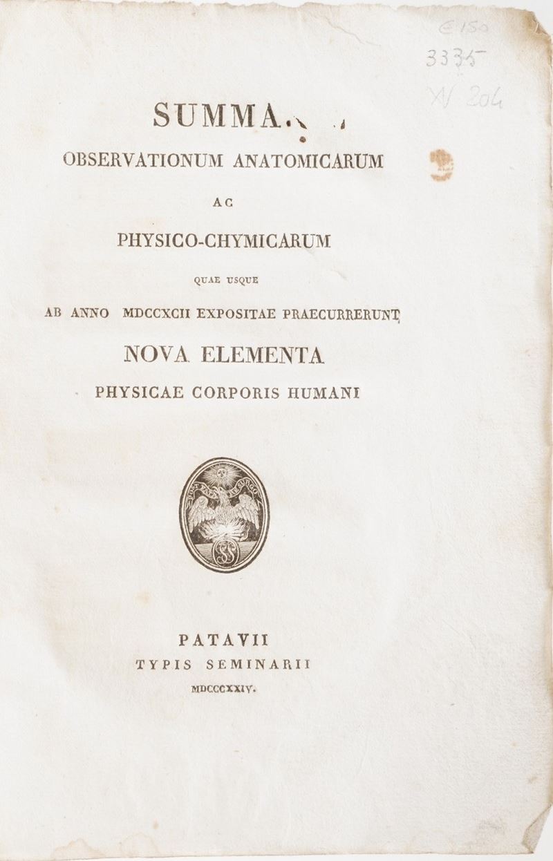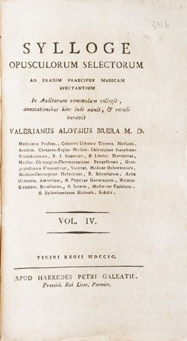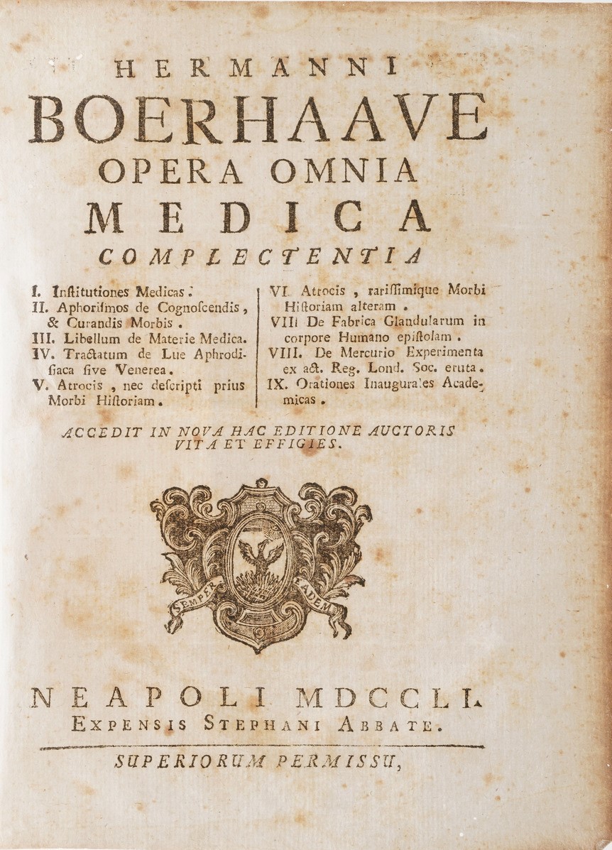 In-4°. Rilegatura coeva in piena pergamena. Si aggiungono nel lotto: Hermanni Behaave, Opera Omnia Medica, Napoli, Abbate, 1751; Junckerius Joannes, Conspectus Chirurgiae...Halae, 1731; Van Swieten, Cosnsitutiones epidemicae, Coloniae, 1783; Thomae Sydenham... Opera medica, venezia, ex tipografia remondiniana, 1772; Palazzini Giovanni, La morsicatura delle vipere, Bergamo, 1834; Summa observationum anatomicarum, Padova 1824; Riccobelli, più maturi riflessi... Milano, Maspero 1814; Valerianus Aloisius brera, Opuscolorum Selectorum, Eredi Galeati 1799; Weikard, Prospetto di un sistema più semplice di medicina... volumi I e II, Venezia 1796; Mocini Giuseppe, La dottrina di Brown... Napoli, 1797