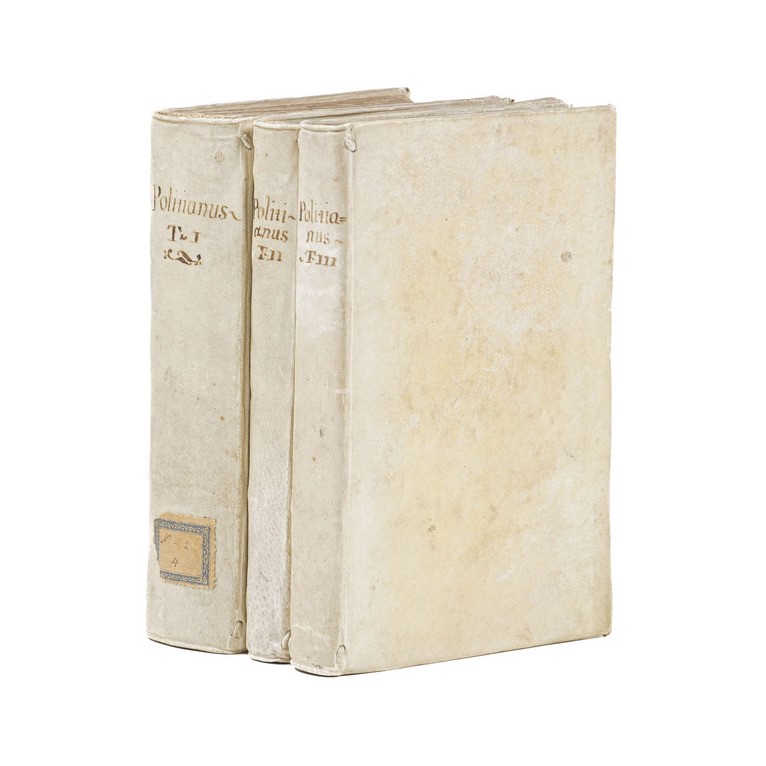 In-16°. Tre volumetti. Rilegature in piena pergamena rigida del secolo XIX. Mancanza di porzione di carta ai tomi I° e II°, al piede dei due frontespizi.