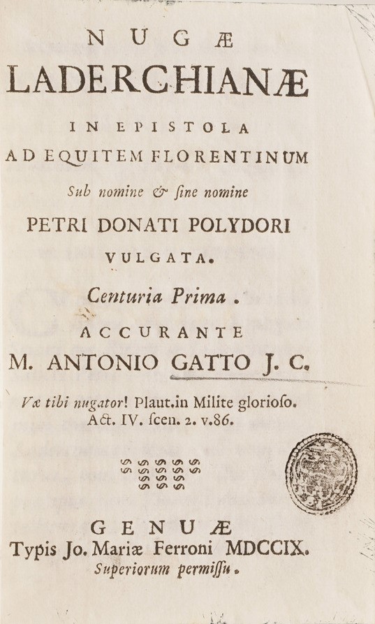 Nugae Laderchiane in epistola ad equitem florentium, Genuae, 1709; Lettere sopra diversi di controversia, Venezia, 1752; Idee generale de la nouvelle constitution, 1713; Colloquiorum familiarum des Erasmo Rot., Lugduni, 1550; Rodolphi Goclenii philosophici, 1596; Introductionis ad artem rethoricam libri duo, Florentiae; Istitutiorum peripateticarum, Lugduni; Questionis decides, A Paris, 1644; Emmanuelis stupani philos, Basilea, 1615; Philosophia vetus et nova ad usum scholae, Parigi, 1680;