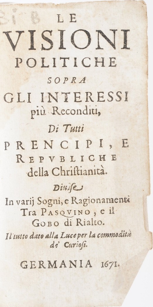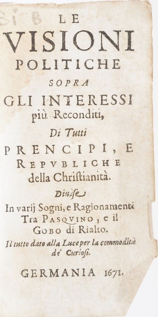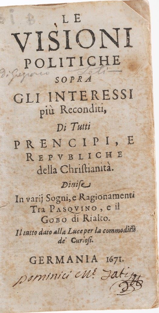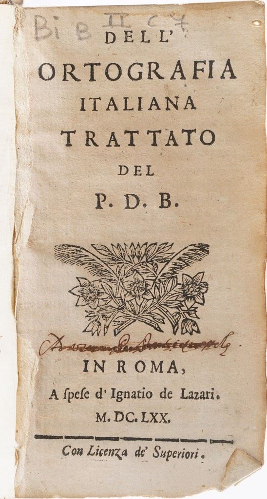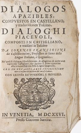 In-12°. Rilegatura coeva in pergamena rigida. Bella antiporta allegorica. Si uniscono nel lotto: Stigliani Tomaso. Arte del verso italiano...Bologna,Longhi,1693;Dell'ortografia italiana.Trattato del P.D.B.Roma,Ignatio de Lazari,1670;Sennertis Danielis. Epitome Naturalis Scientiae.Amsterdam,1651;Le visioni politiche sopra gli interessi più reconditi...Germania,1671.(Due copie);Franciosini Lorenzo. Dialoghi piacevoli tradotti in Toscano dal Castigliano...Venezia,Sarzina,1626.