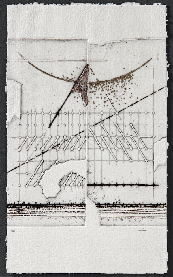 es. V/X dimensioni lastra: cm 48,6x27,5 firmato in basso a destra, numerato in basso a sinistra carta Alcantara, Sicras tiratura 27+X+ 5 p.a. stampatore G. Serafini, Pesaro ed. Della Pergola, Pesaro
