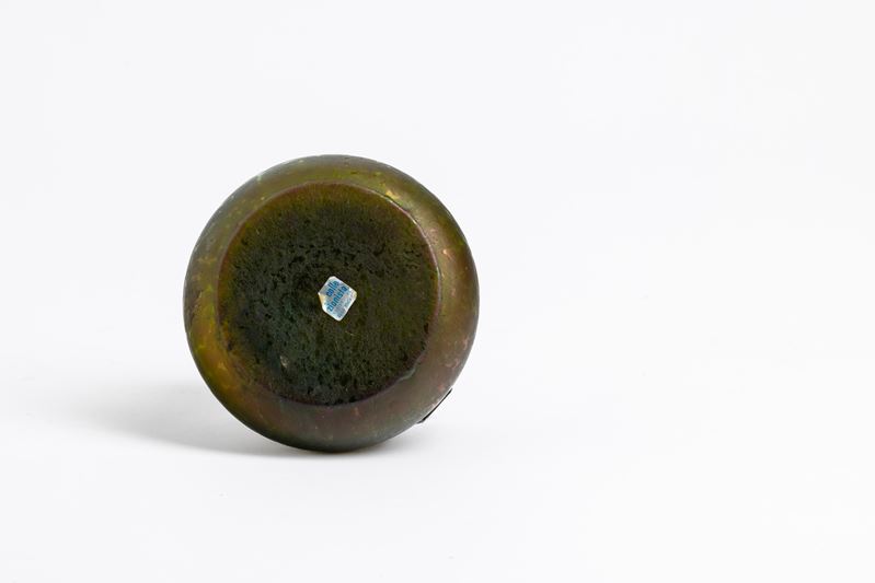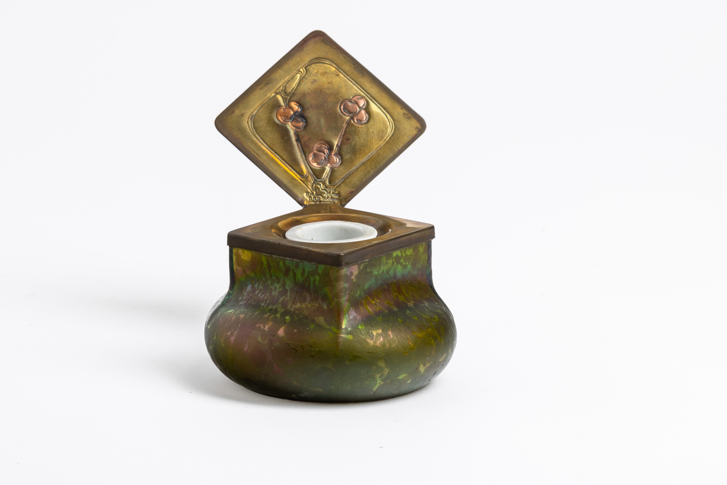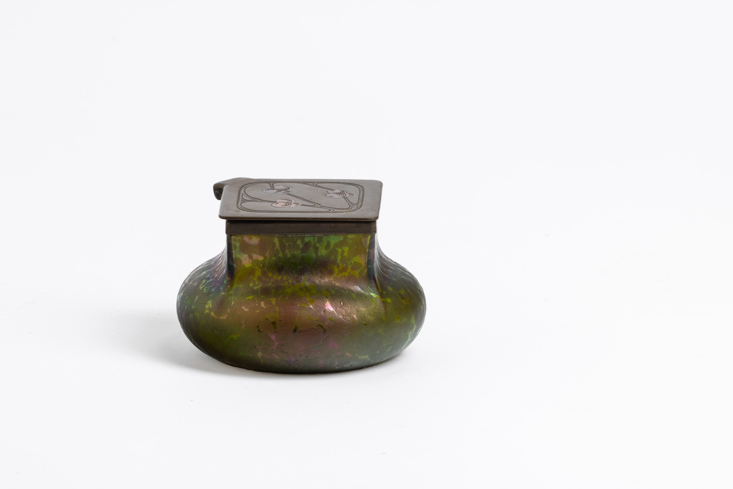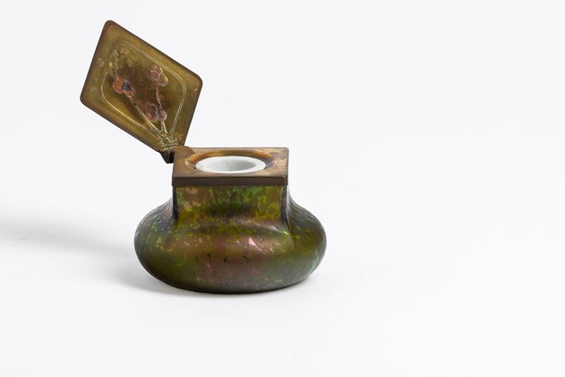 Calamaio a bulbo in vetro soffiato favrille con montatura e coperchio in ottone con decoro inciso e niellato e vaschetta porta inchiostro in ceramica.