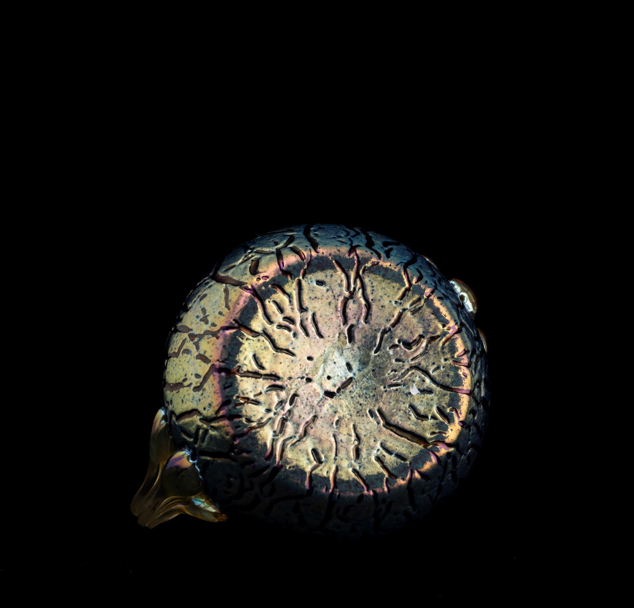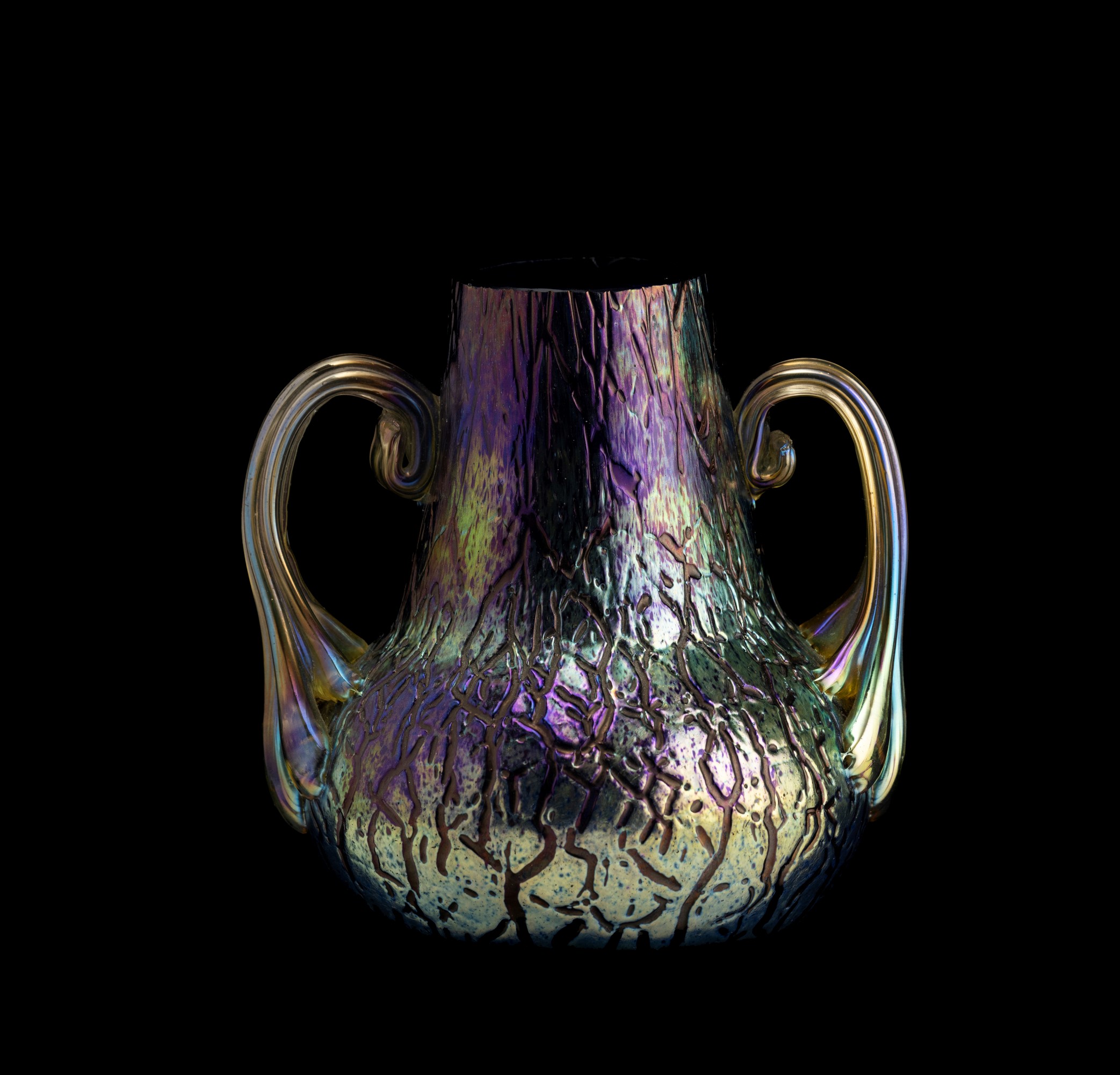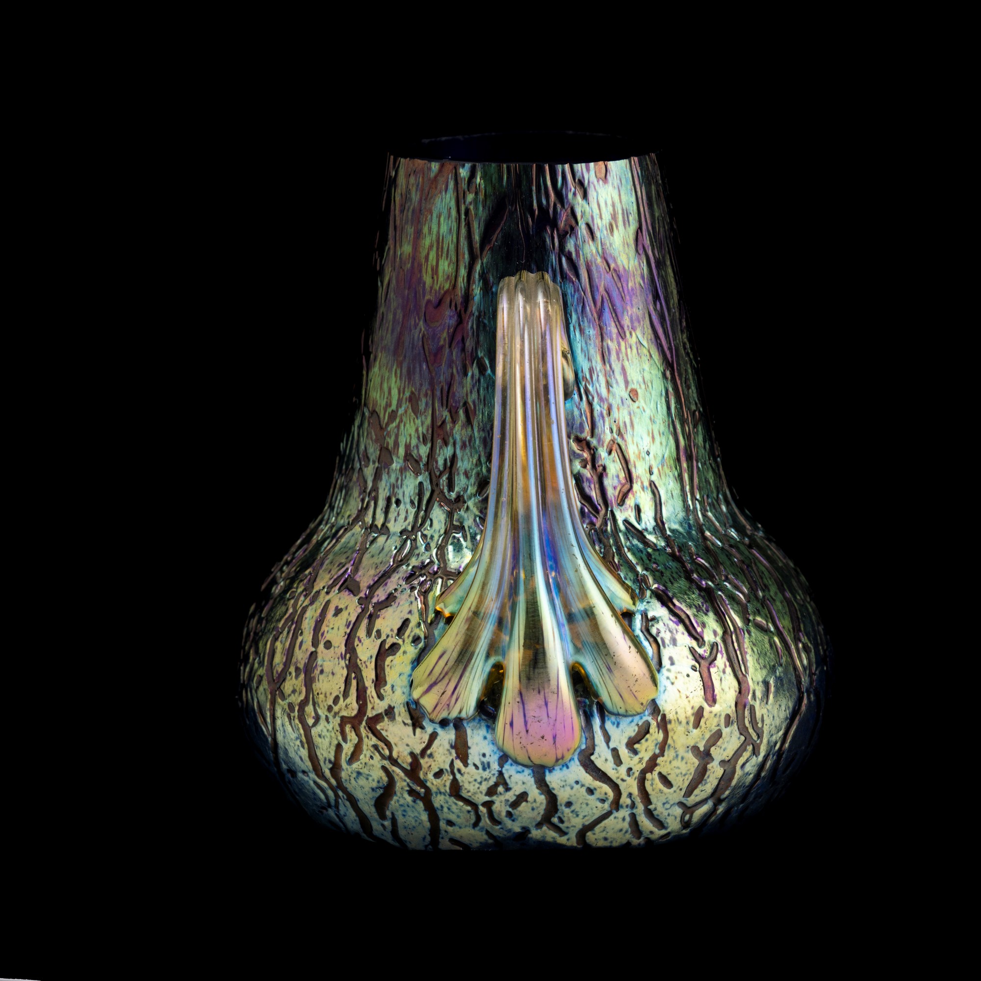 Piccolo vaso a bulbo con anse applicate in vetro soffiato favrille e superficie incisa irregolare.