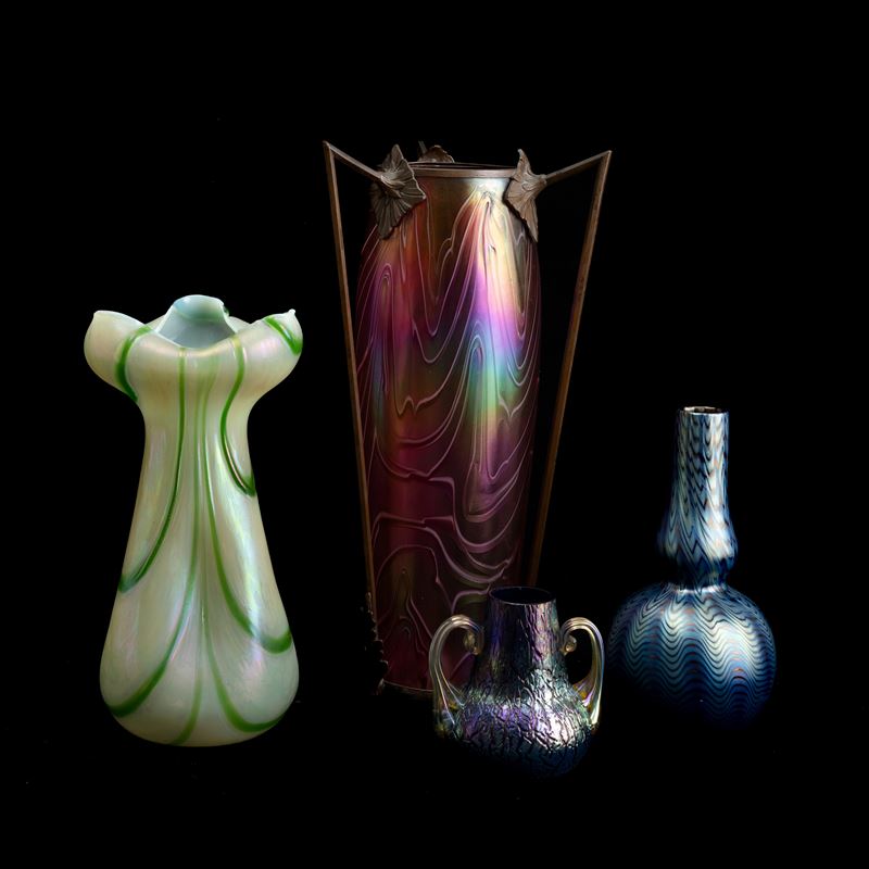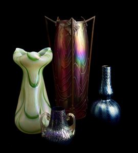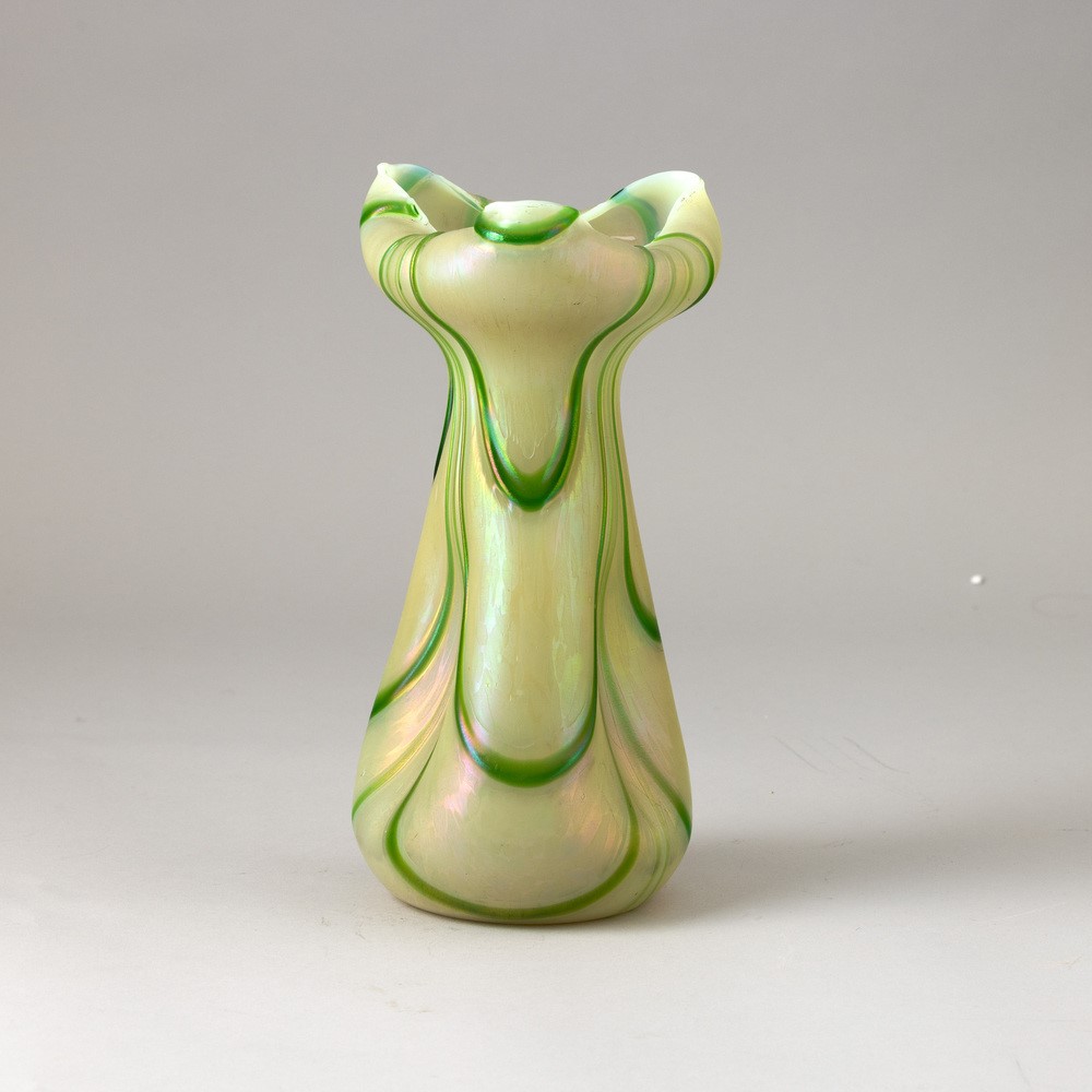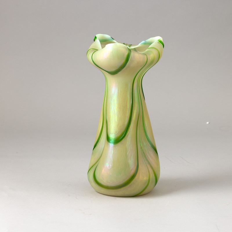 Vaso in vetro iridato con decoro di canne verdi. Bocca polilobata.
