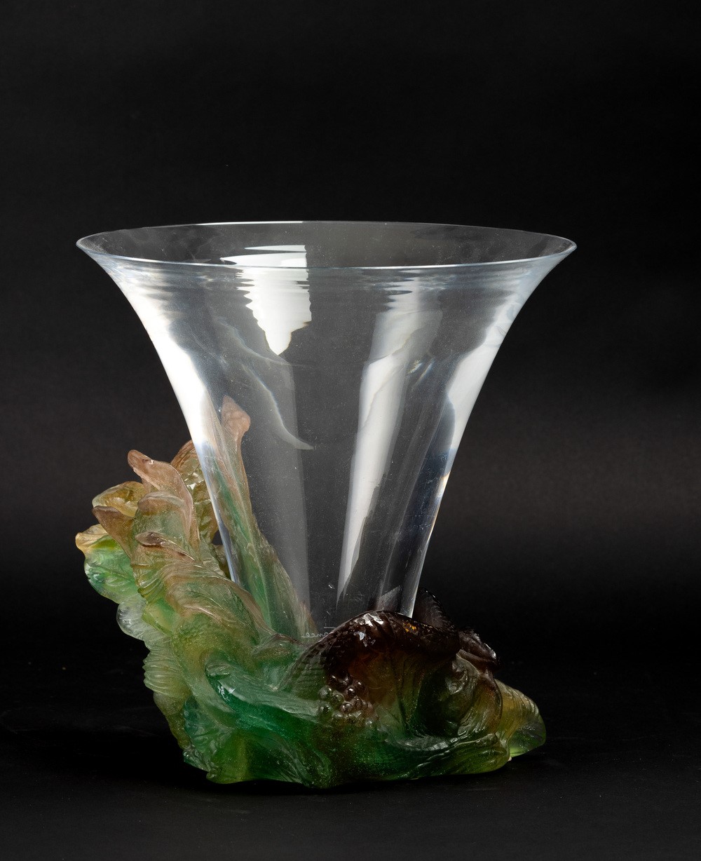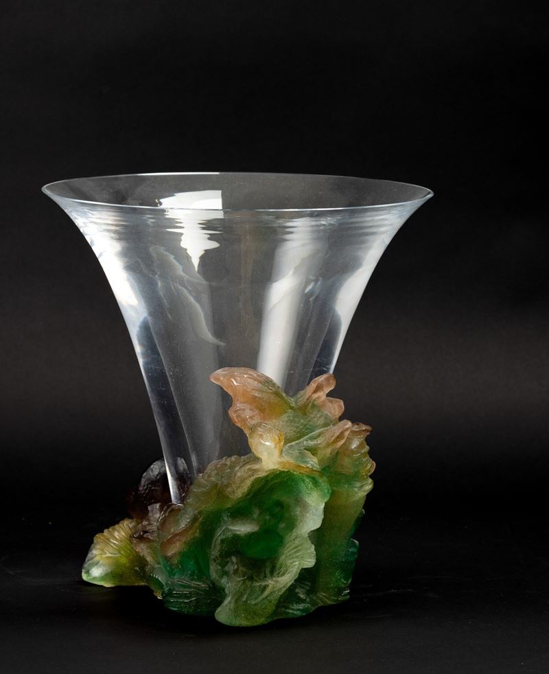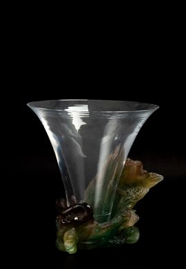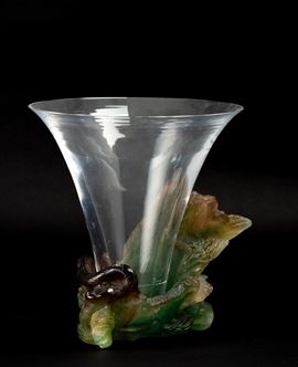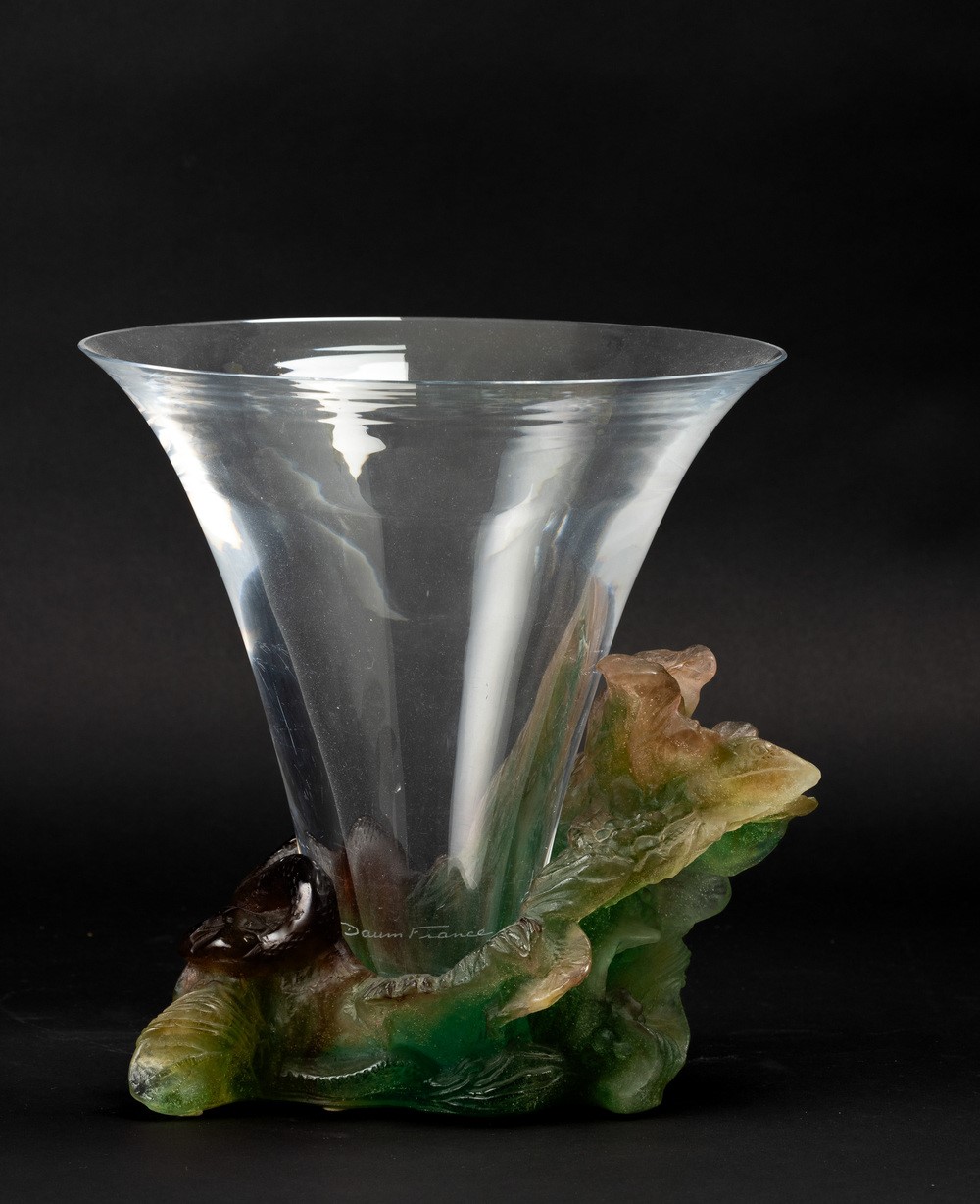 Vaso in cristallo su basamento in pasta vitrea a bollicine in forma di serpente.