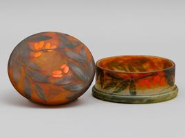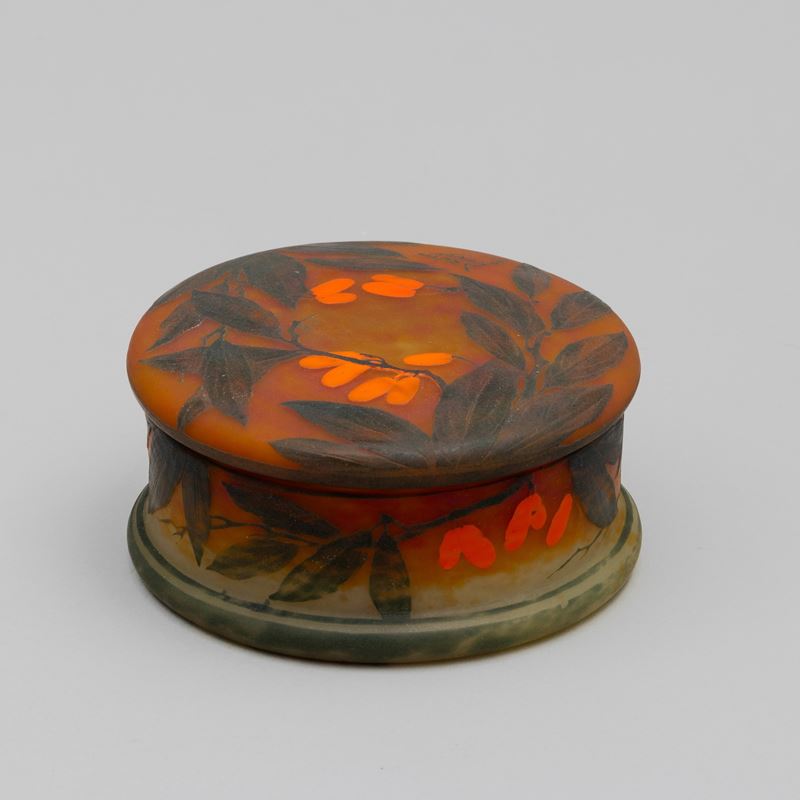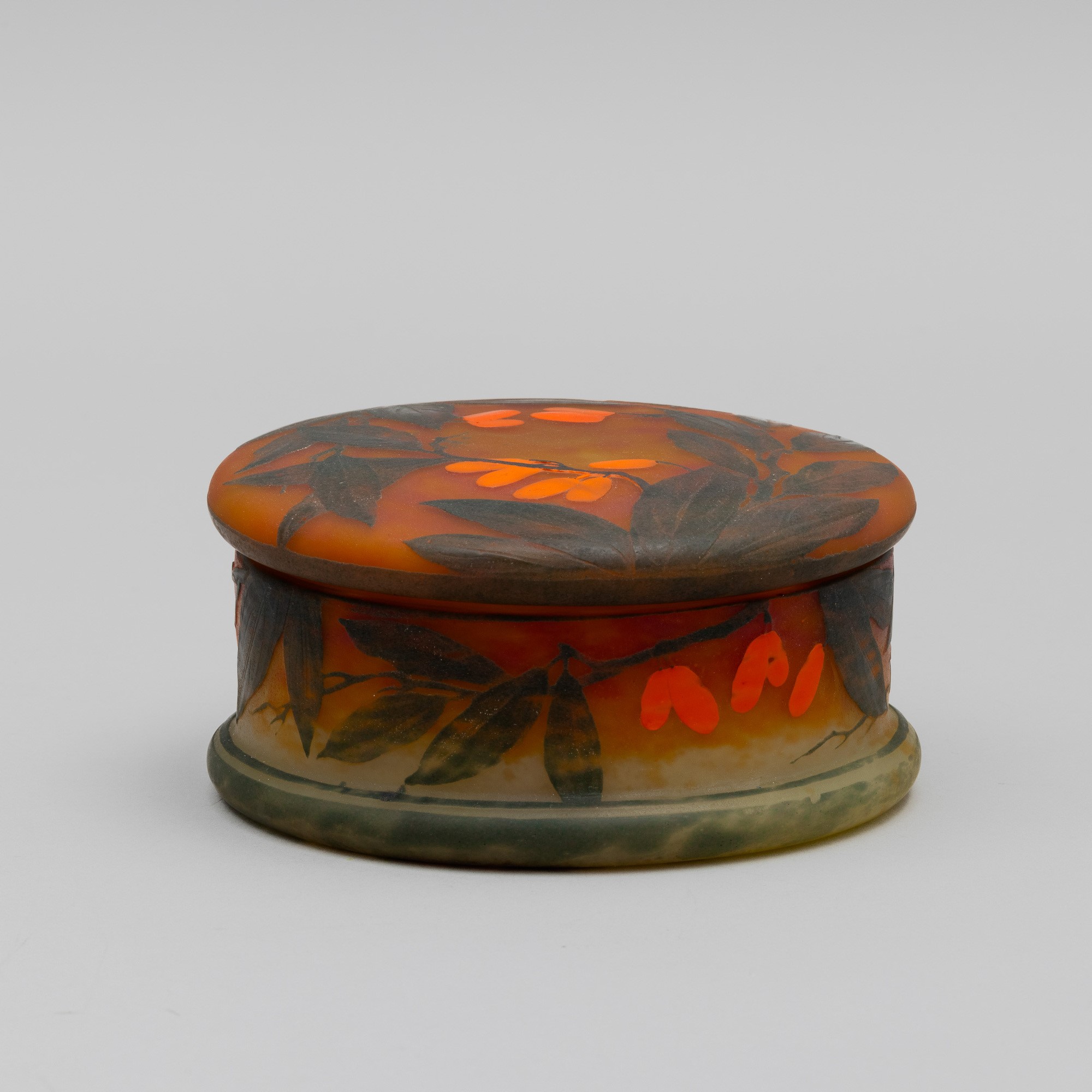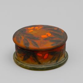 Scatola con coperchio in vetro a cammeo e smalti con decoro di fogliame e bacche arancioni.