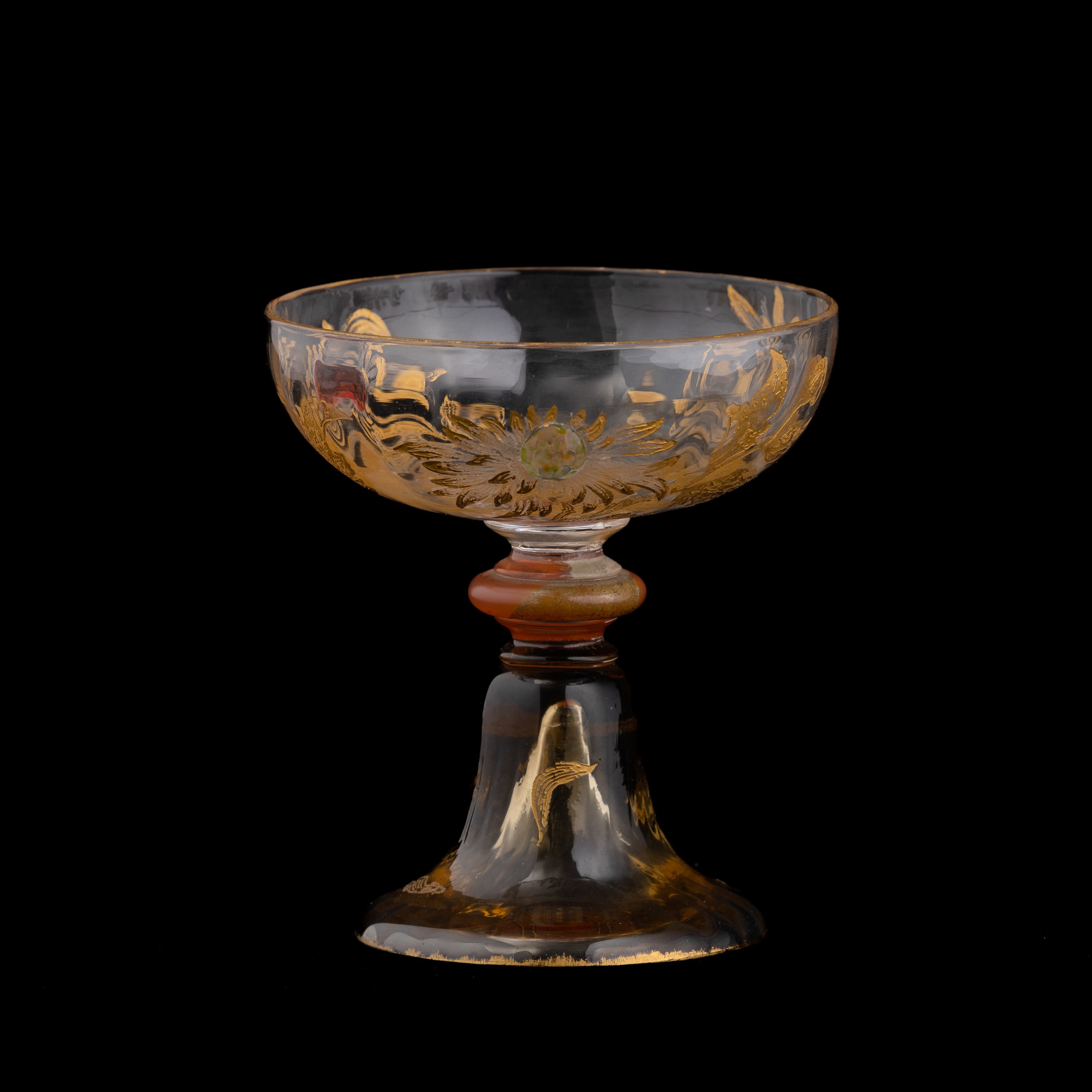 Coppa in cristallo su piede a campana con decoro floreale e applicazioni a smalto e paste vitree policrome.
