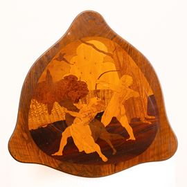 Tavolino con piano sagomato in legno con decoro ad intarsio di scena di caccia.