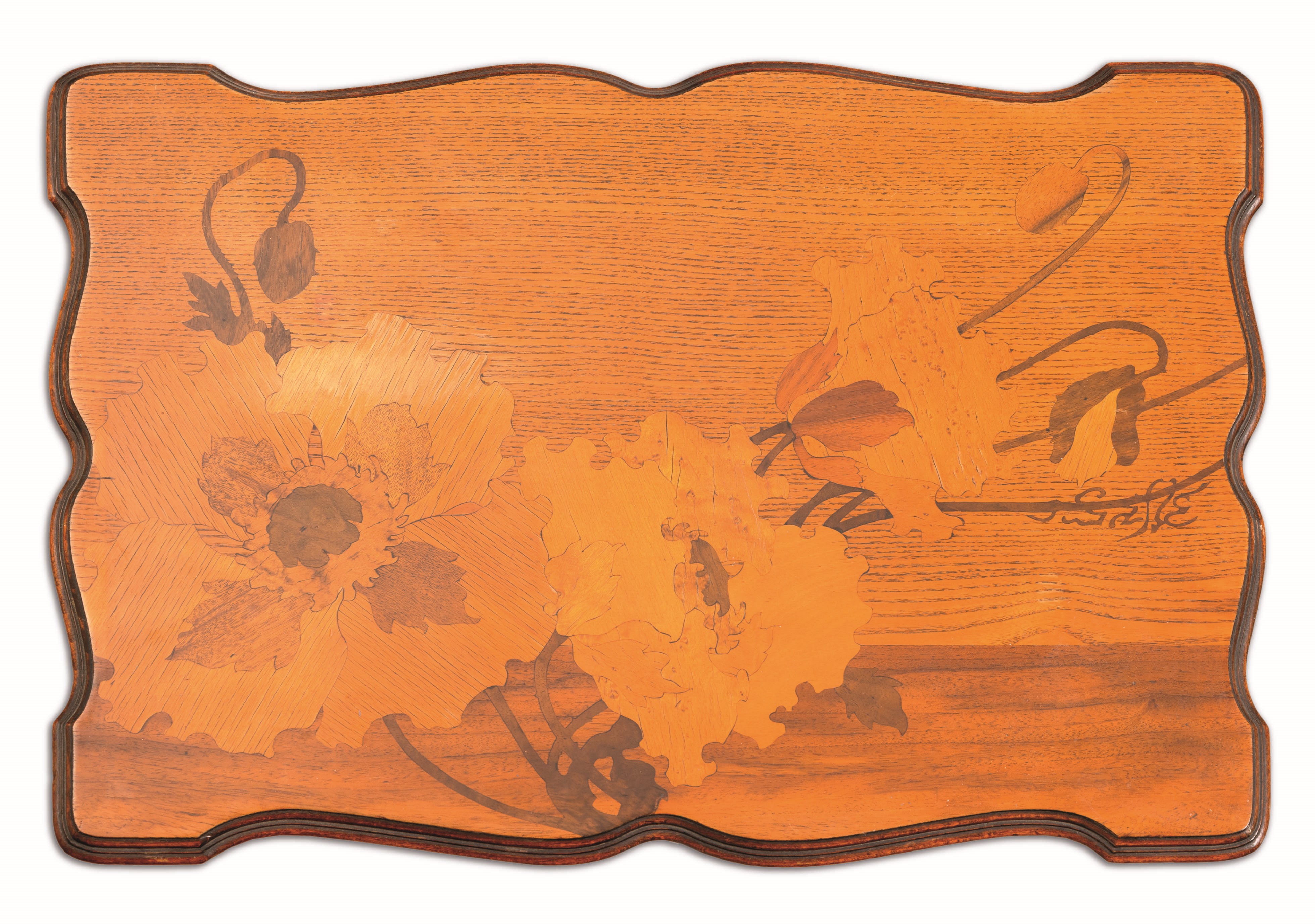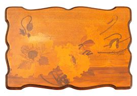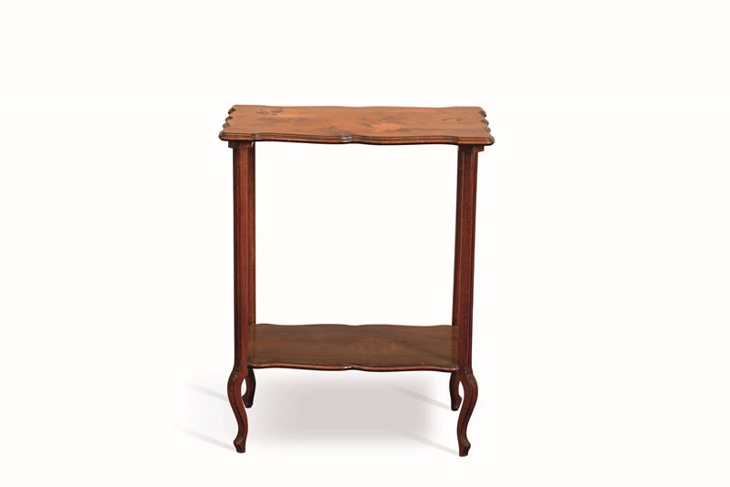 Tavolino con piano rettangolare sagomato in legno con decoro floreale ad intarsio.