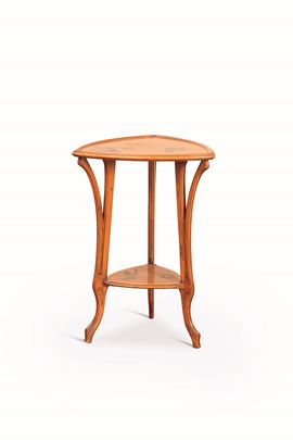 Tavolino con piano triangolare convesso in legno con decoro floreale ad intarsio.