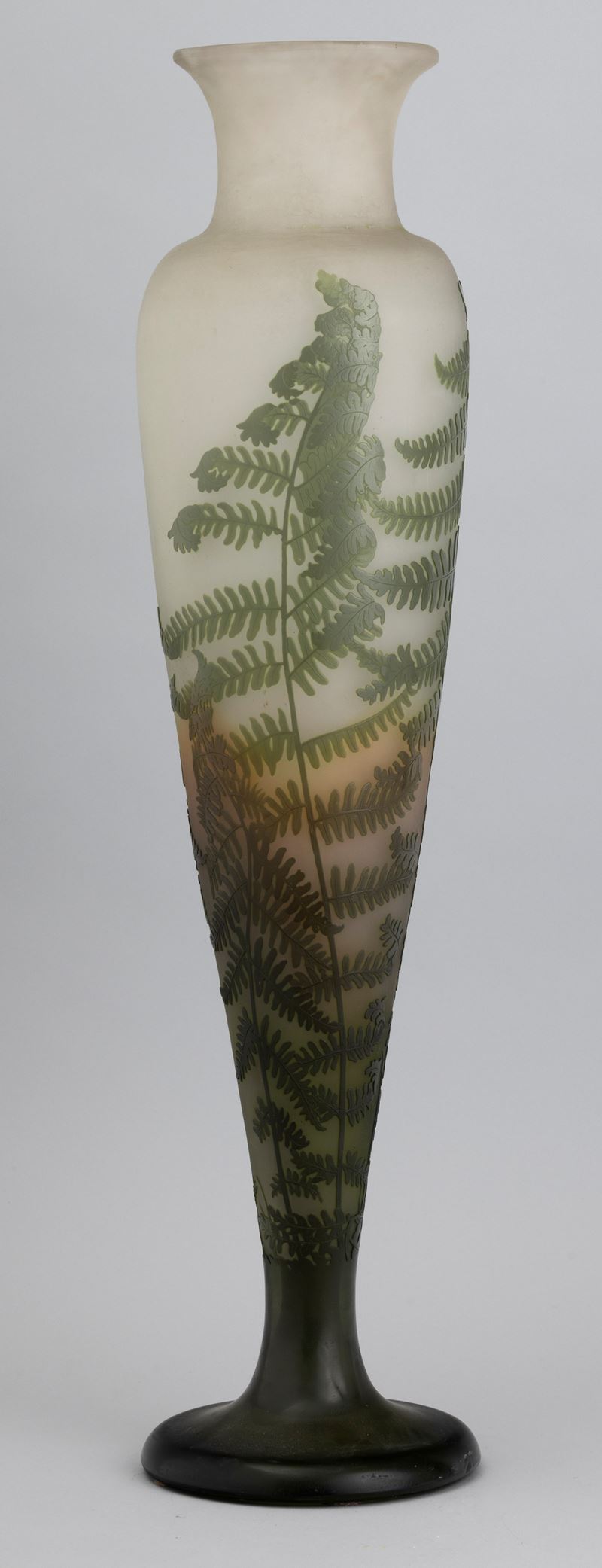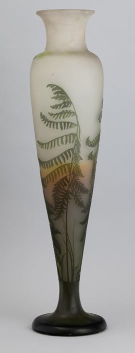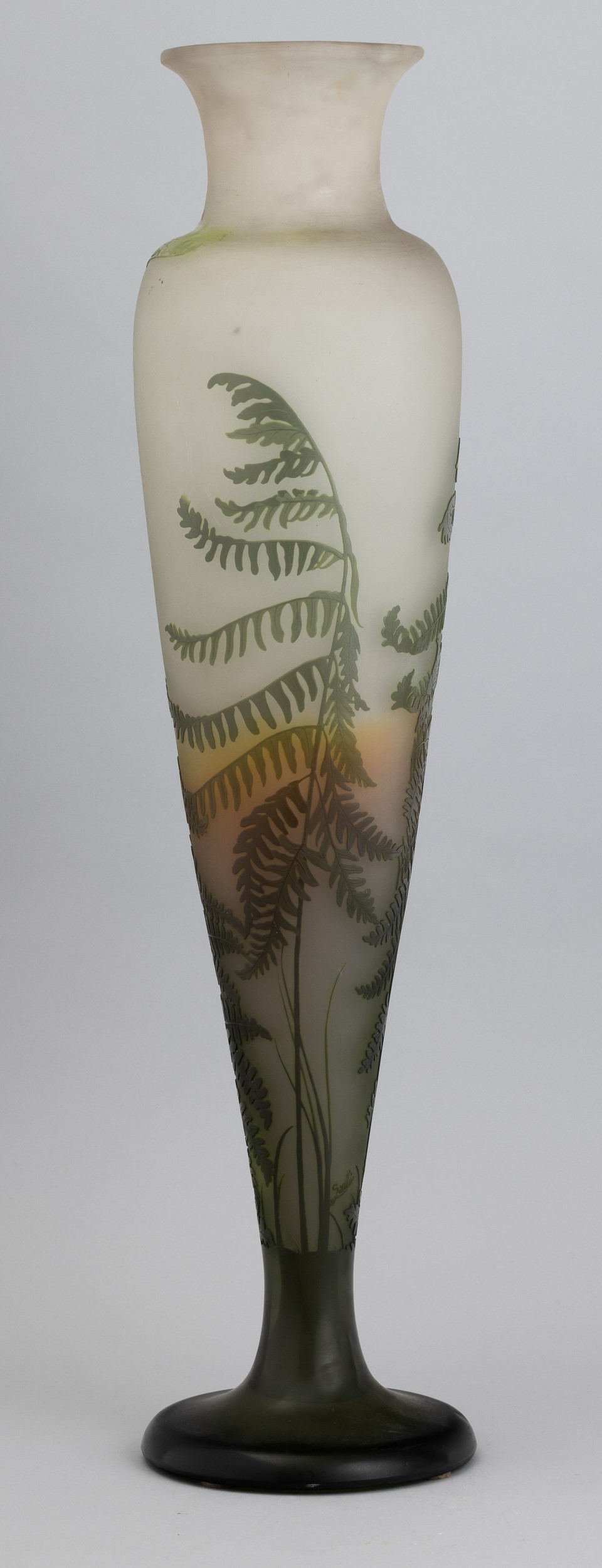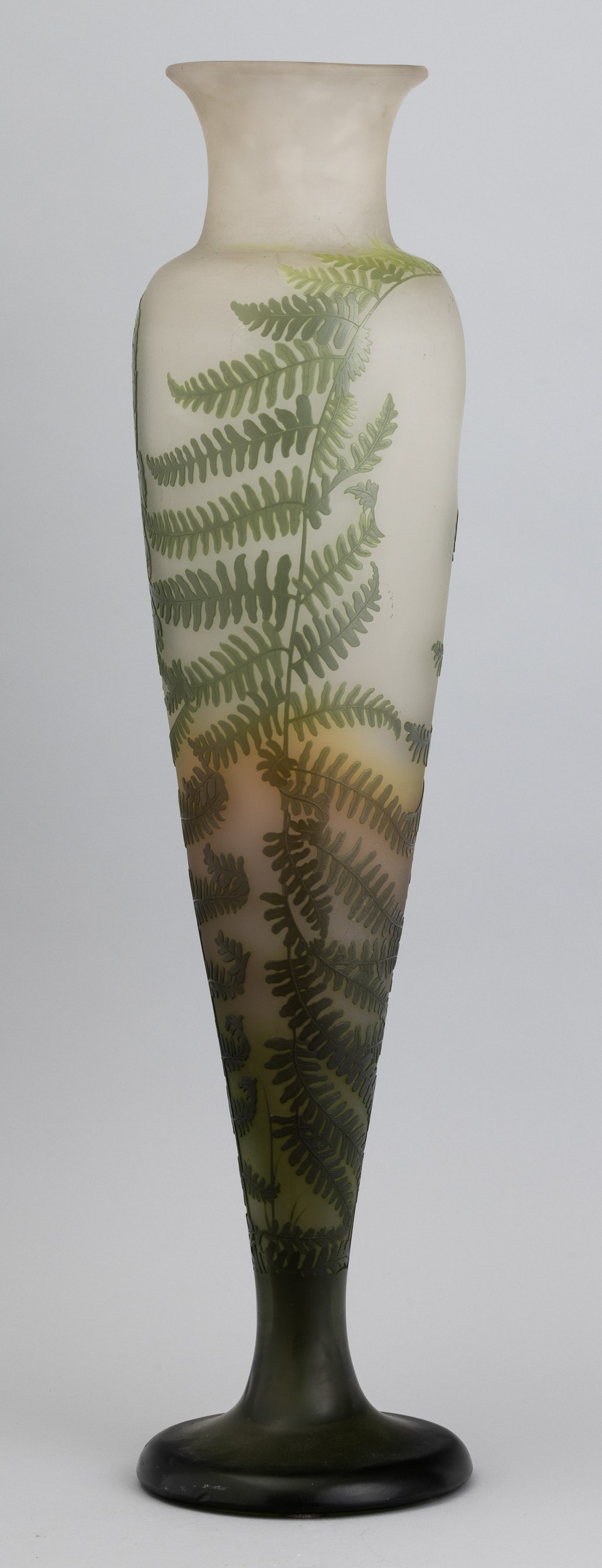 Grande vaso a balaustro in vetro a cammeo con decoro di felci.