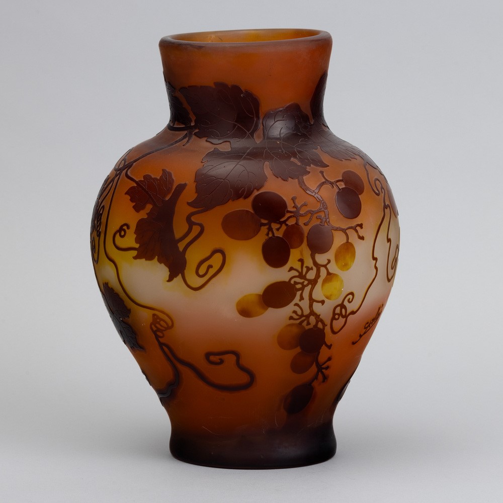 Vaso a balaustro a sezione ovale in vetro a cammeo con decoro di rami di vite e grappoli.