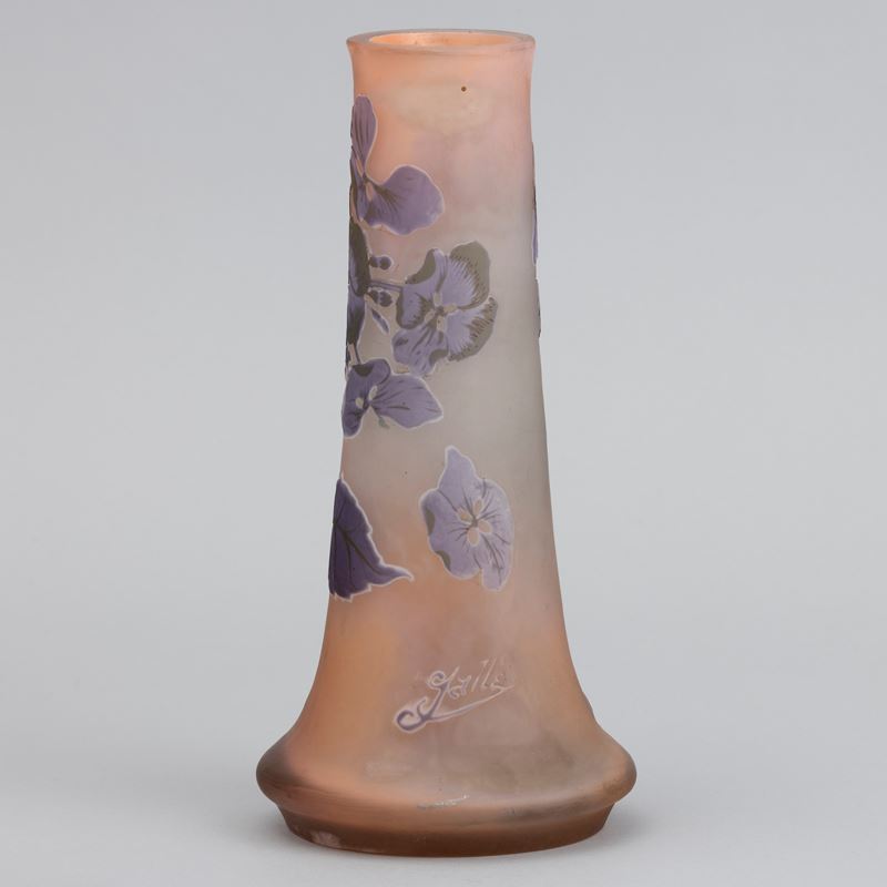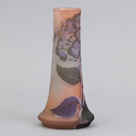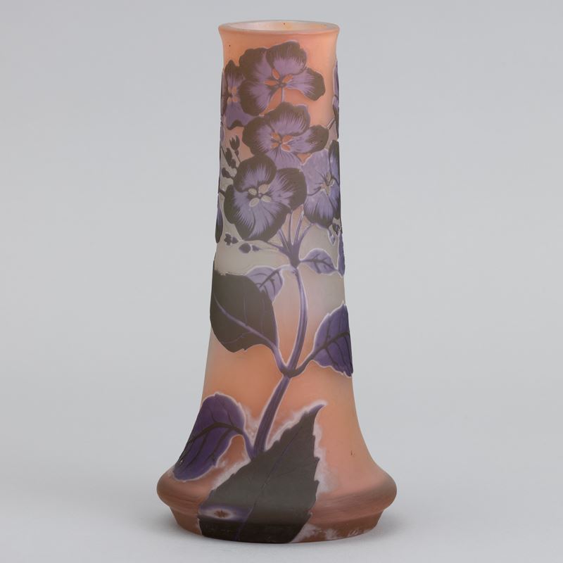 Vaso a clava in vetro a cammeo con decoro di ortensie.