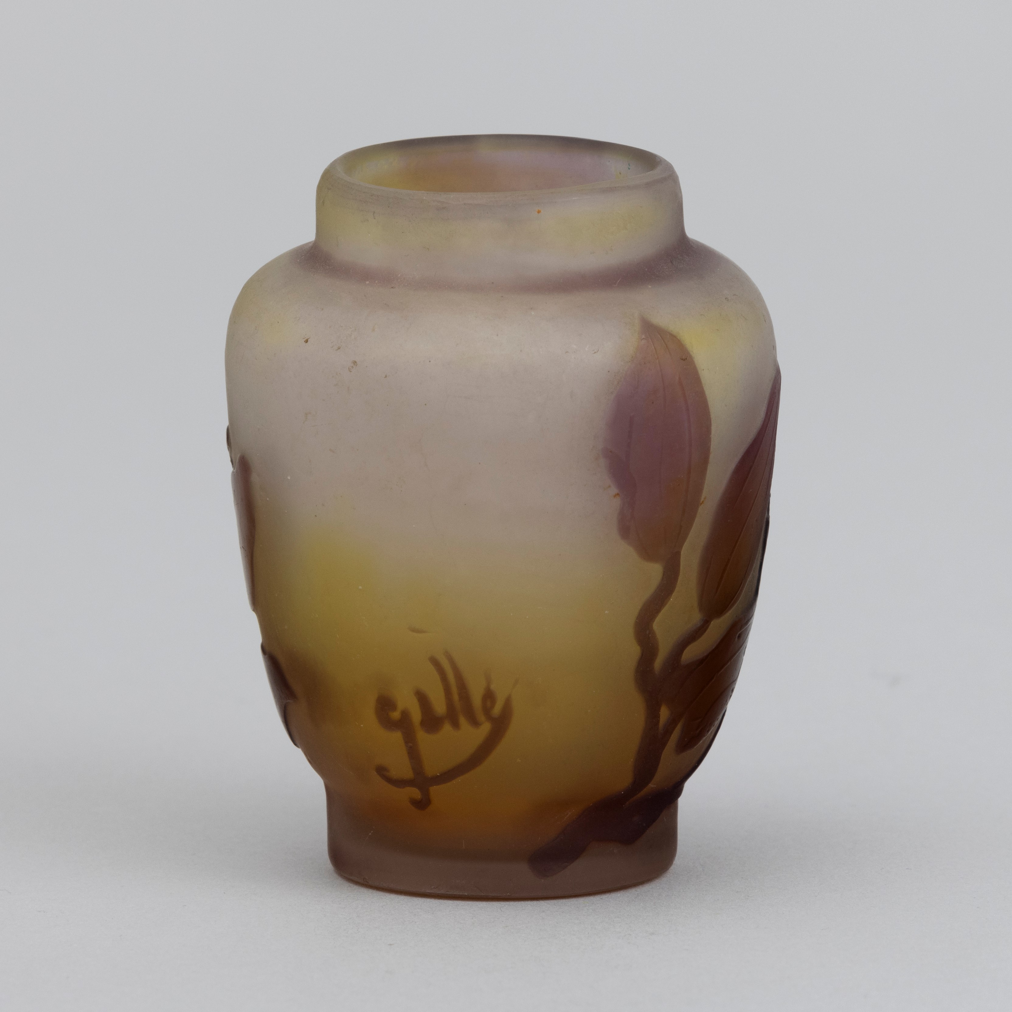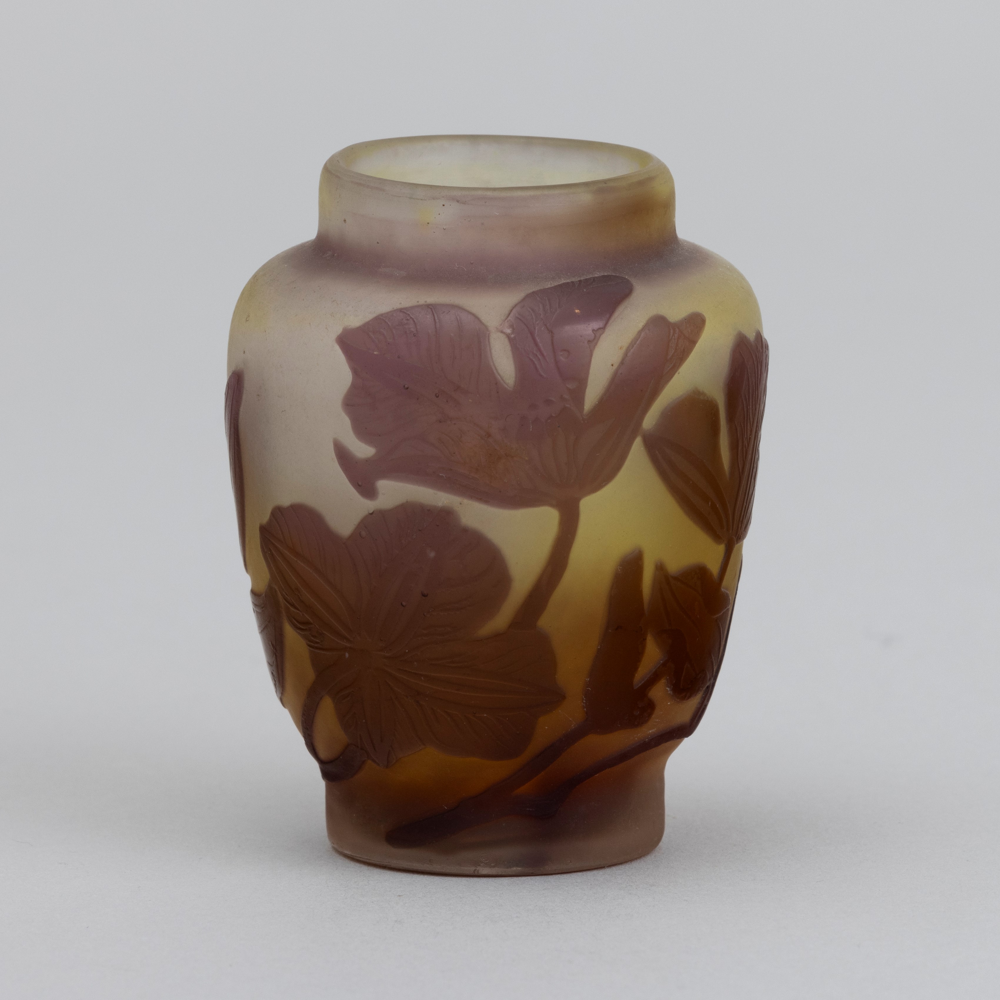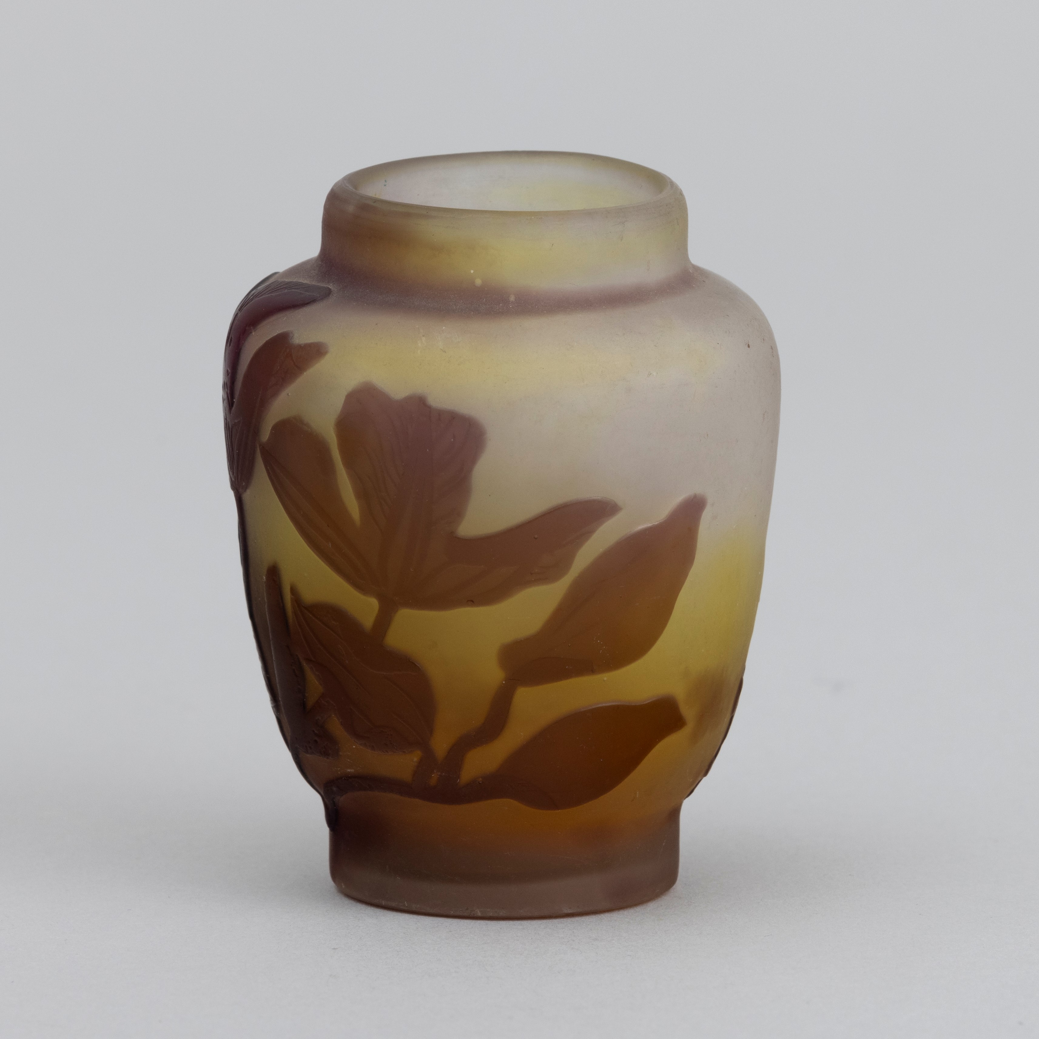 Piccolo vaso in vetro a cammeo con decoro floreale.