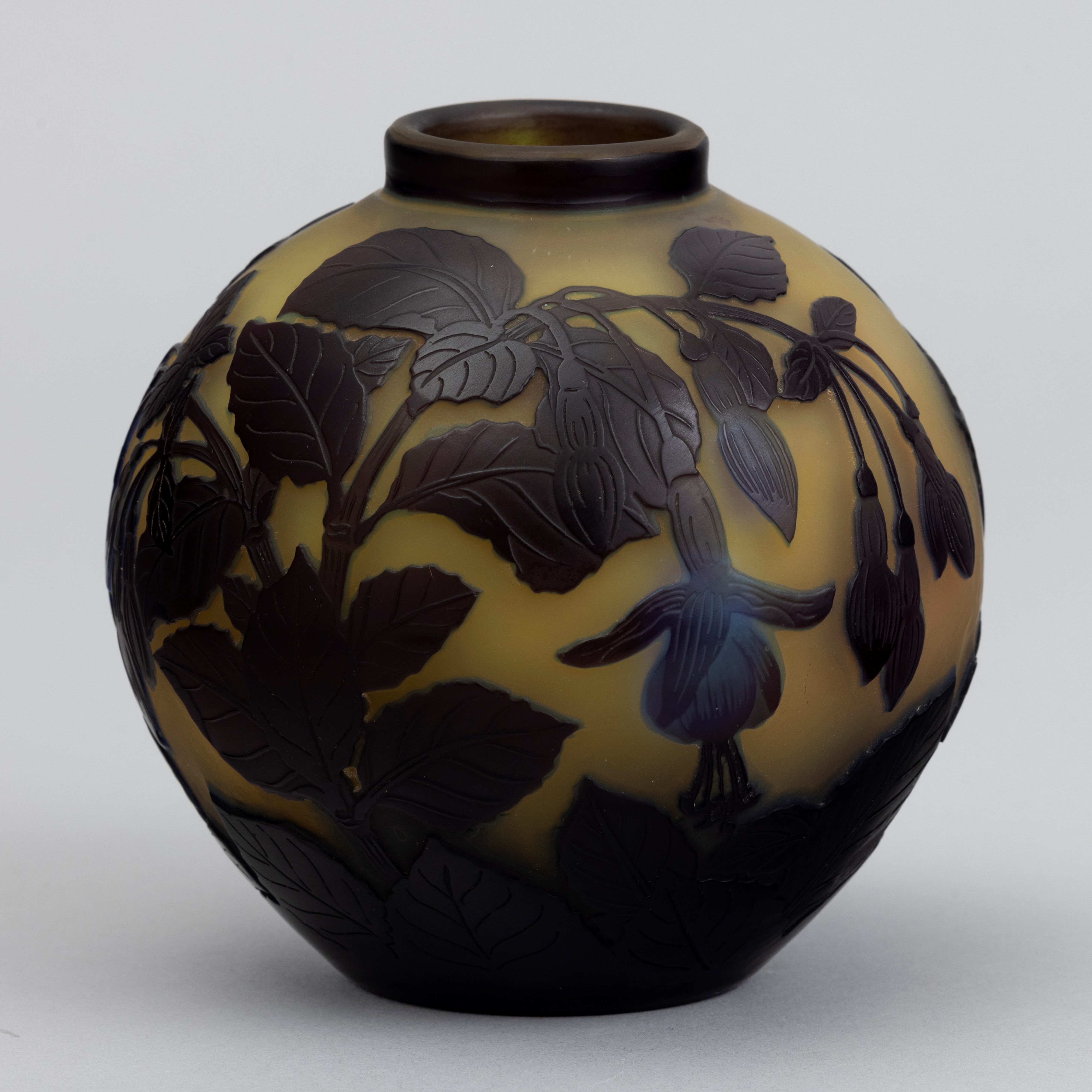 Vaso a sfera in vetro a cammeo con decoro di fucsie.
