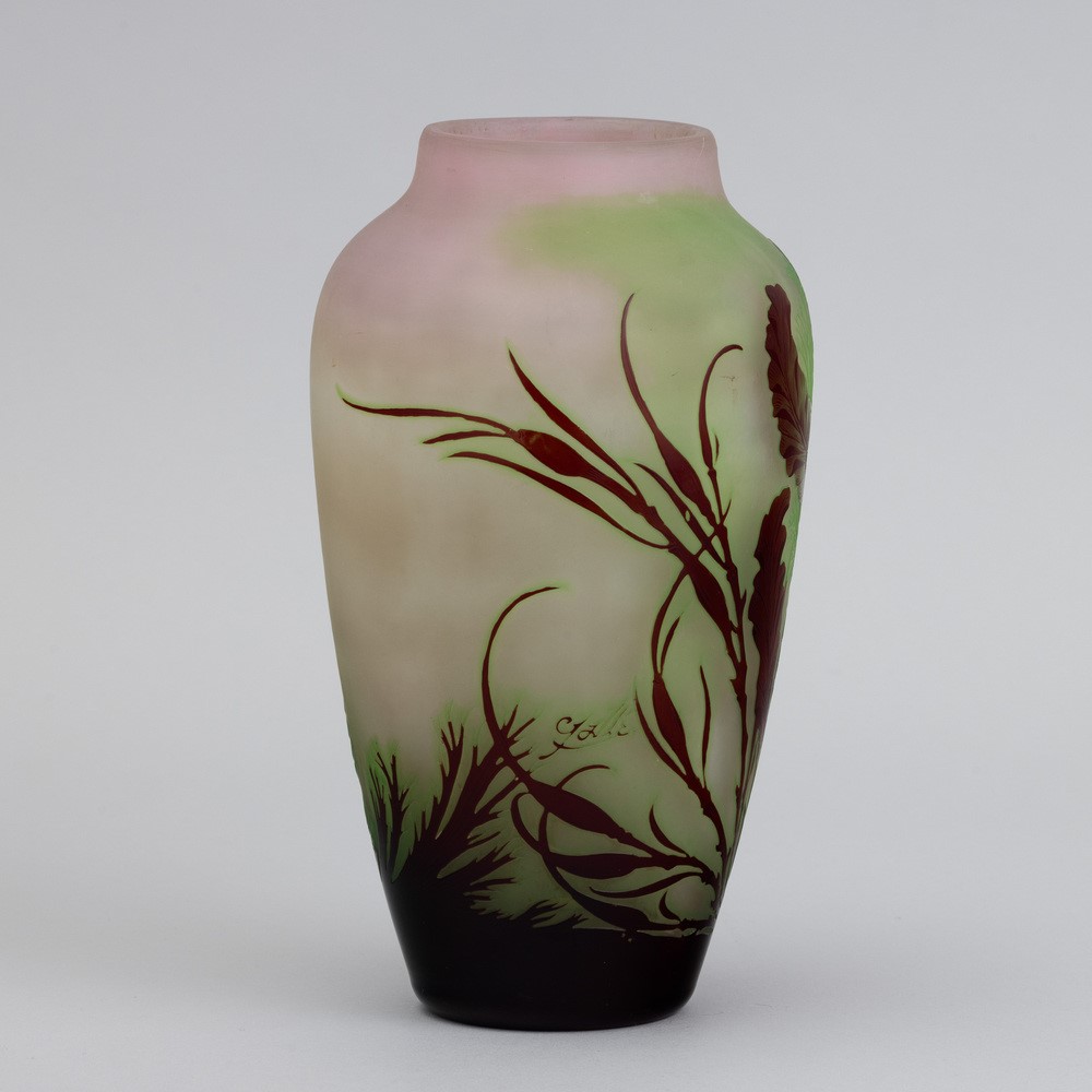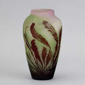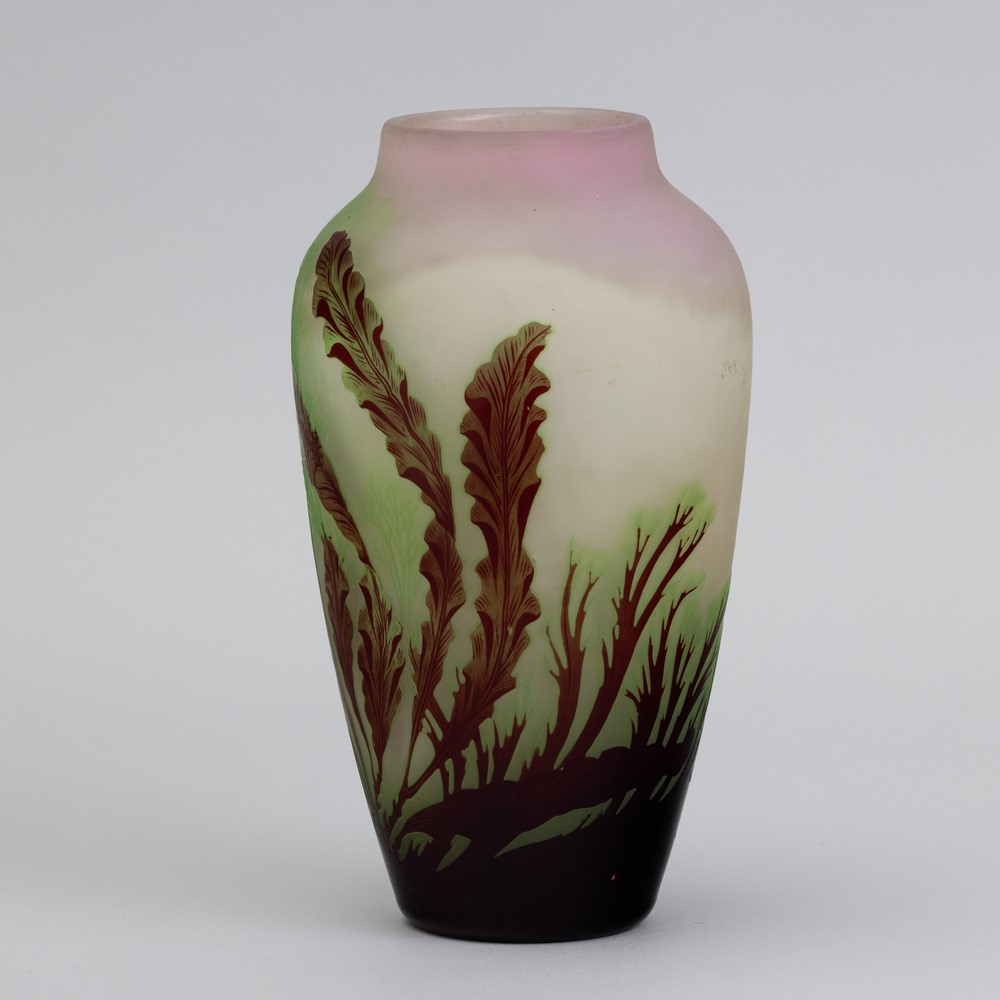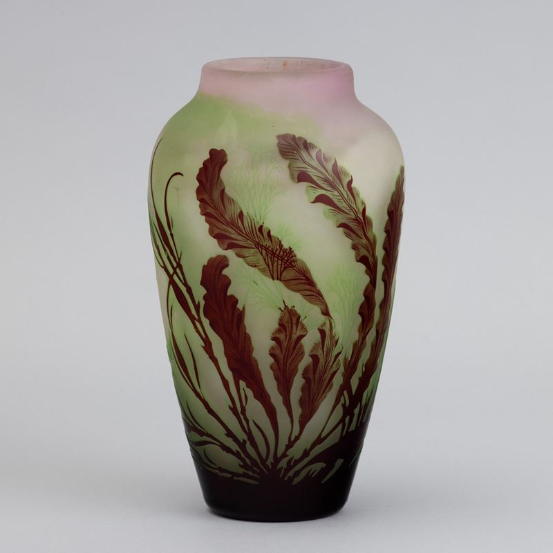 Vaso troncoconico in vetro a cammeo con decoro di alghe e fondale marino.