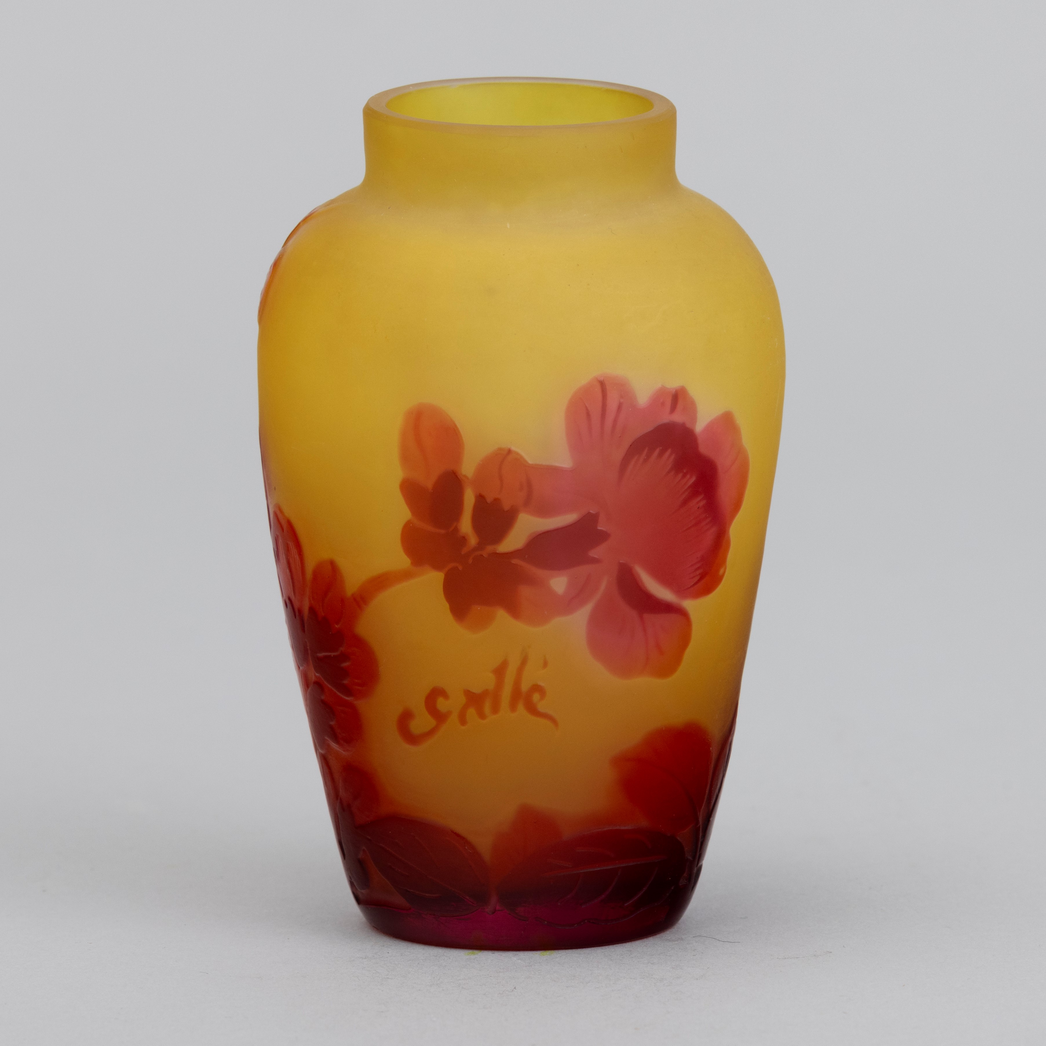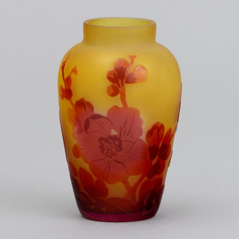 Piccolo vaso in vetro a cammeo con decoro di primule.