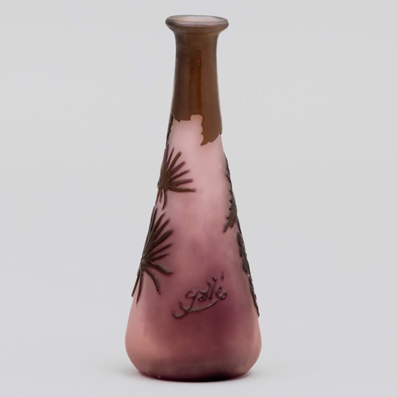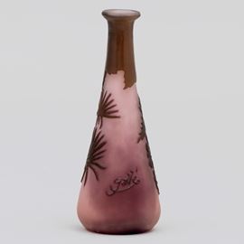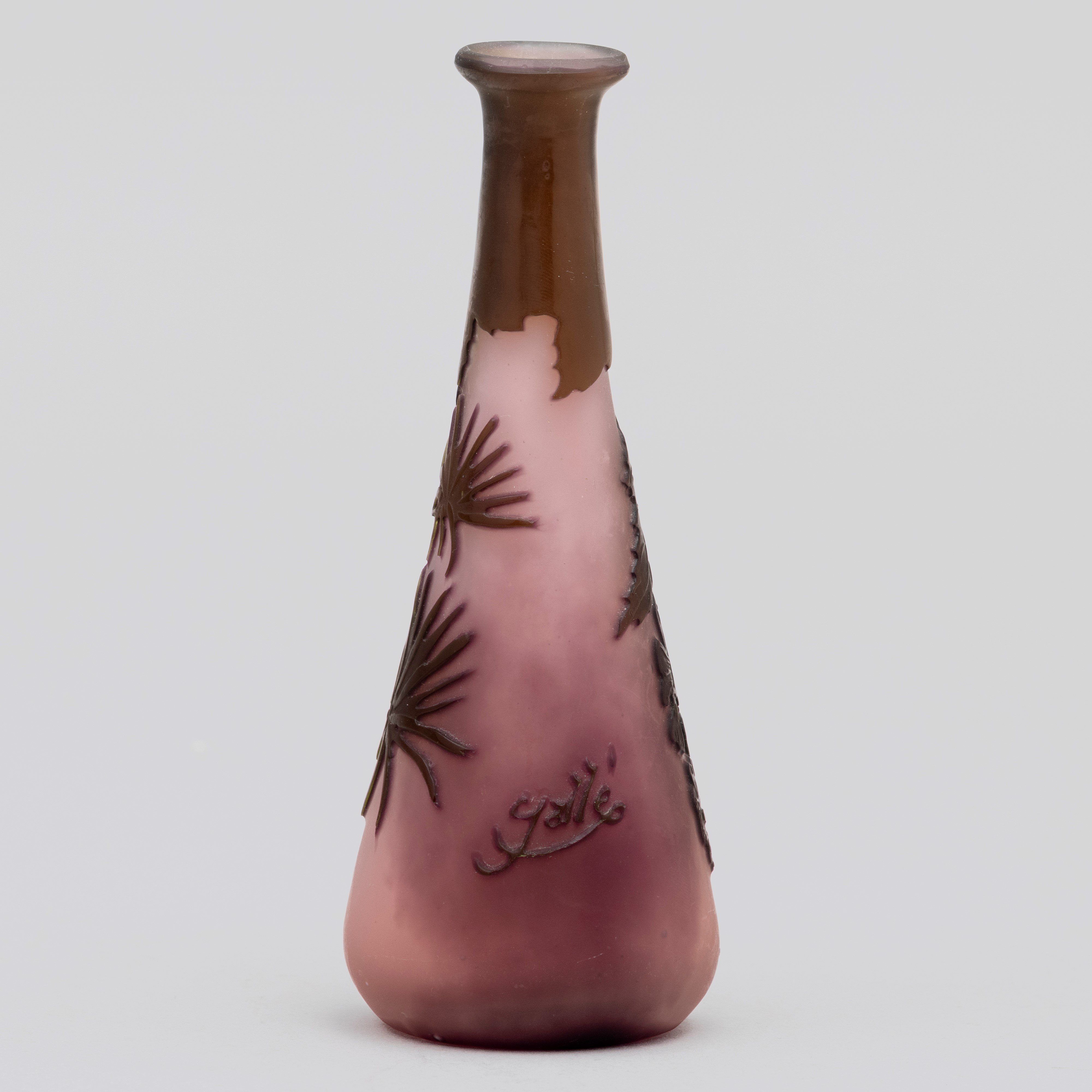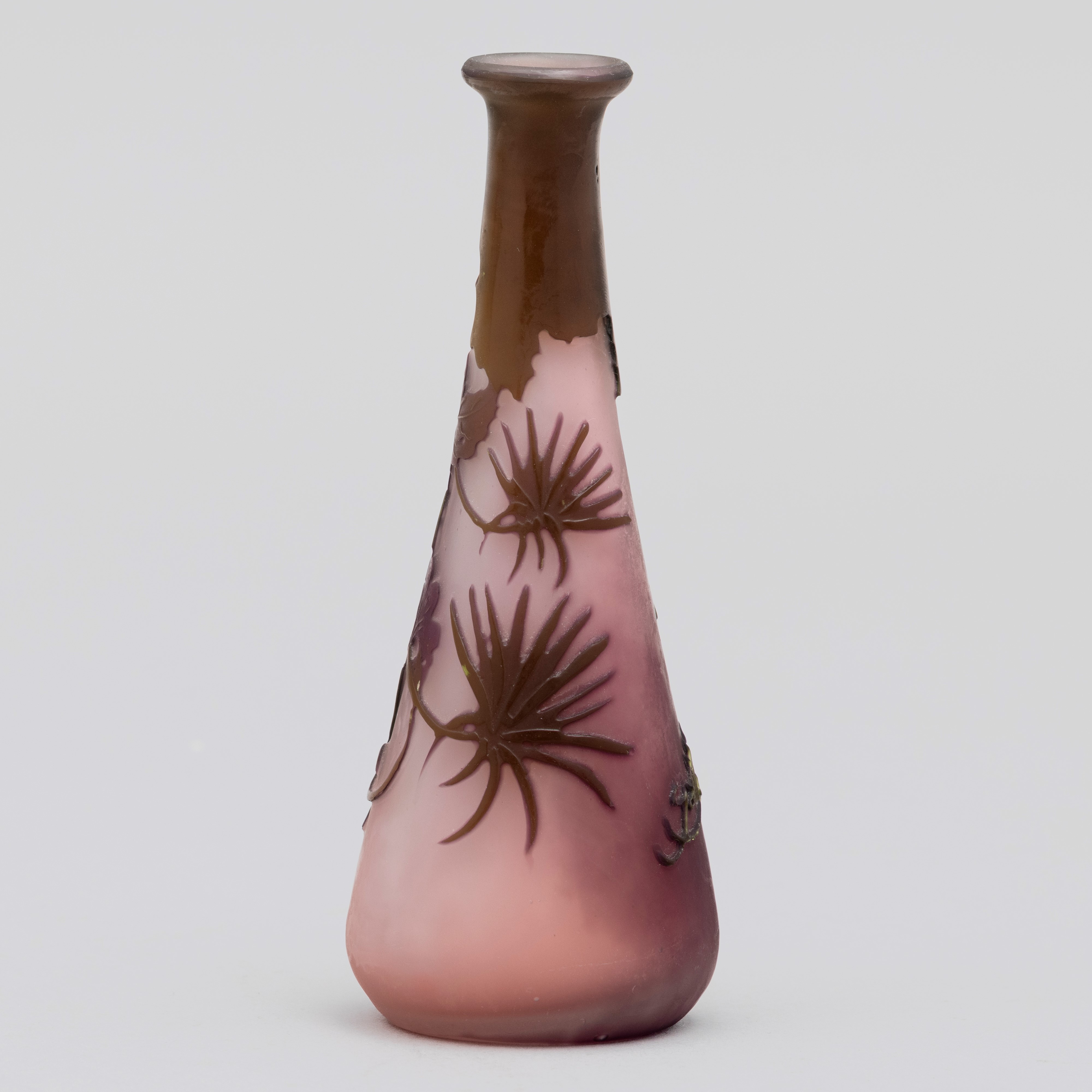 Piccolo vaso troncoconico in vetro a cammeo con decoro di aquilegie.