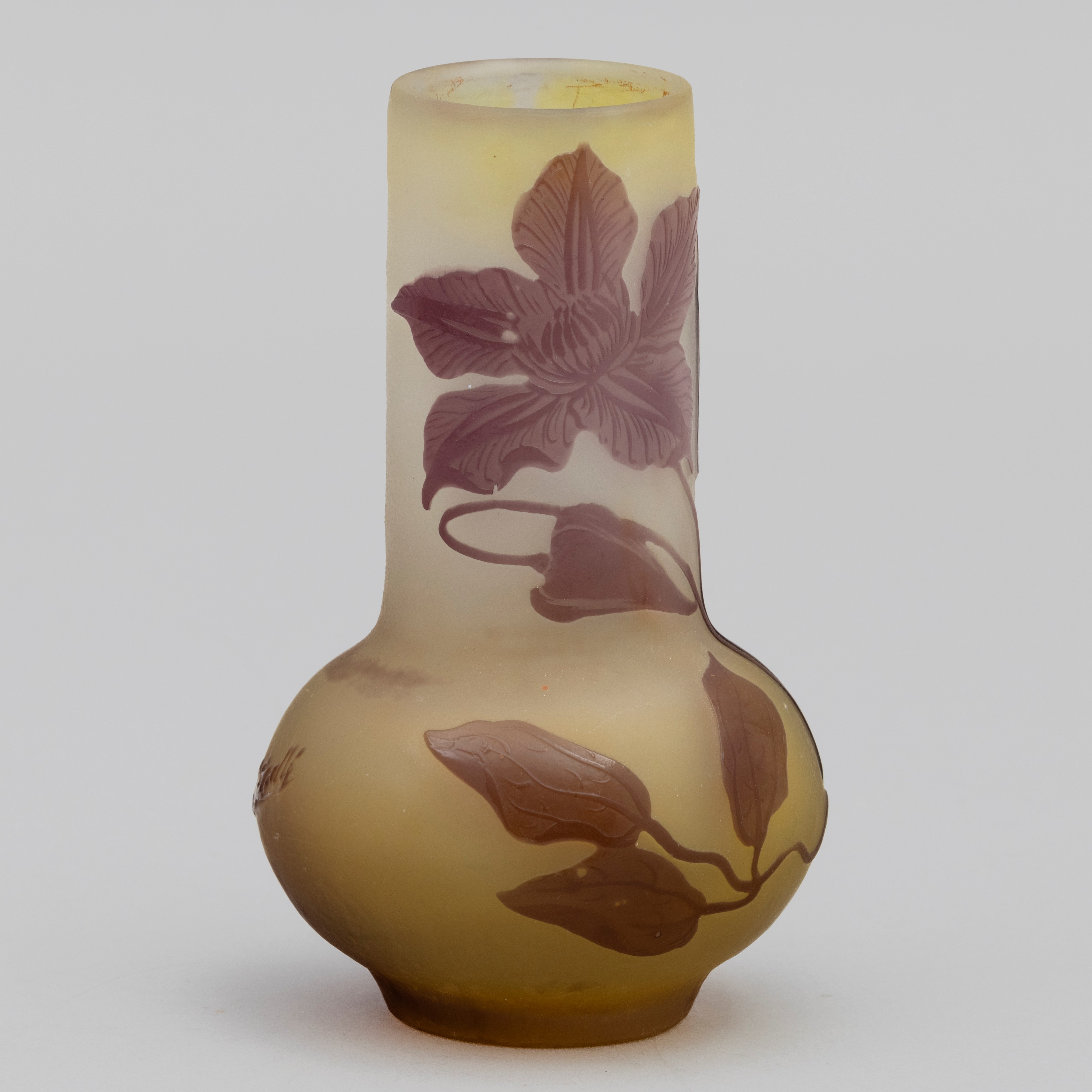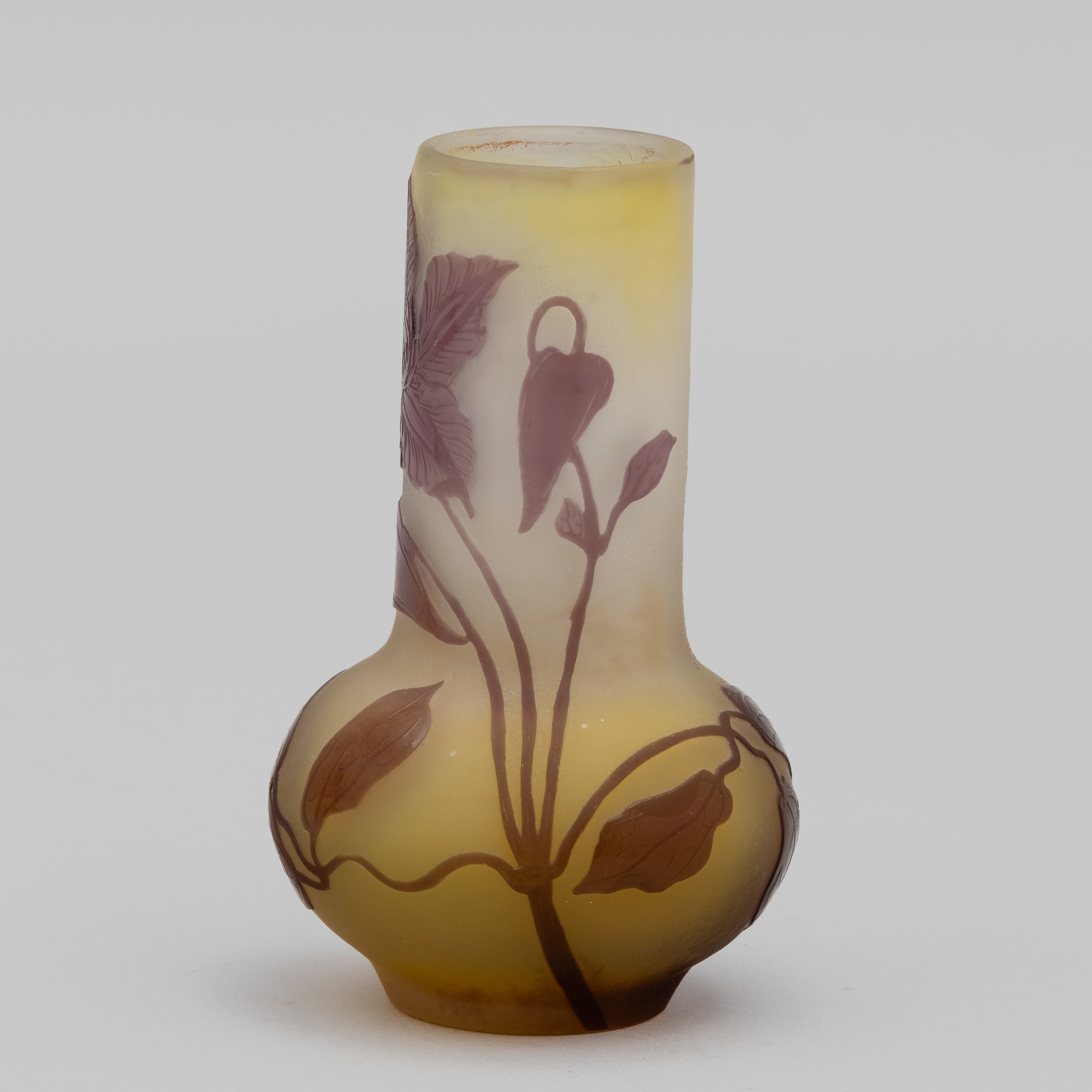 Vaso a clava in vetro a cammeo con decoro di clematide.