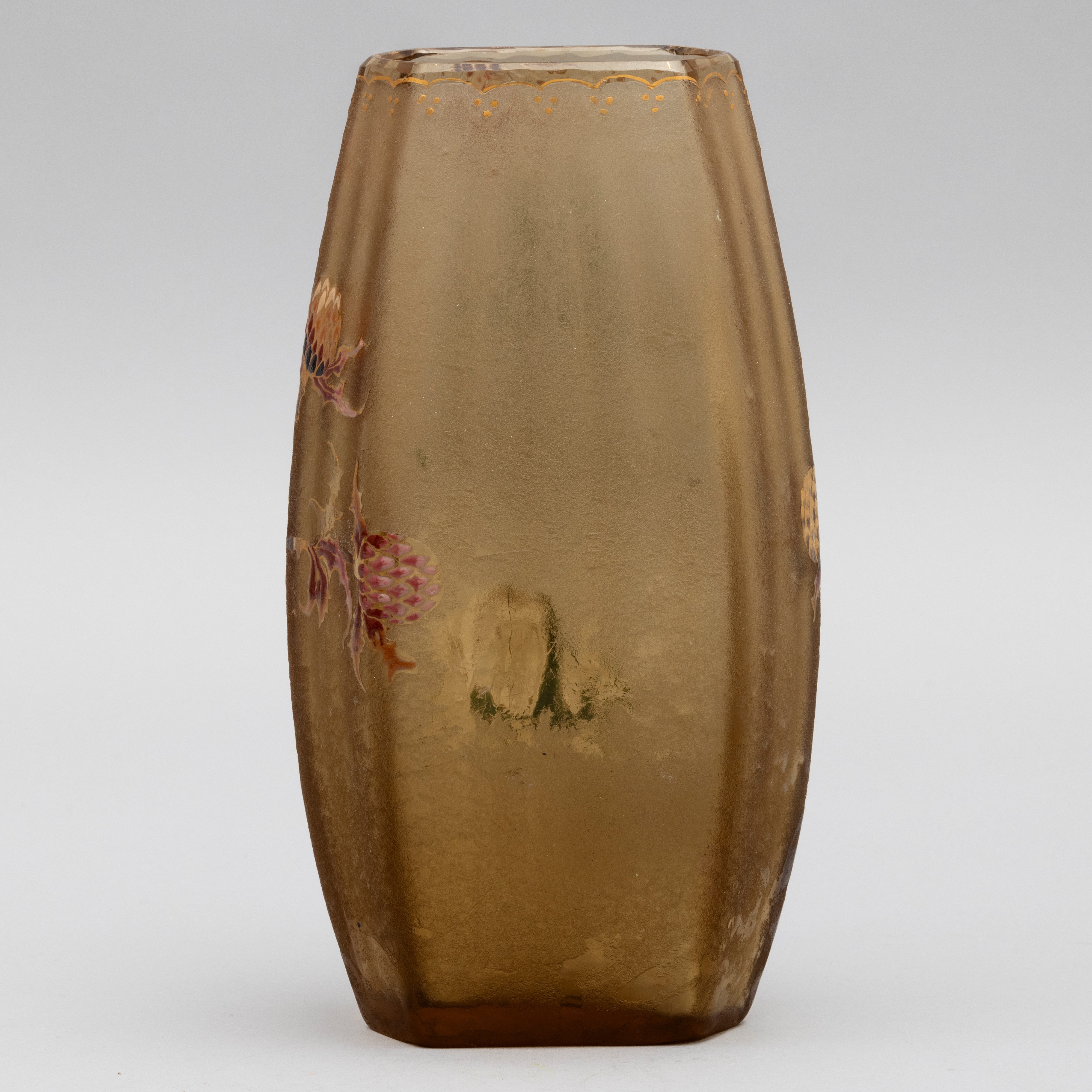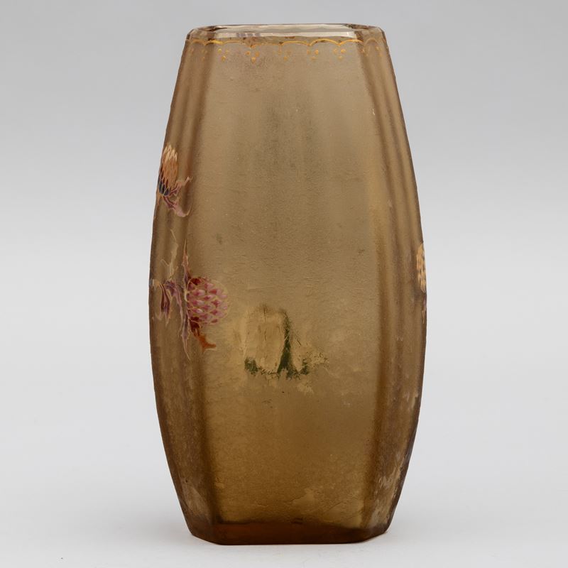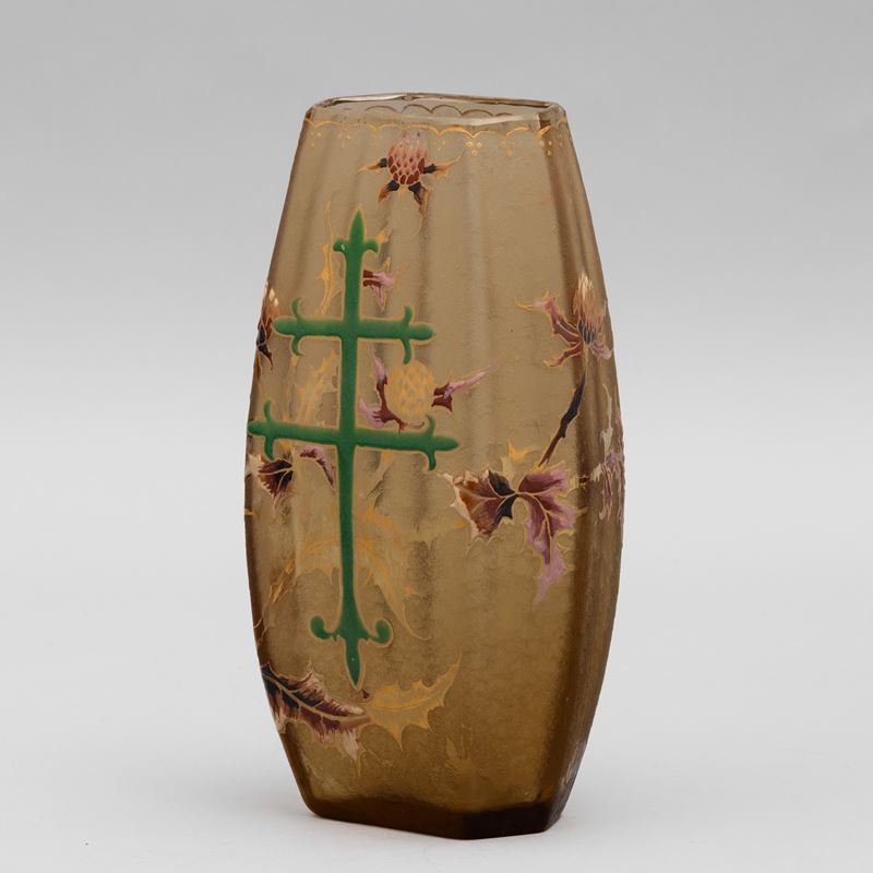 Vaso a sezione esagonale in vetro a cammeo e smalti con decoro di rovi e grande croce di Lorena.