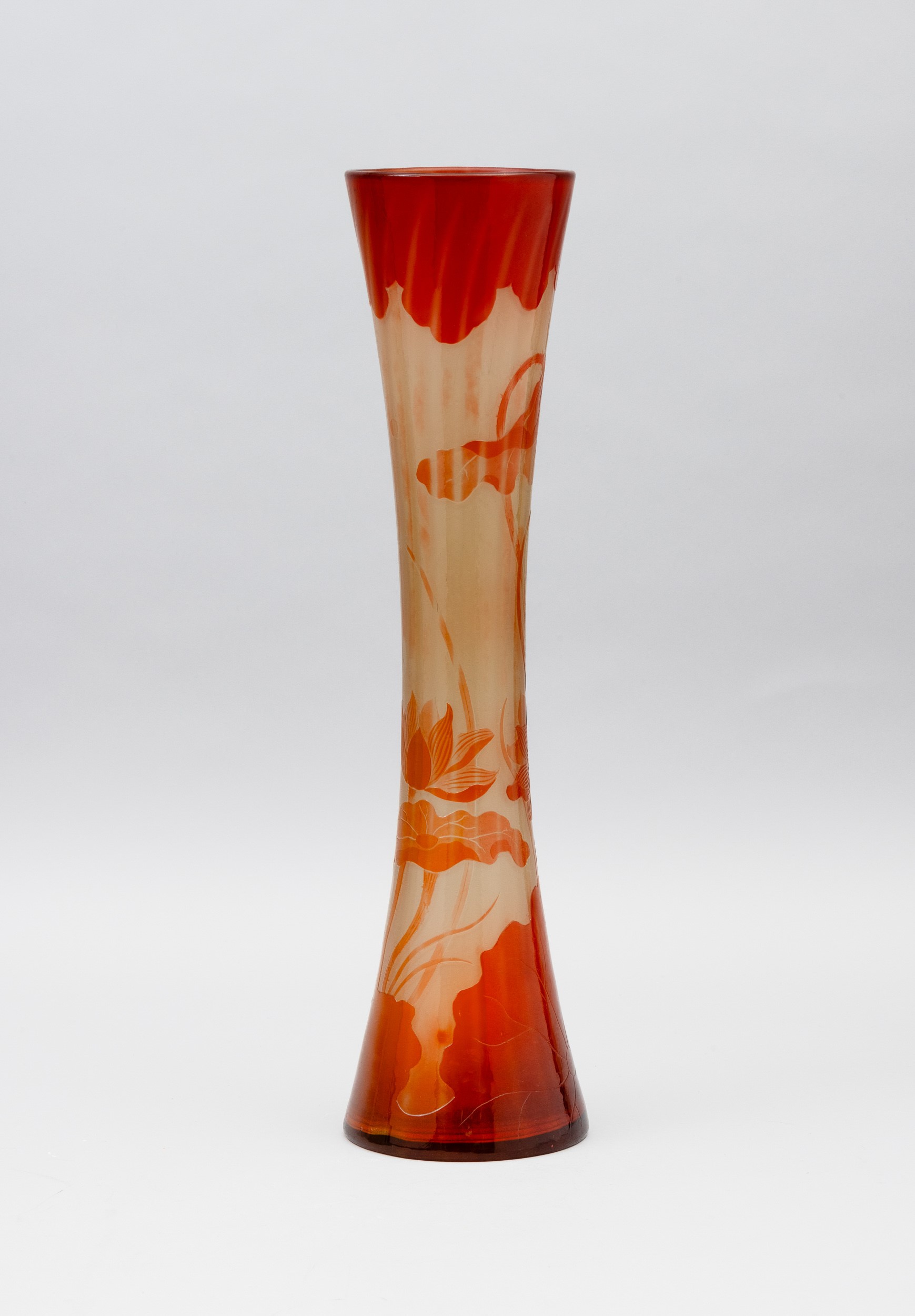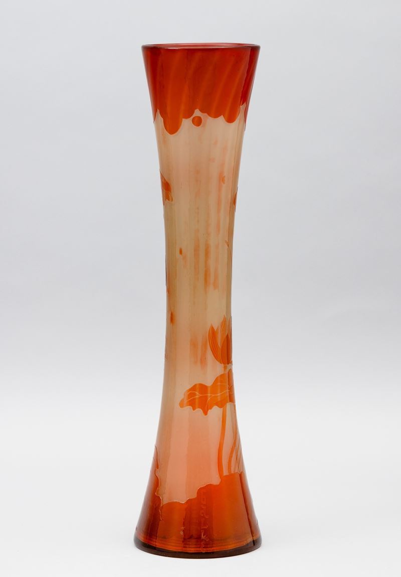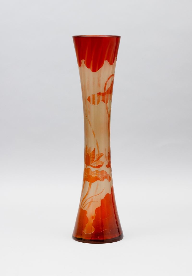 Vaso a clessidra in vetro a cammeo con decoro di ninfee.