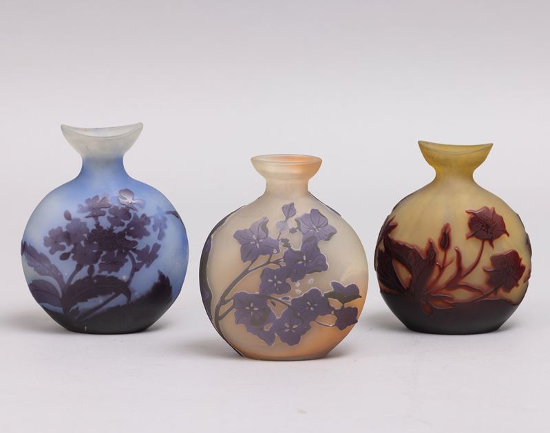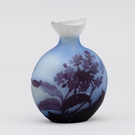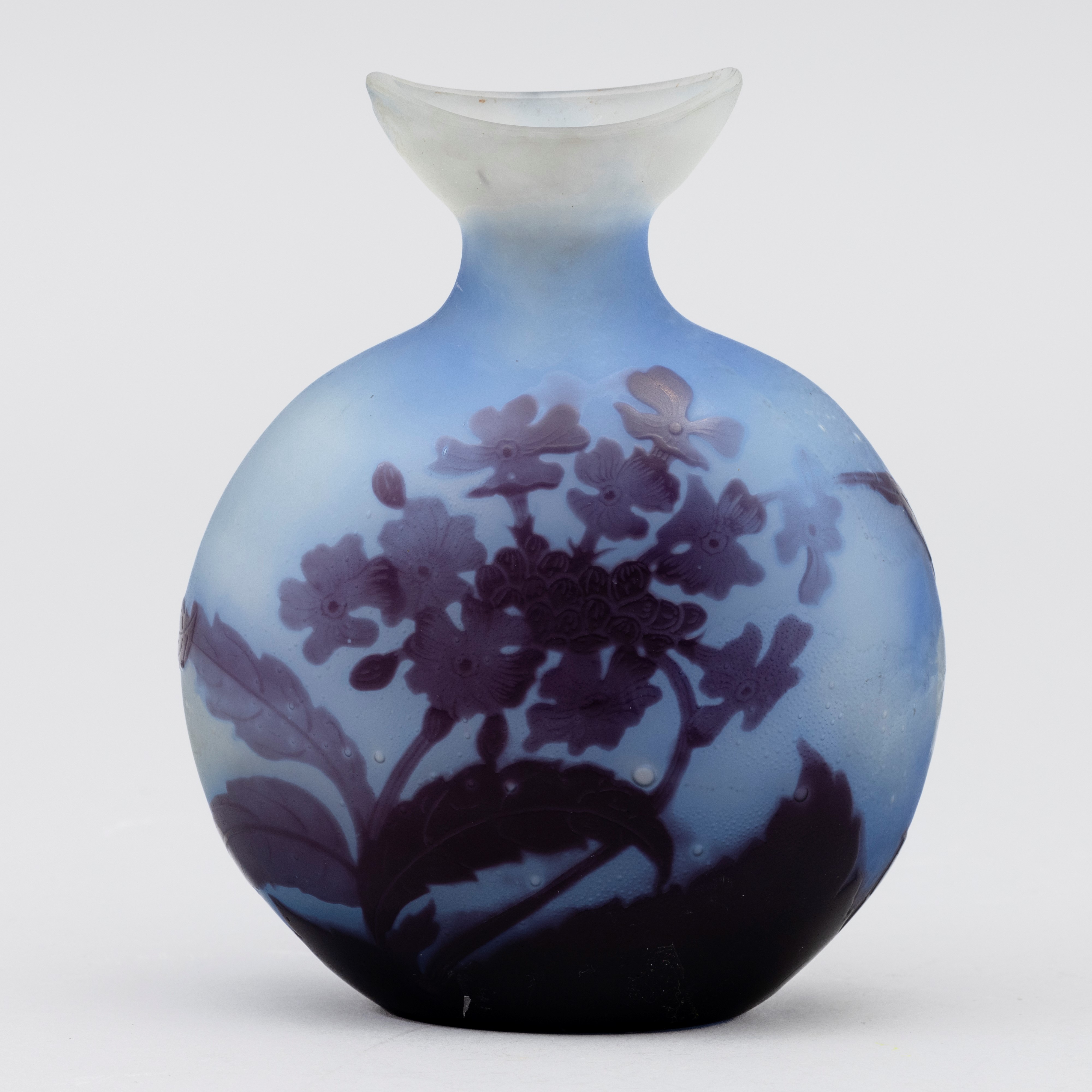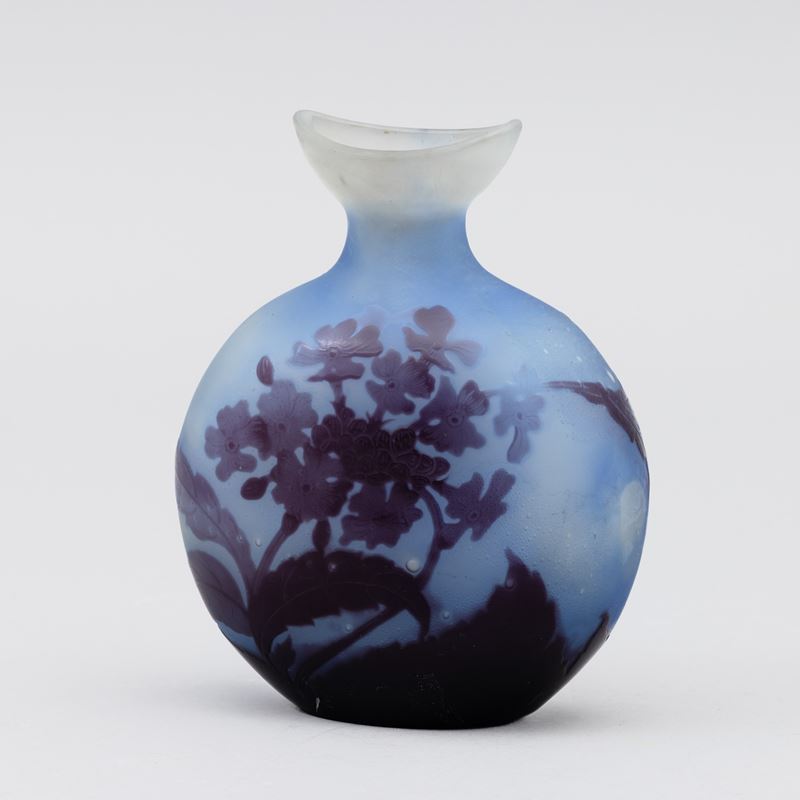 Vaso a fiasca in vetro a cammeo con decoro di primula. Bocca in forma di barchetta.