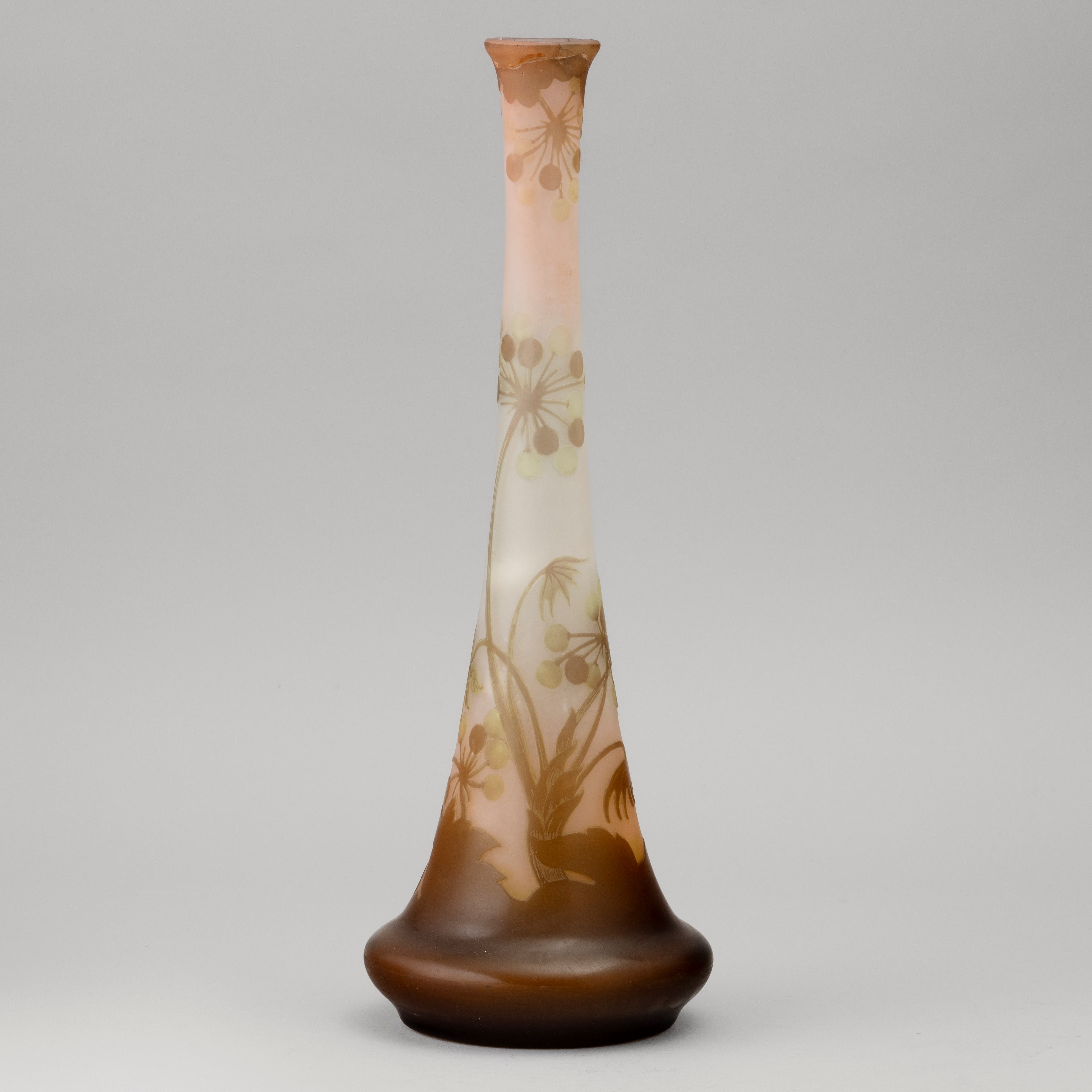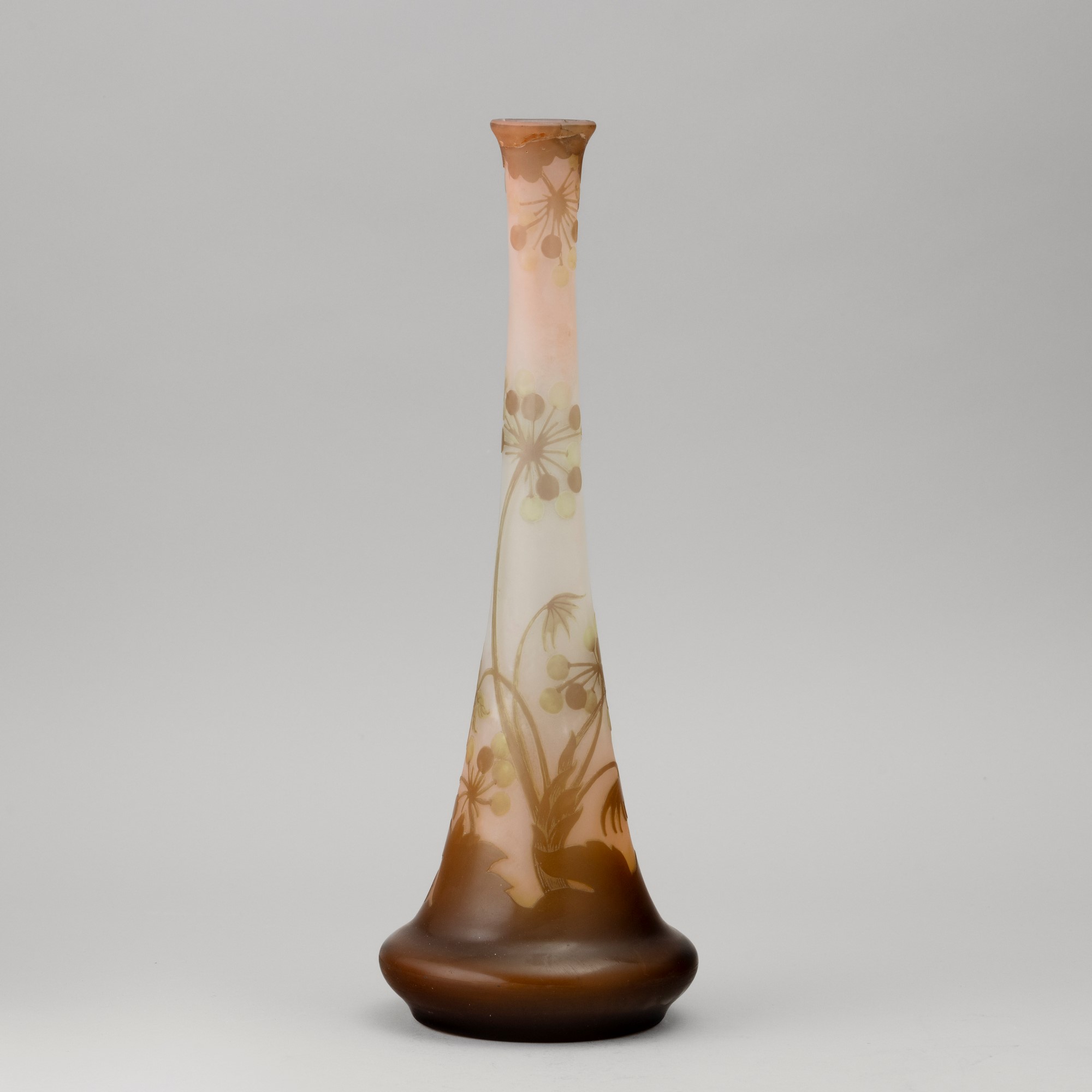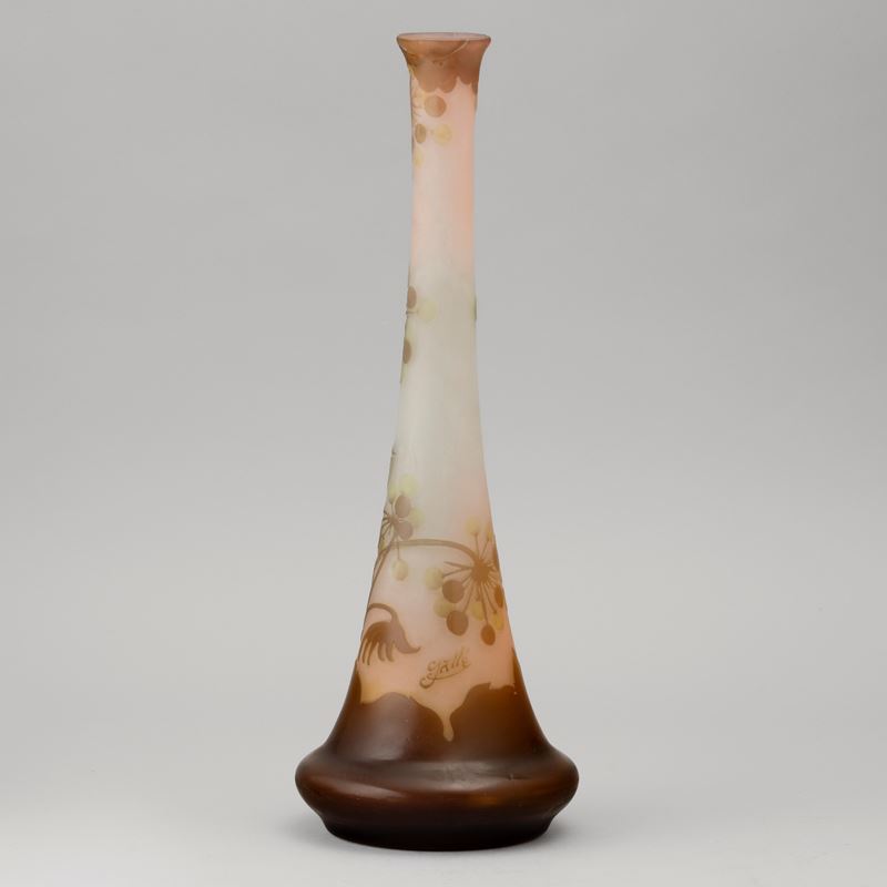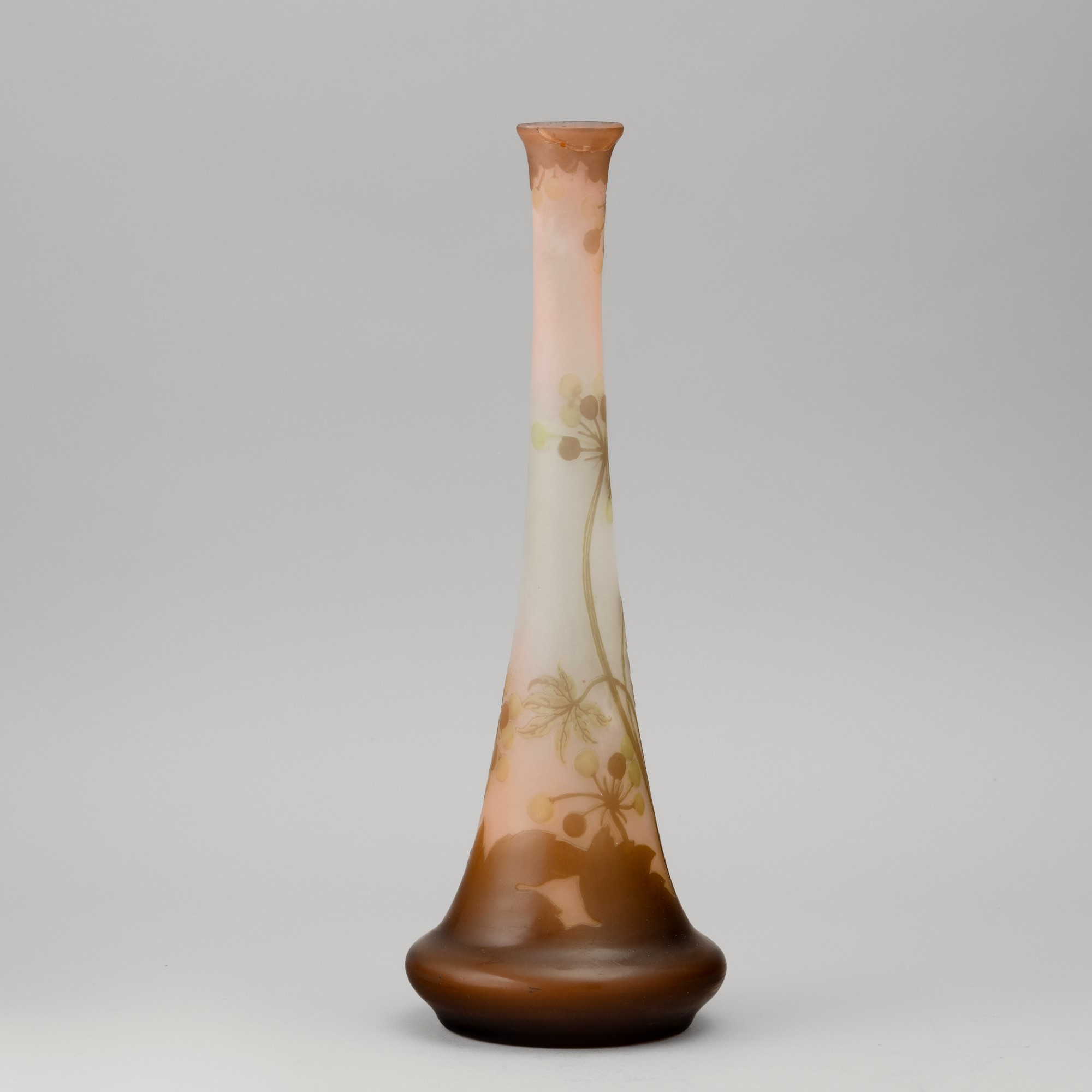Vaso a tromba in vetro a cammeo con decoro di rami con bacche.