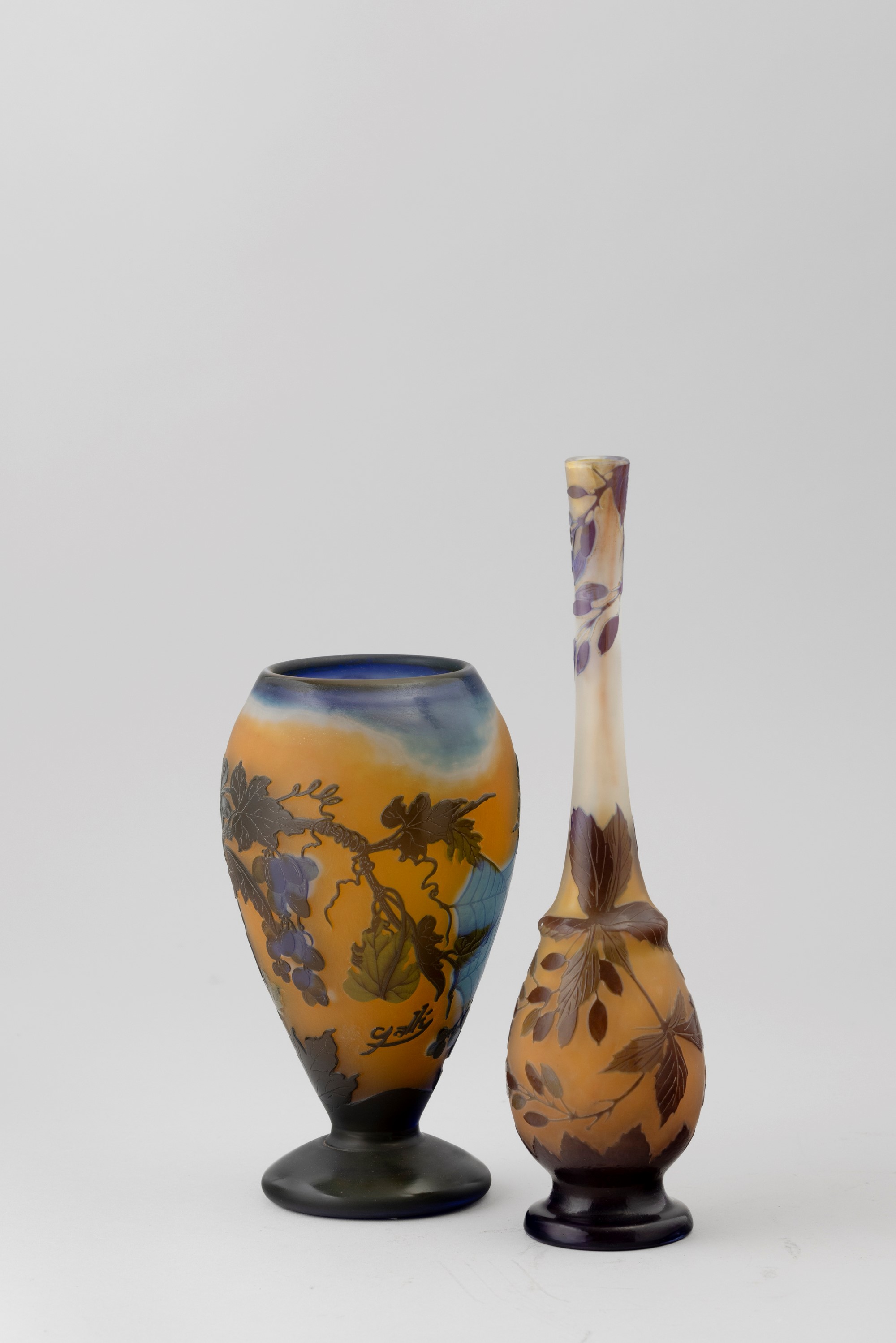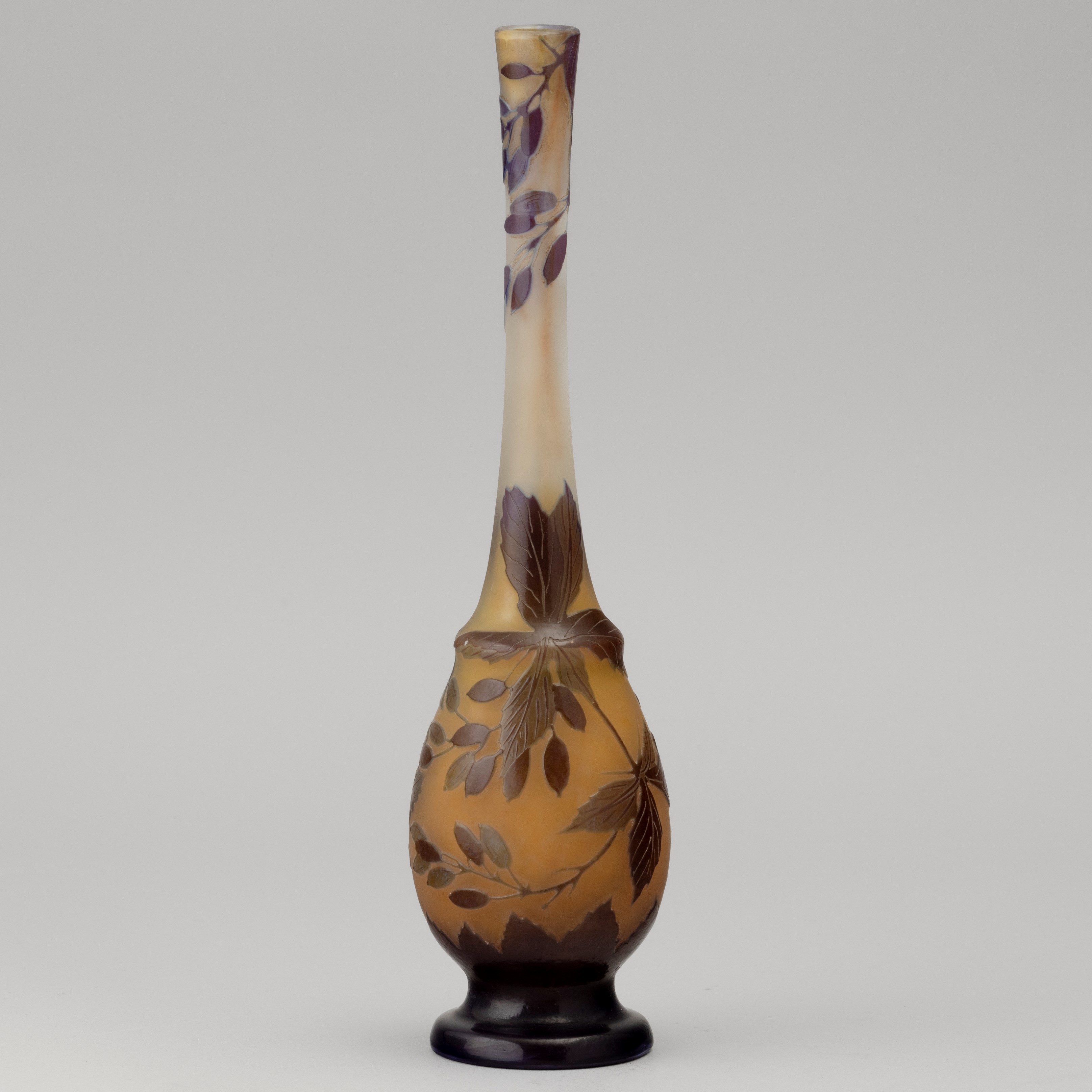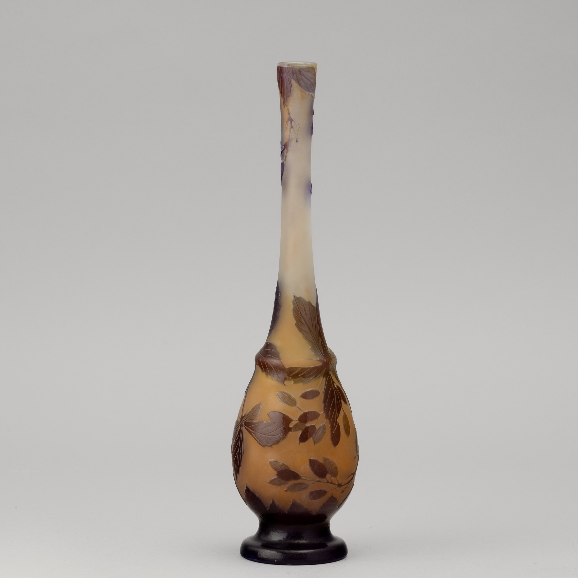 Vaso solifleur con piede a bulbo e strozzatura soffiata in vetro a cammeo con decoro floreale.
