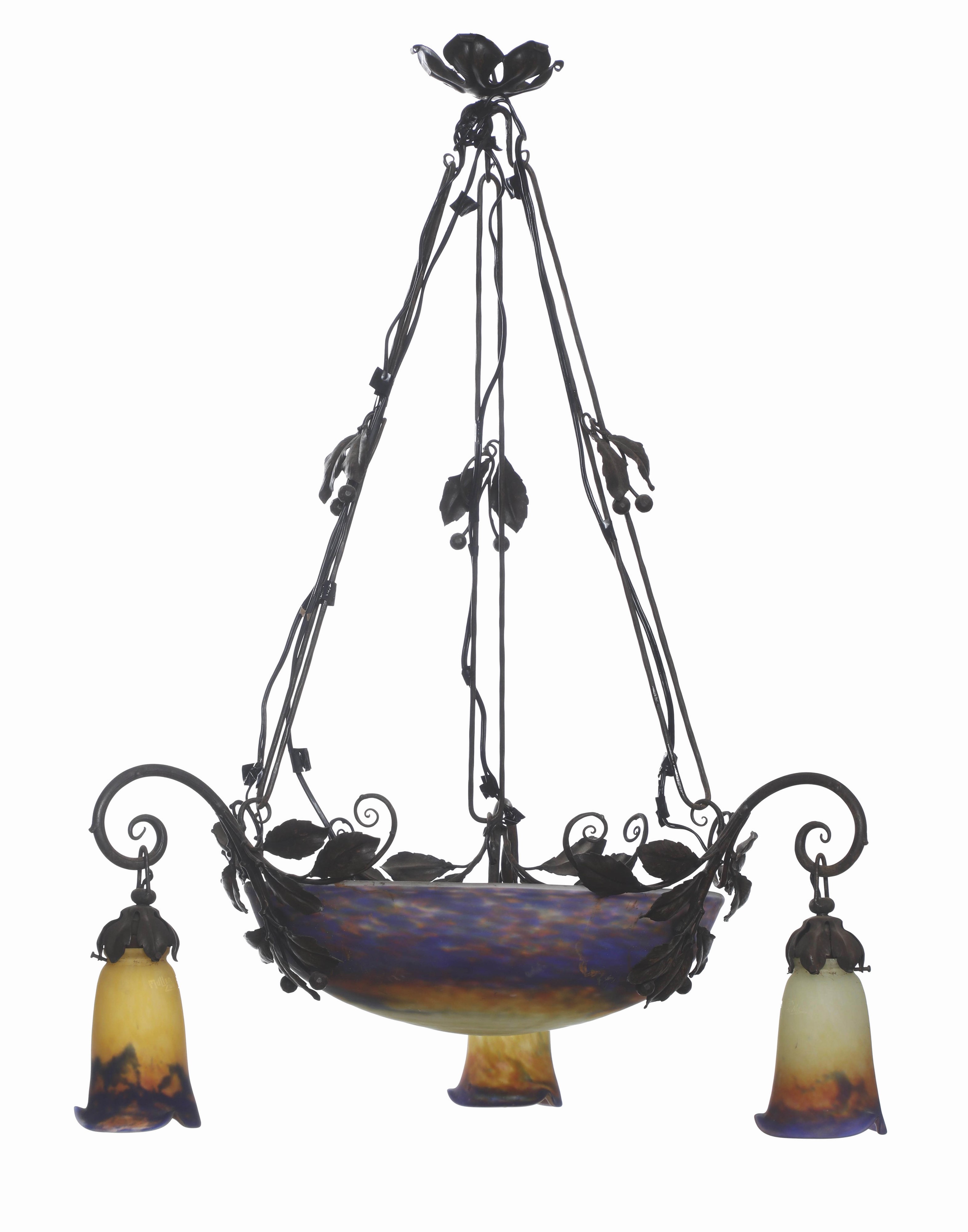 Lampadario in ferro con grande coppa e diffusori in pasta vitrea policroma.