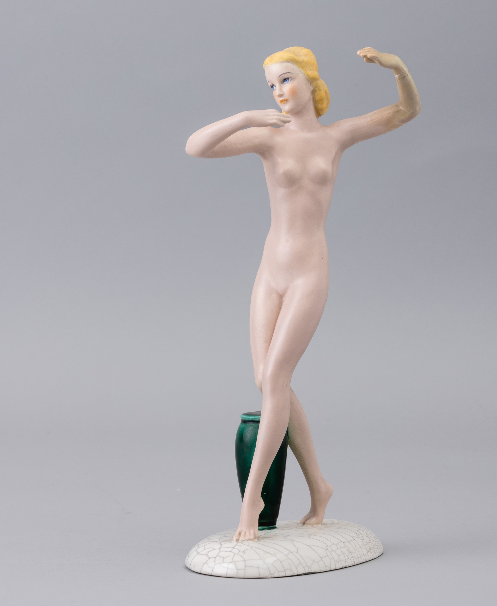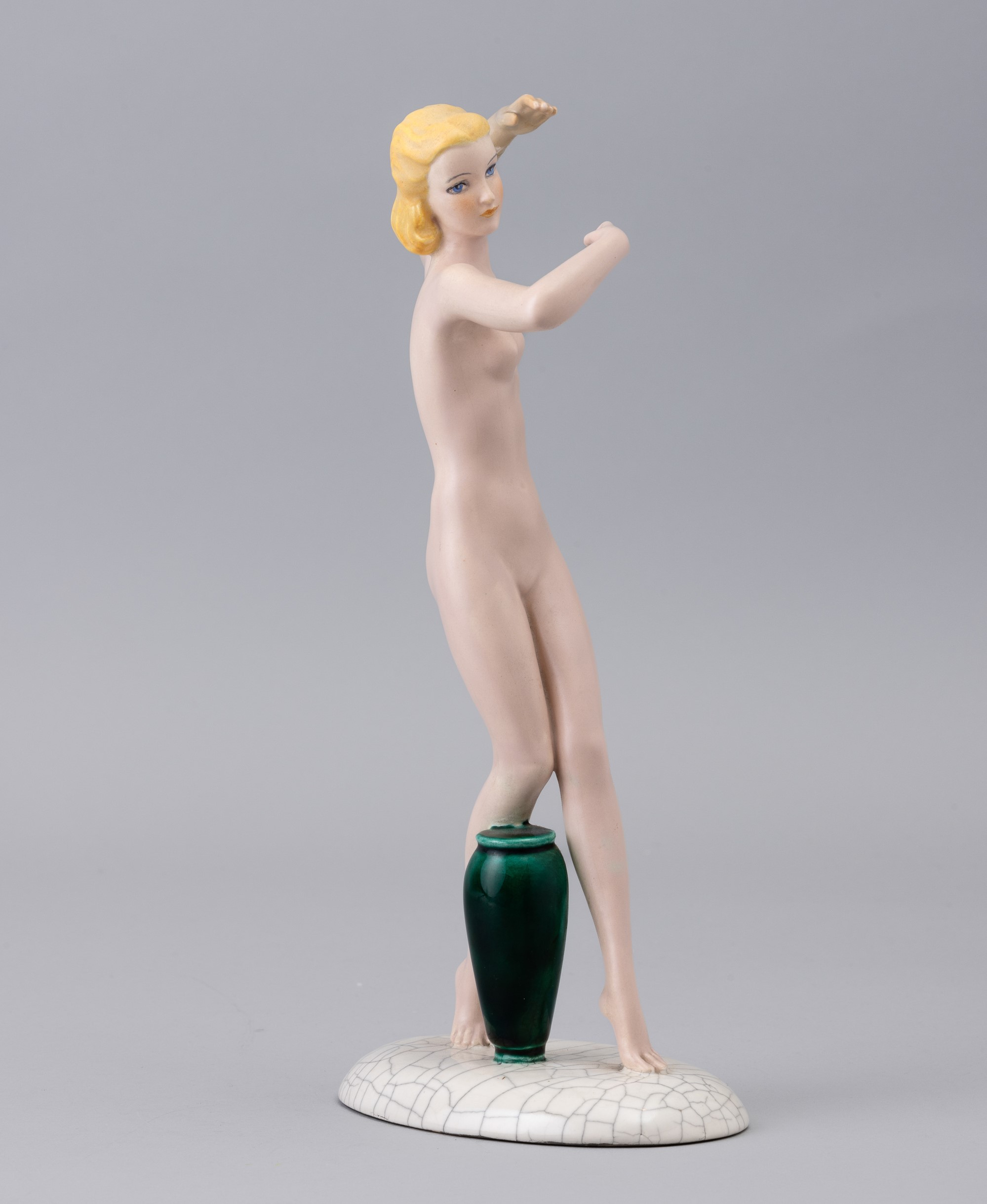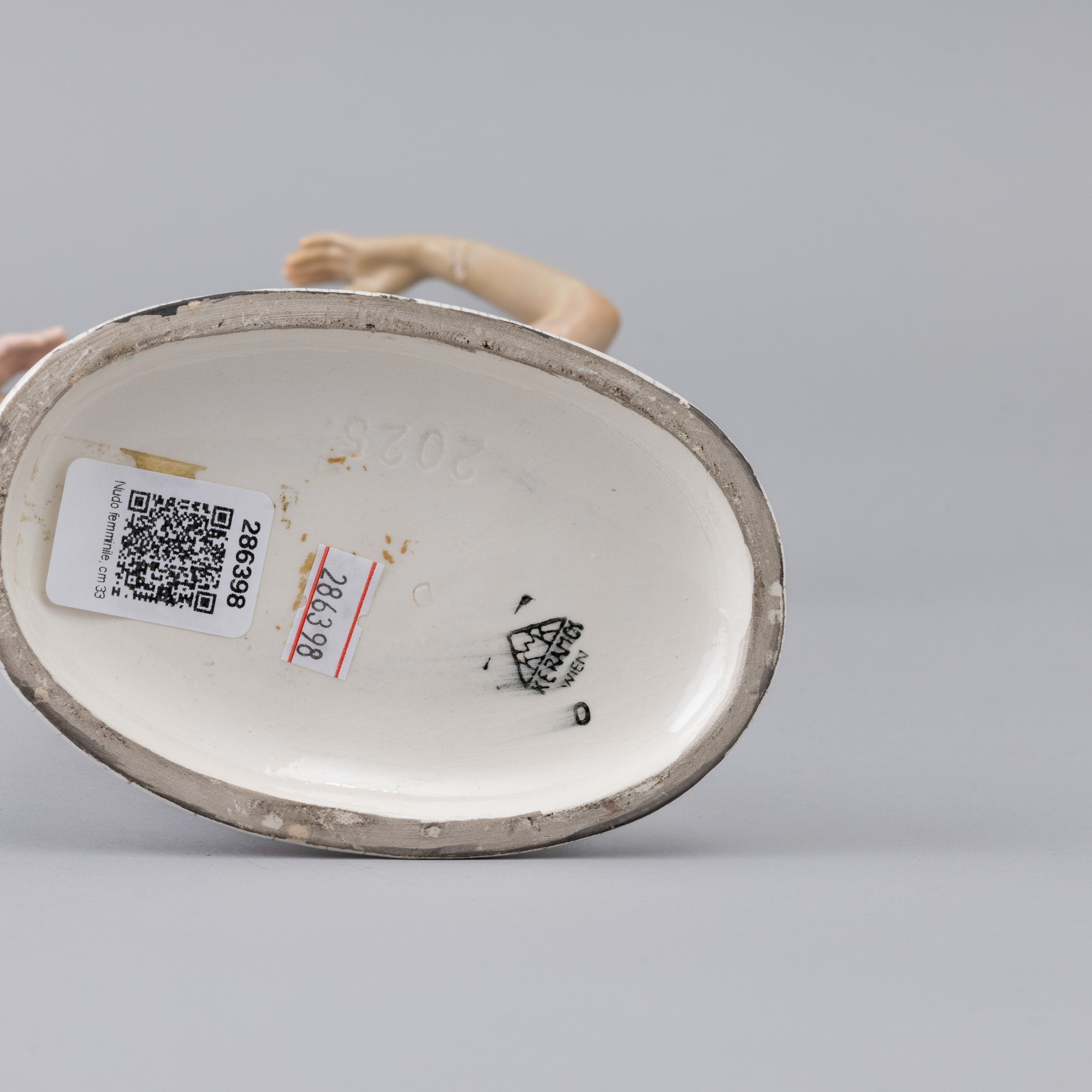 Figurina di nudo in terraglia a colaggio con decoro a smalti policromi.
