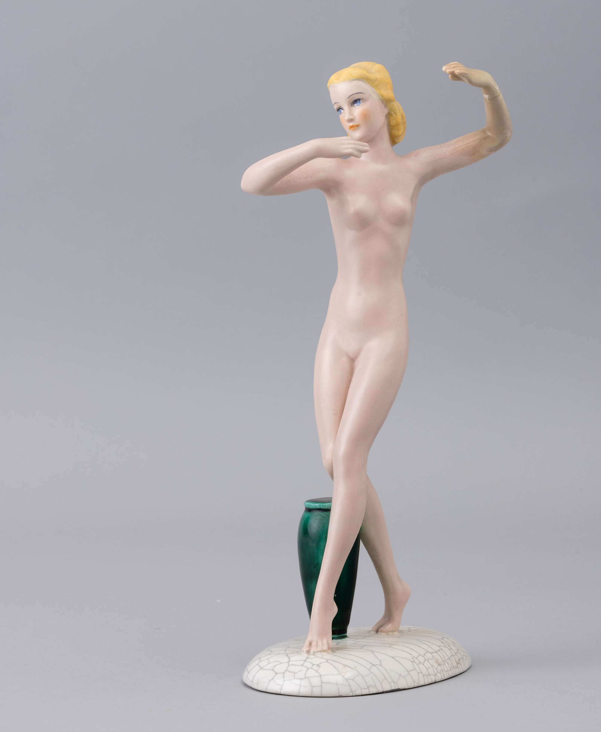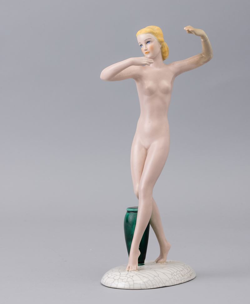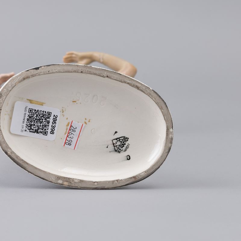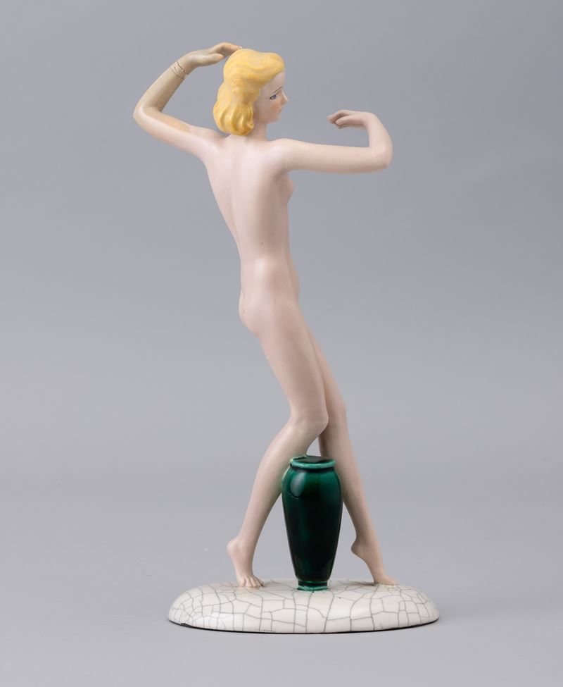 Figurina di nudo in terraglia a colaggio con decoro a smalti policromi.