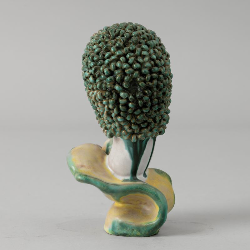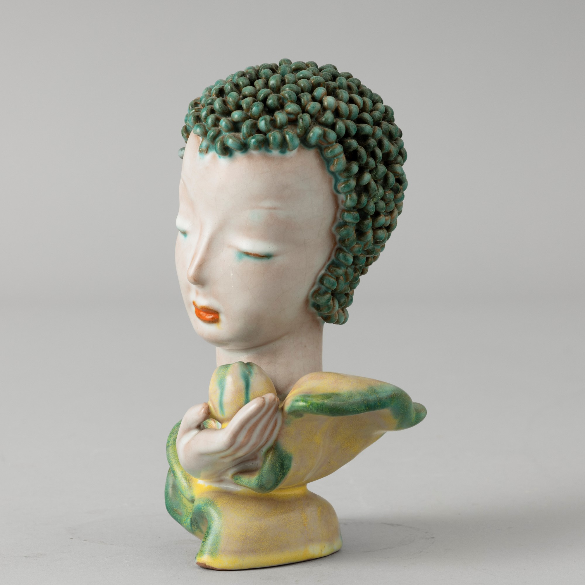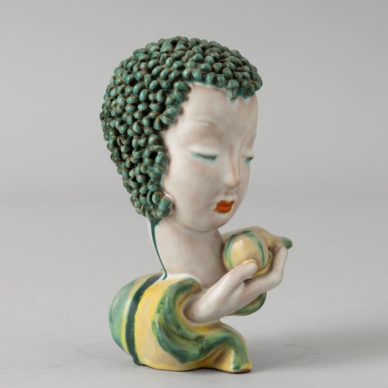 Profilo di donna che regge frutto in terracotta maiolicata con decoro a smalti policromi.