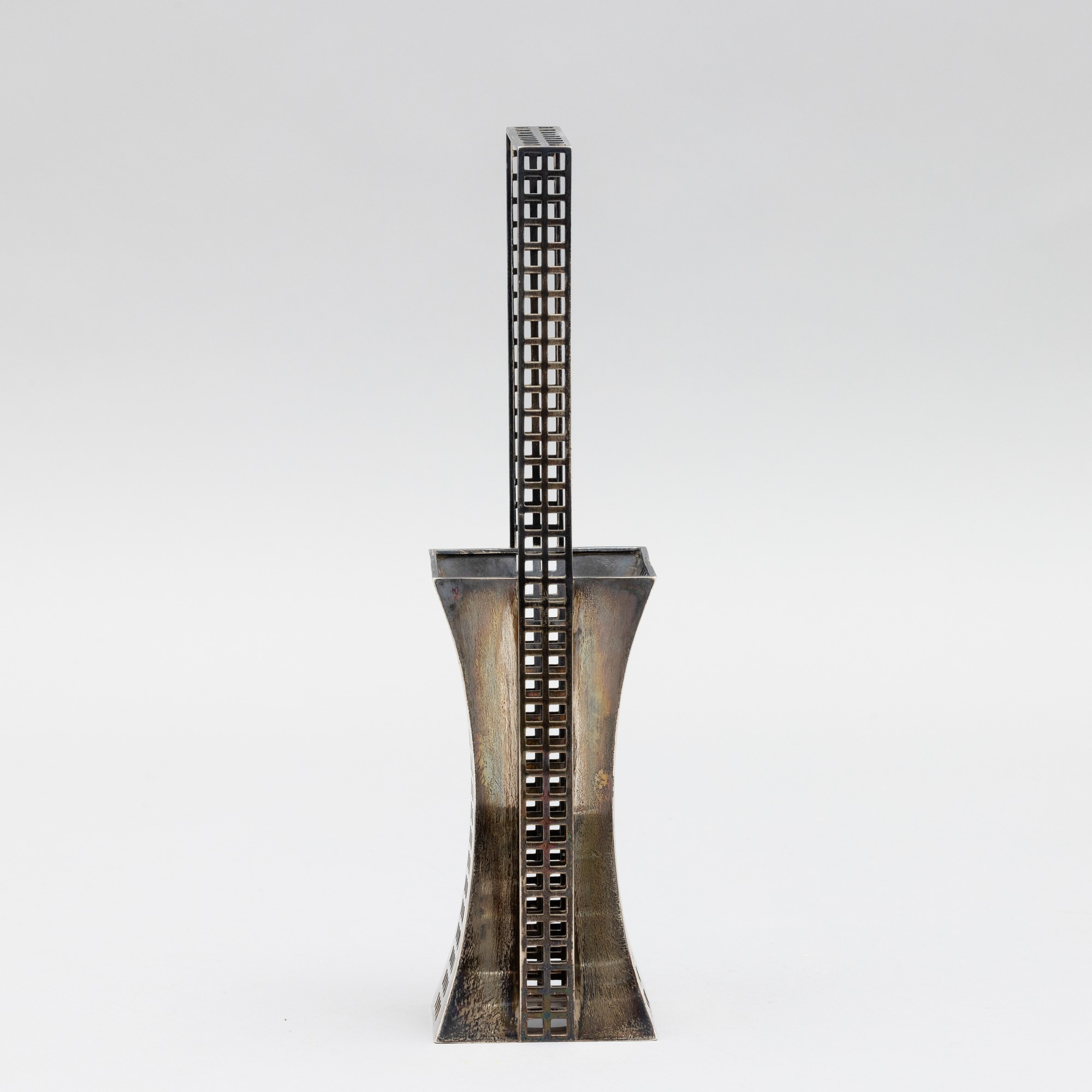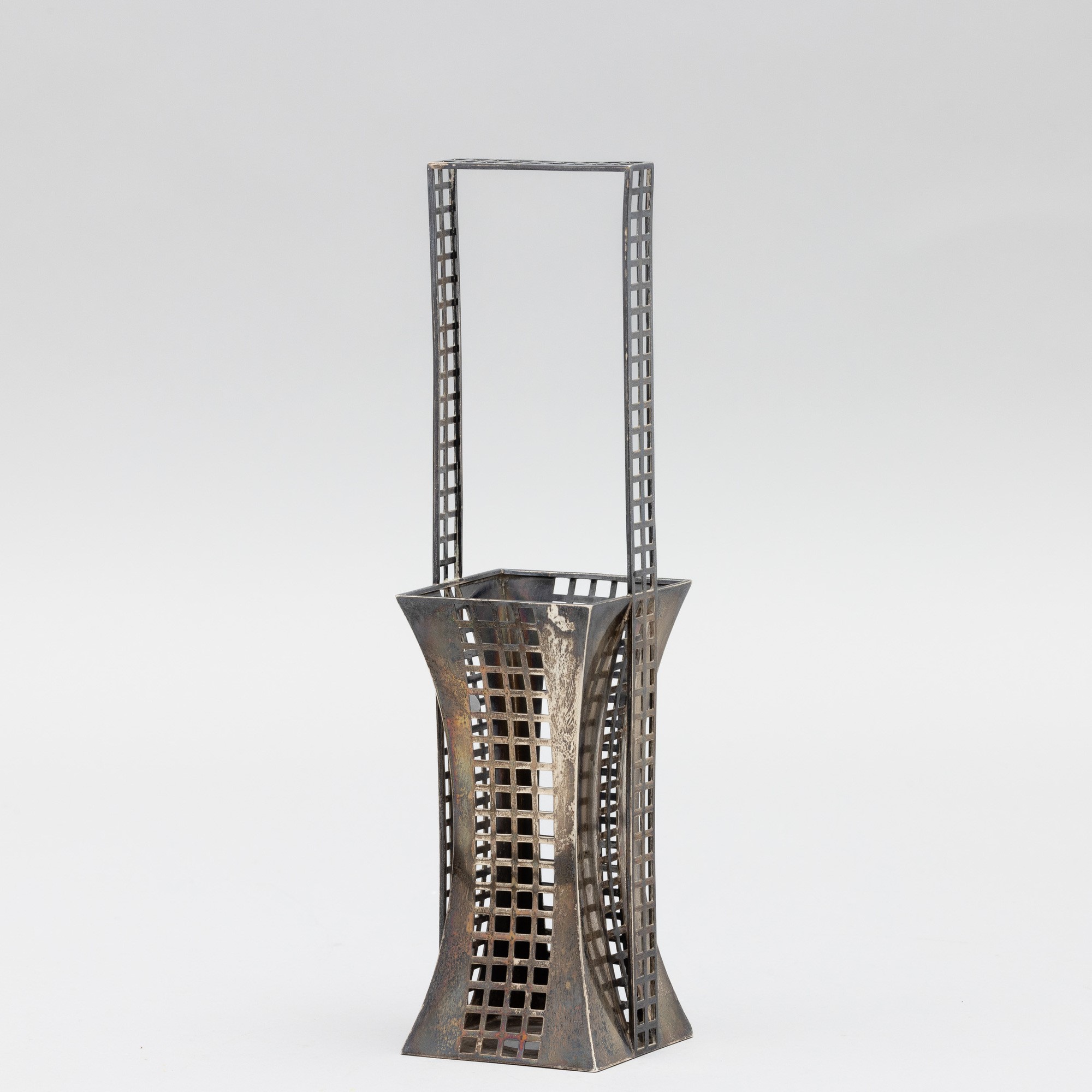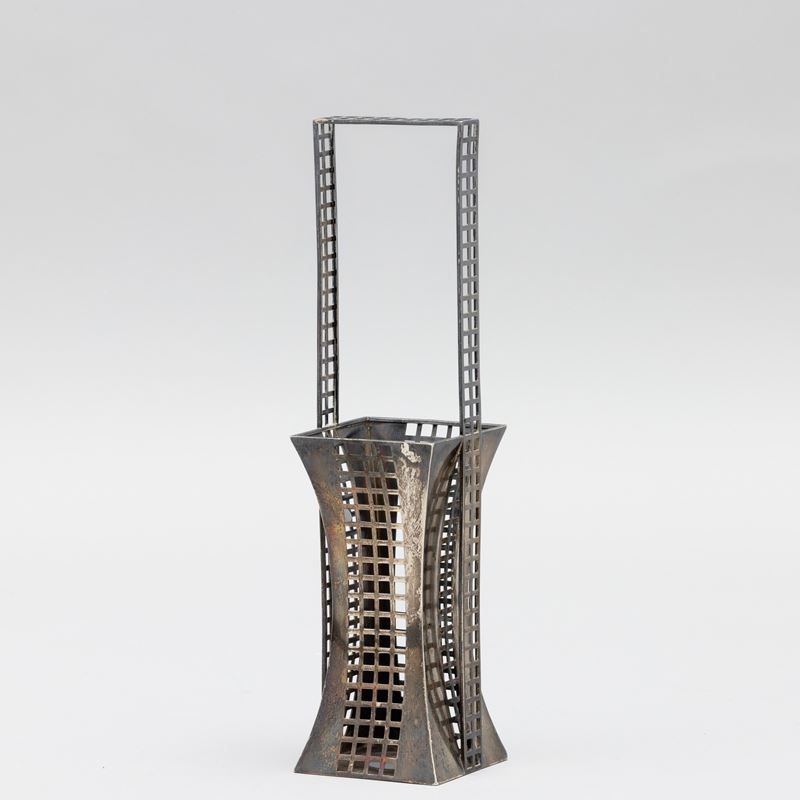 Cestino da fiori a sezione rettangolare in argento con motivo a reticolo quadrato.