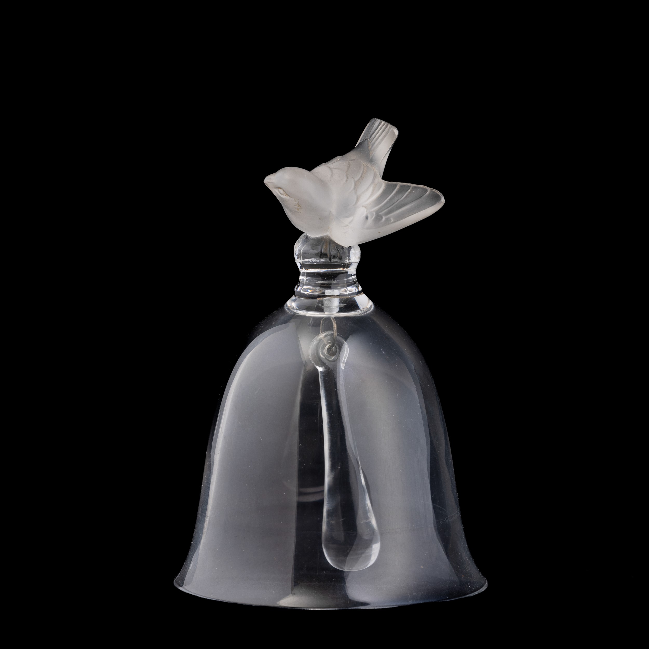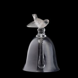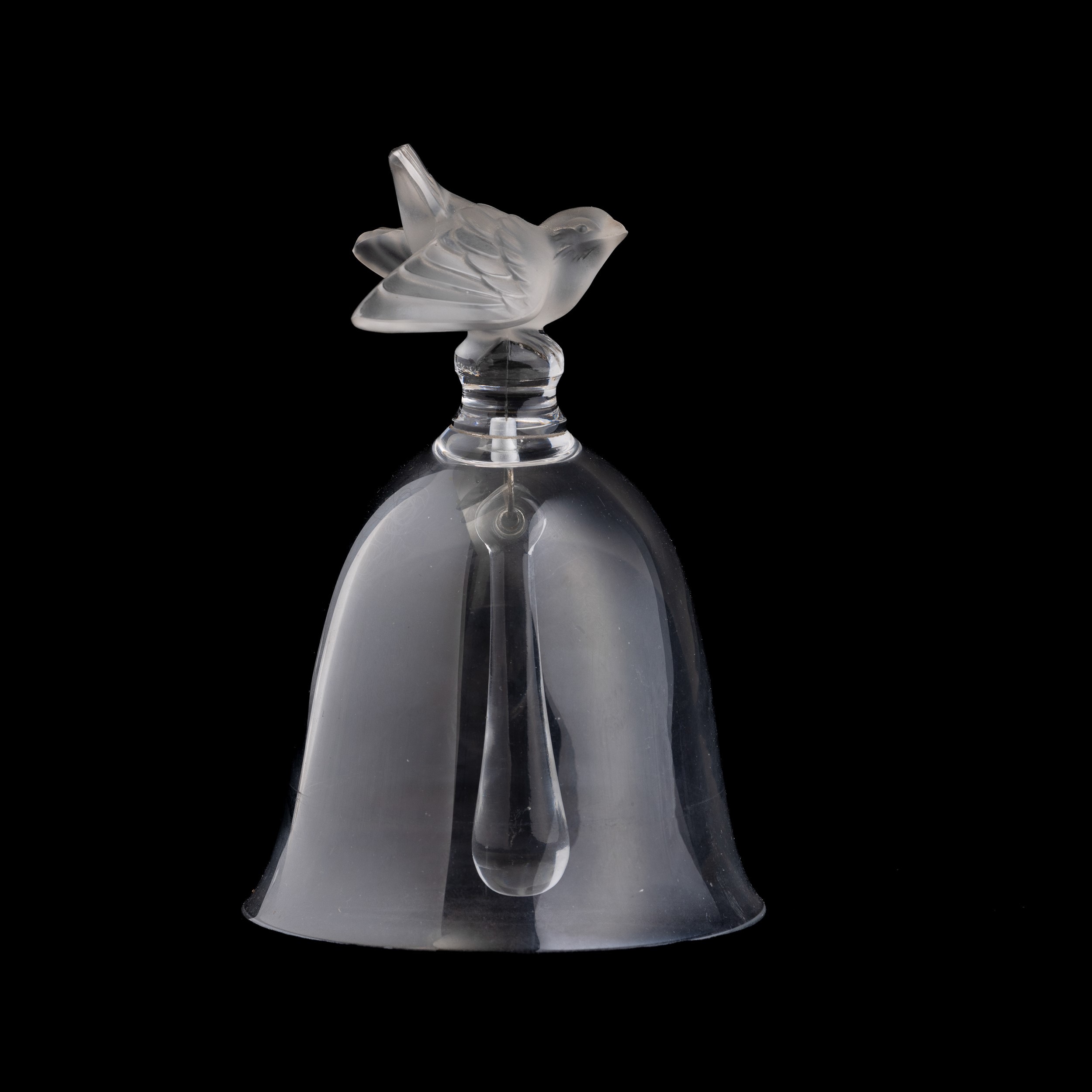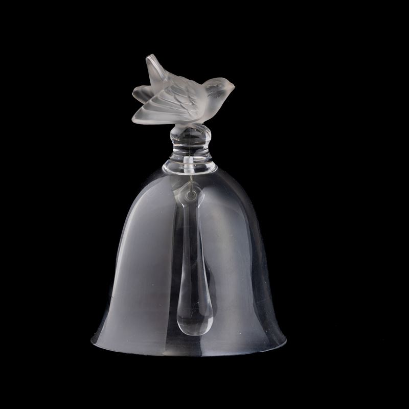 Campanella in vetro soffiato con piccola rondine in cristallo sabbiato.