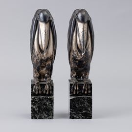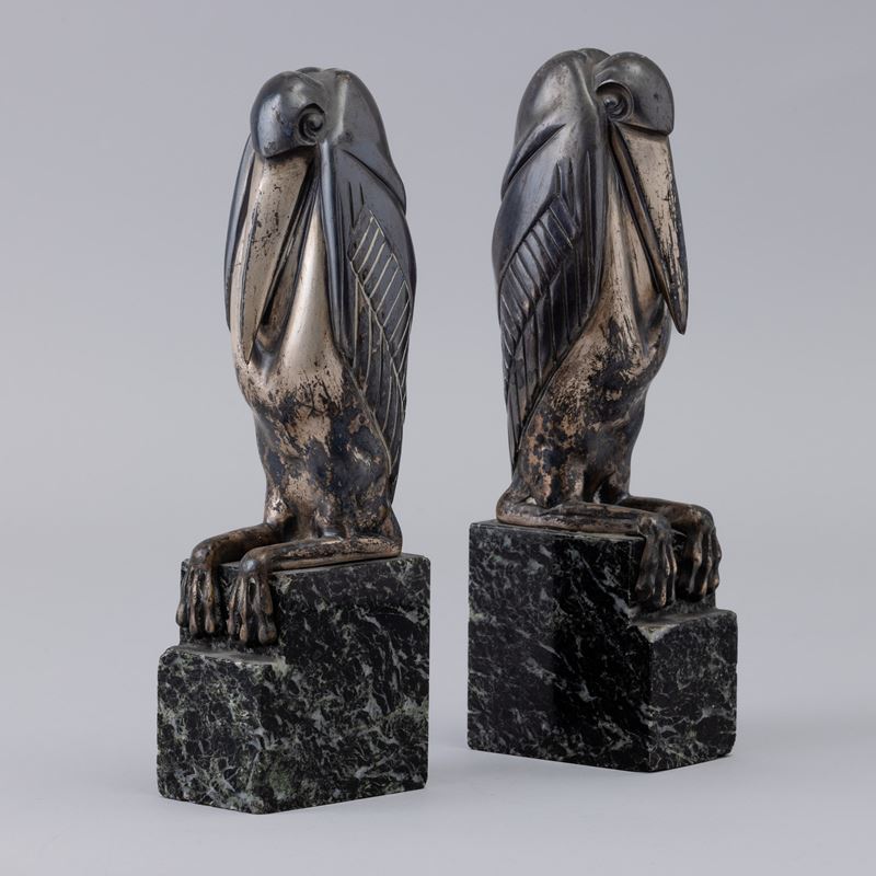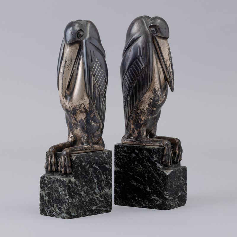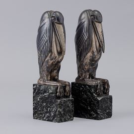 Coppia di fermalibri in forma di pellicano su base in marmo.