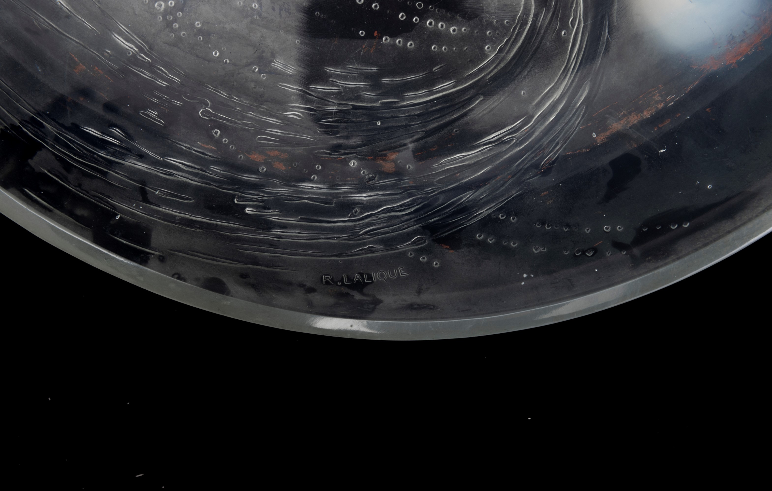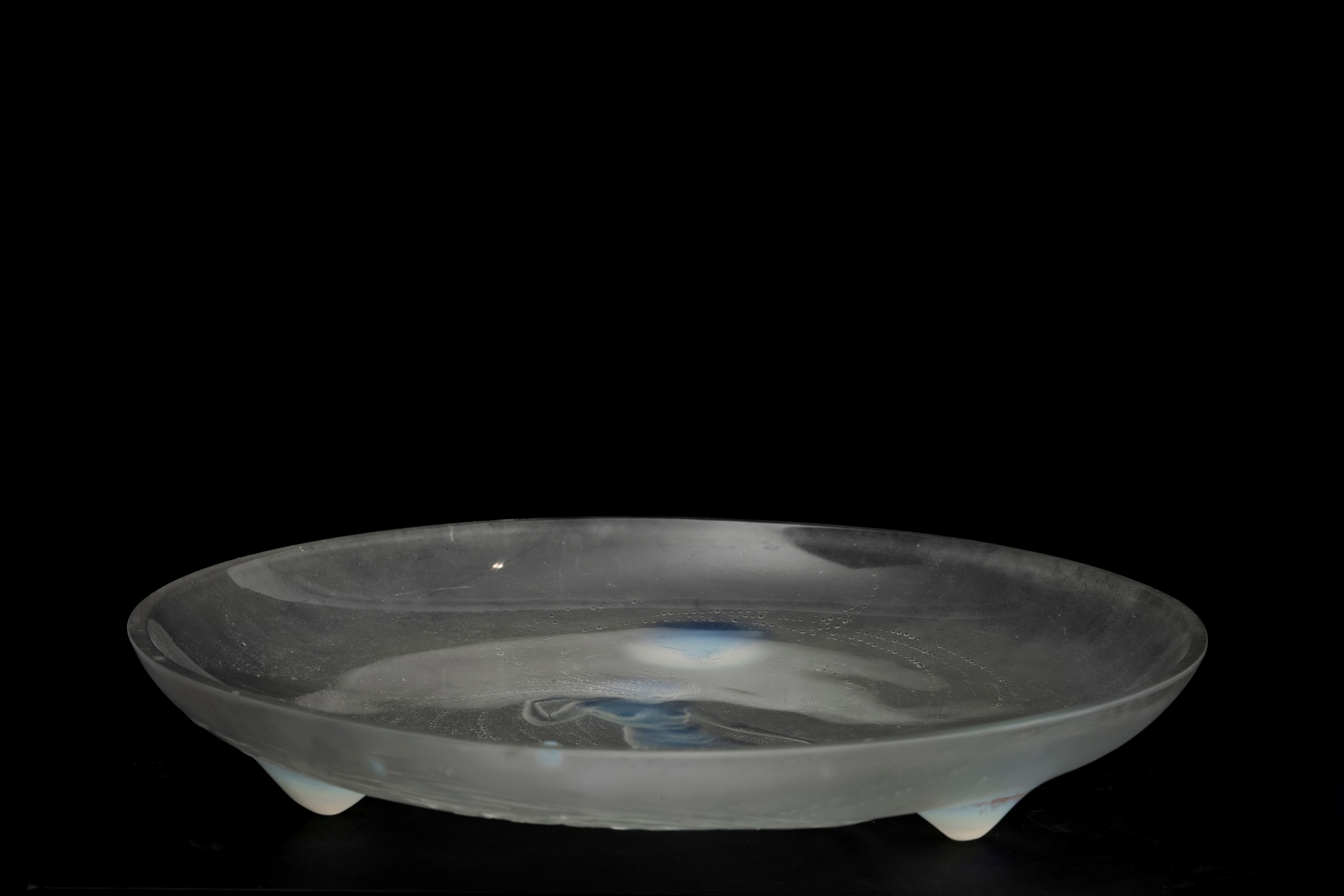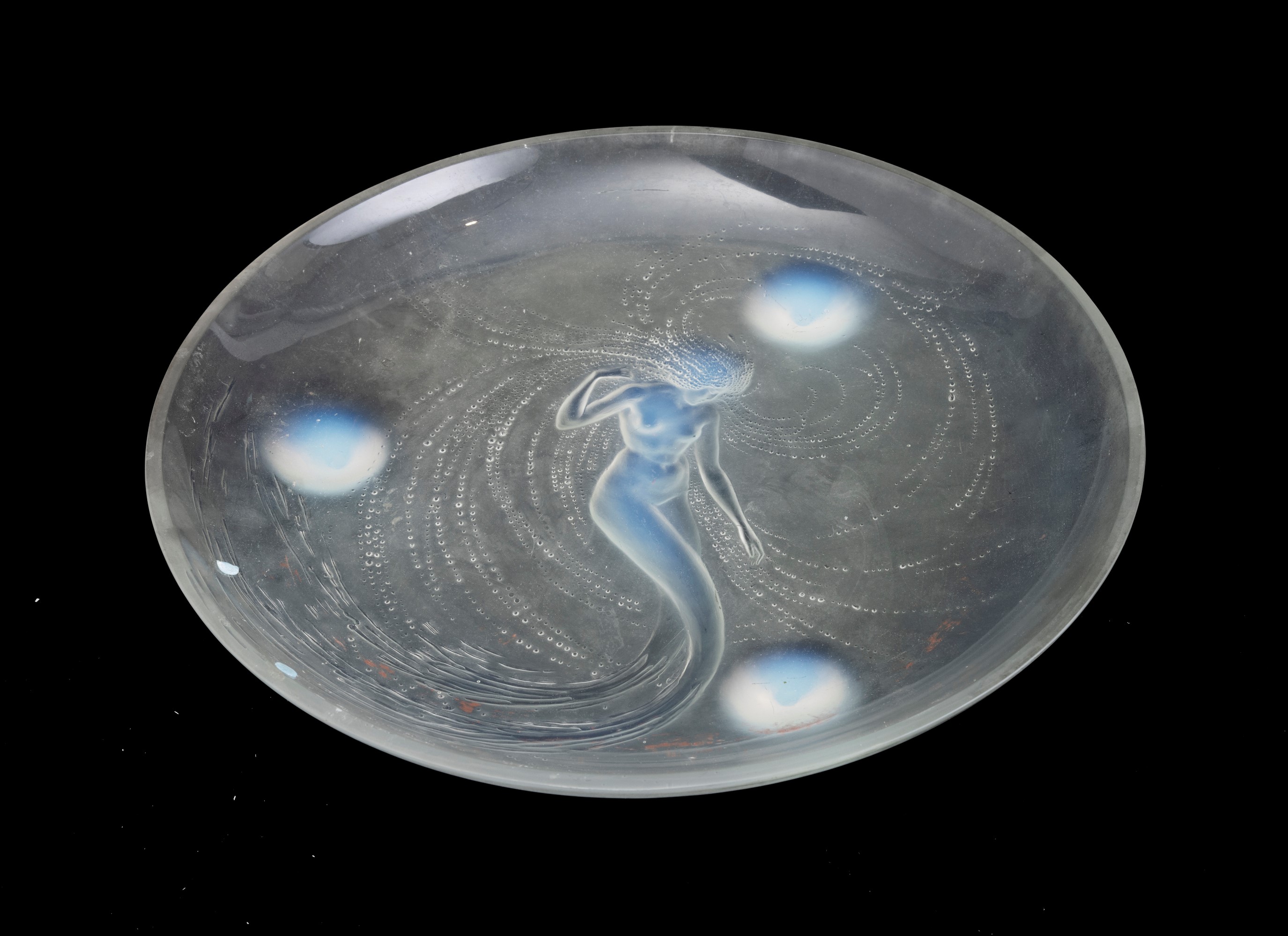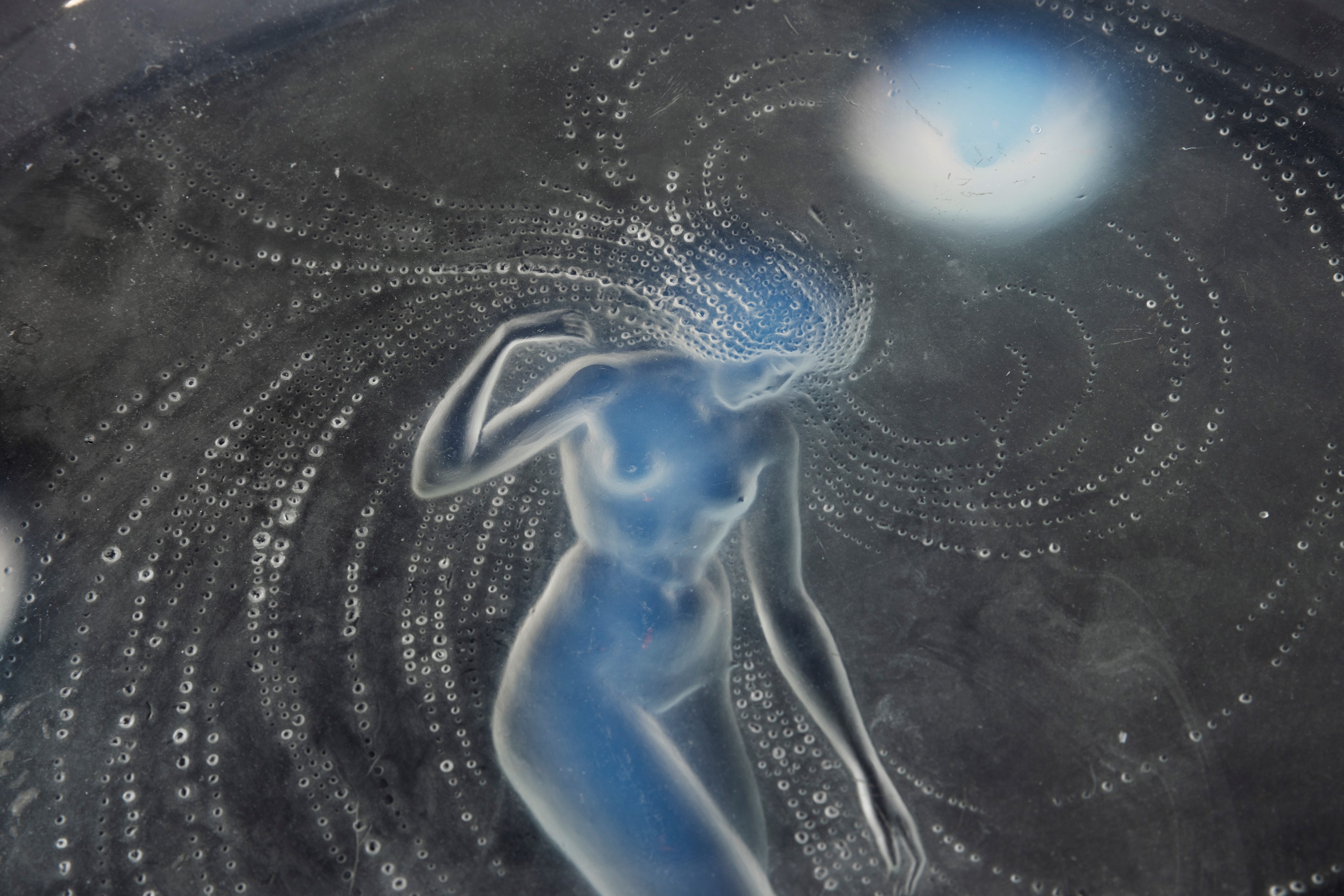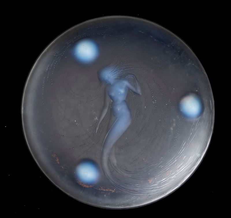 Coppa serie Sirène su piedi circolari in vetro opalescente con figura di sirena a rilievo.