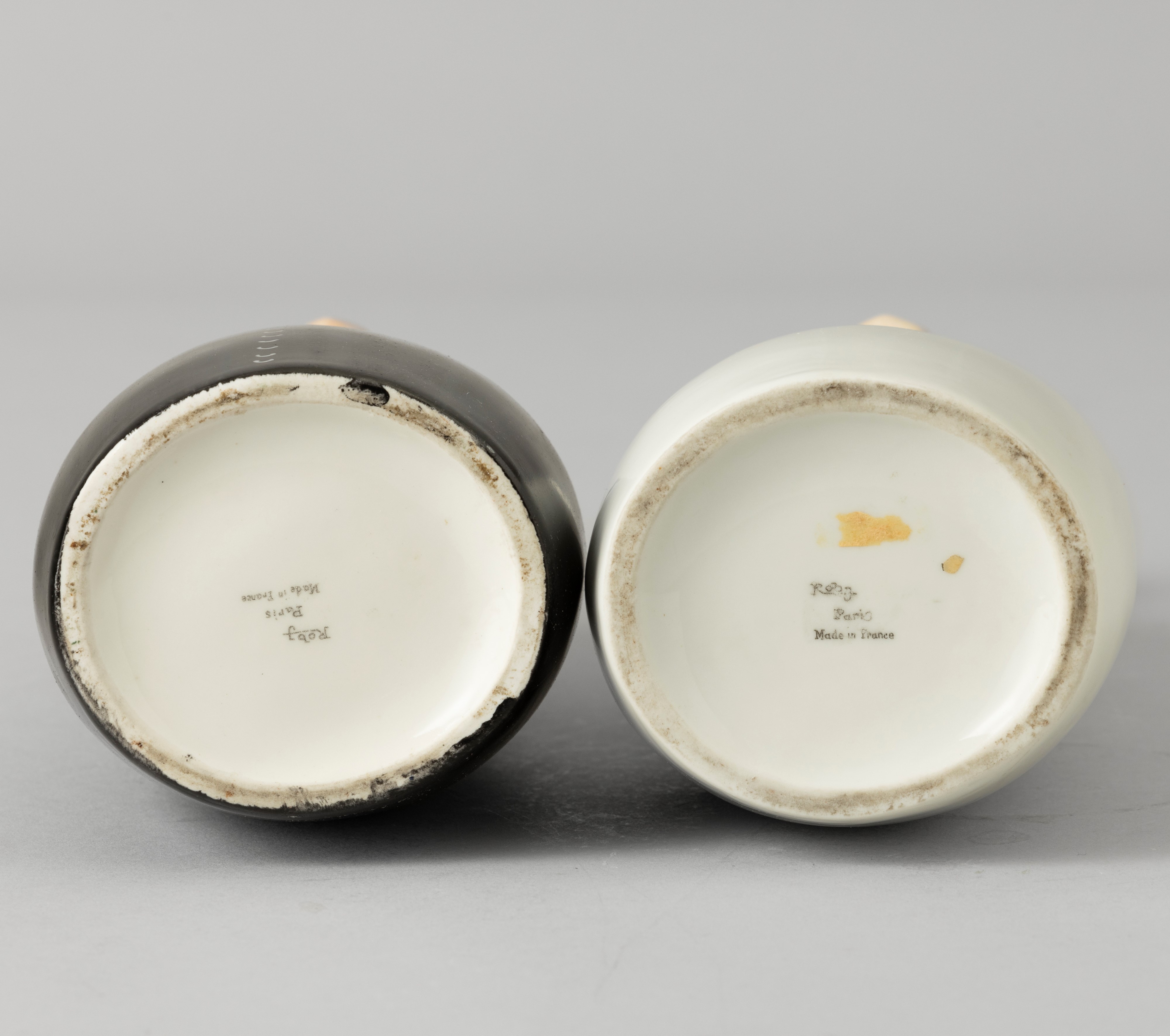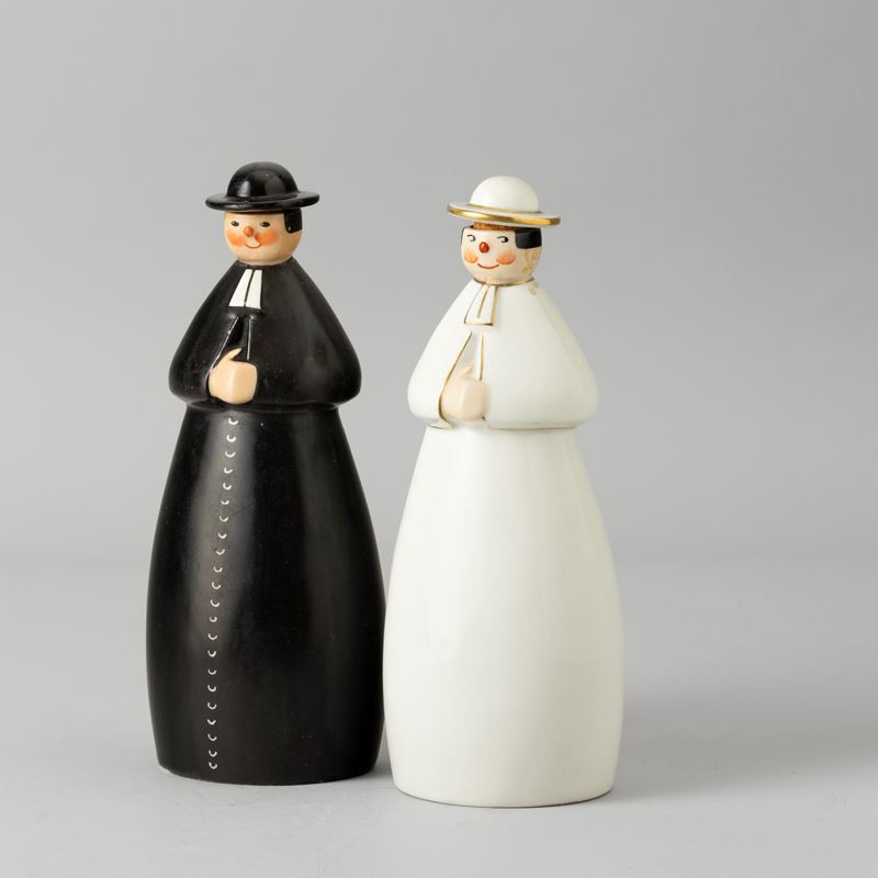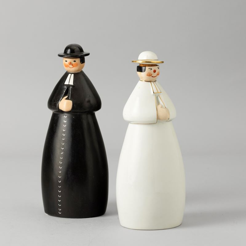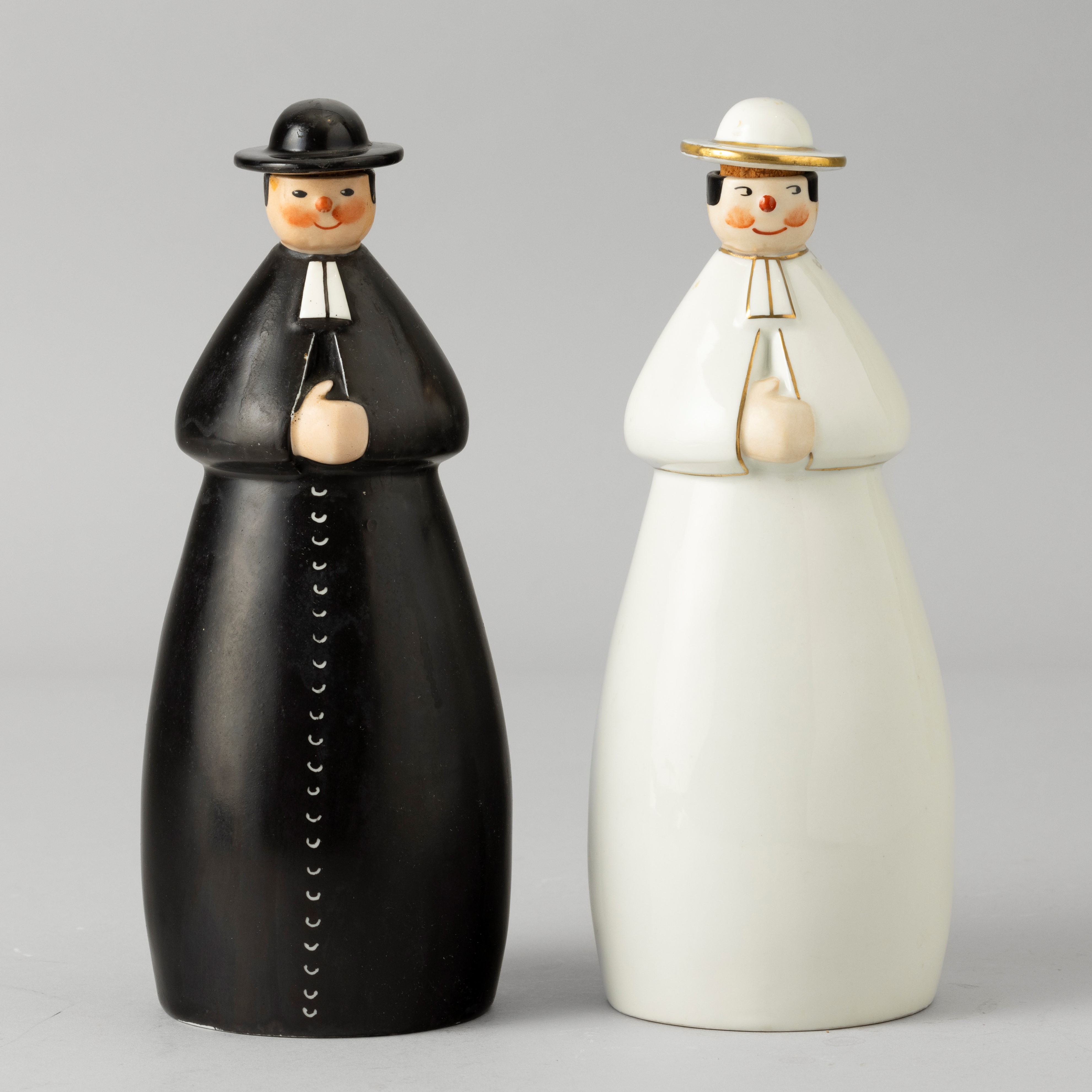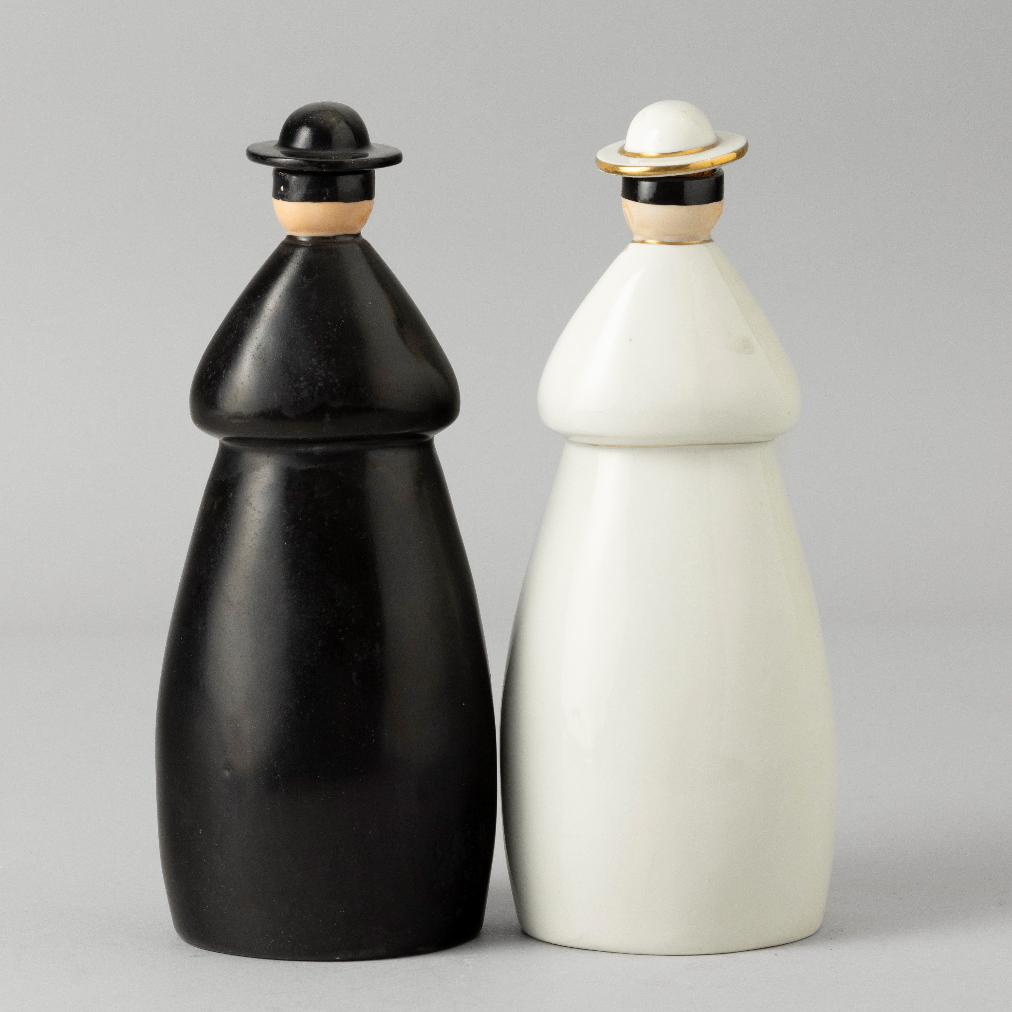 Due bottiglie con tappo vestiti in forma di parroci con cappello bianco e nero in porcellana con decoro a smalti policromi.