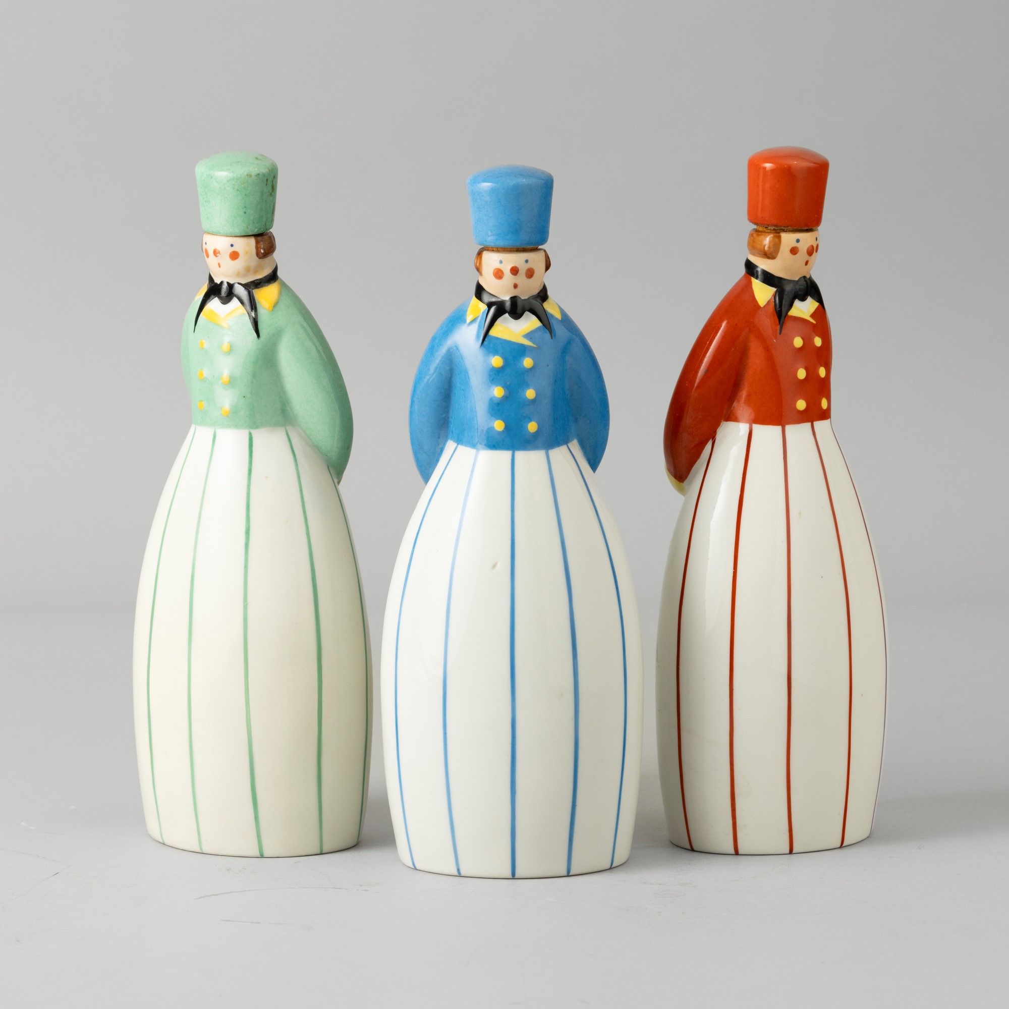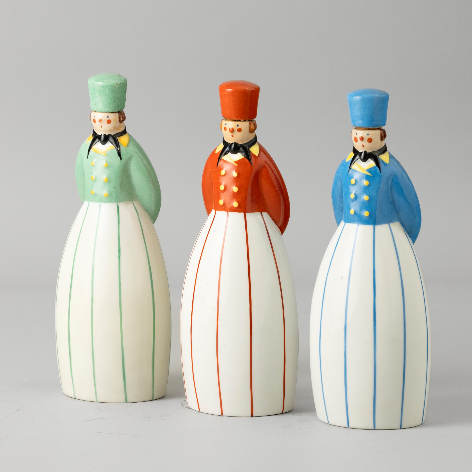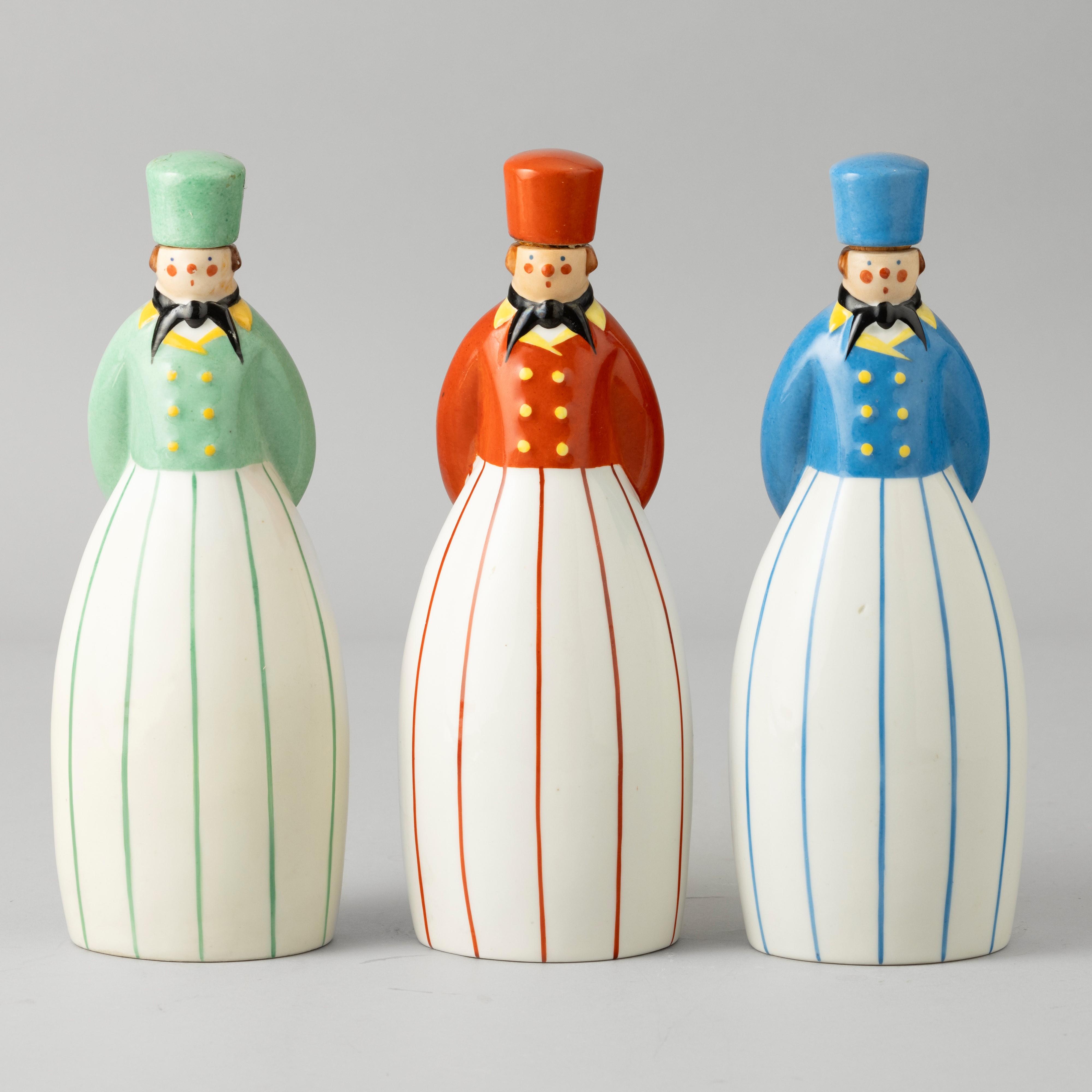 Tre bottiglie con tappo in forma di uomini in divisa con grande gonna in porcellana con decoro a smalti policromi.